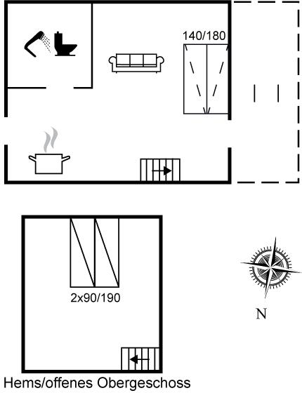 2 Schlafplätze in einem Doppelbett. 2 Schlafplätze auf einer Doppelschlafcouch. 2 von diesen Schlafplätzen befinden sich im offenen Obergeschoss.