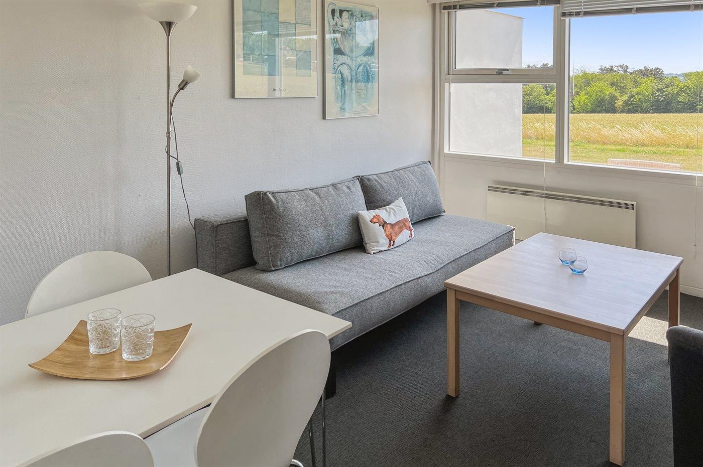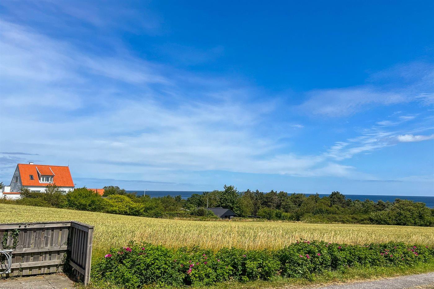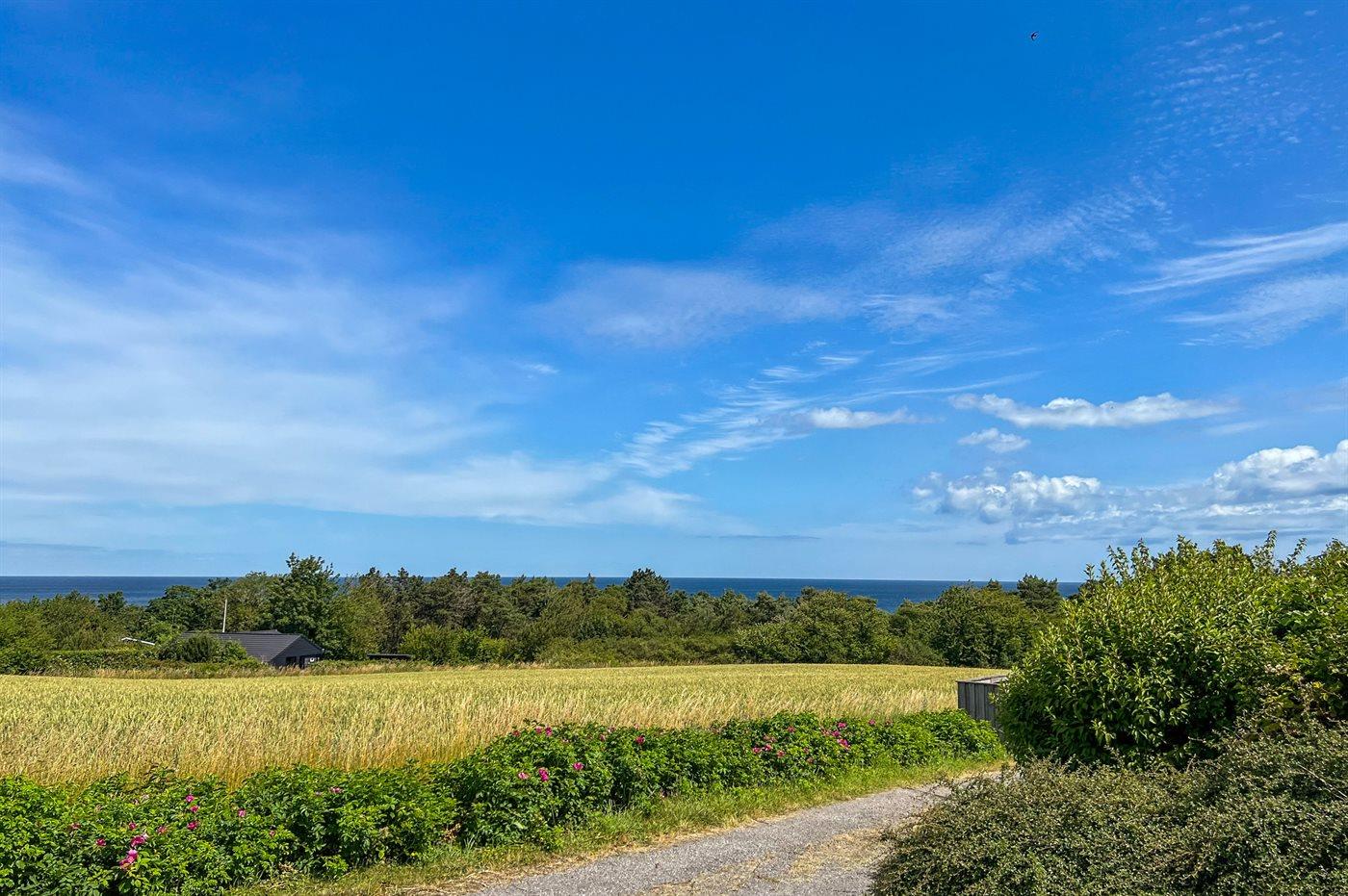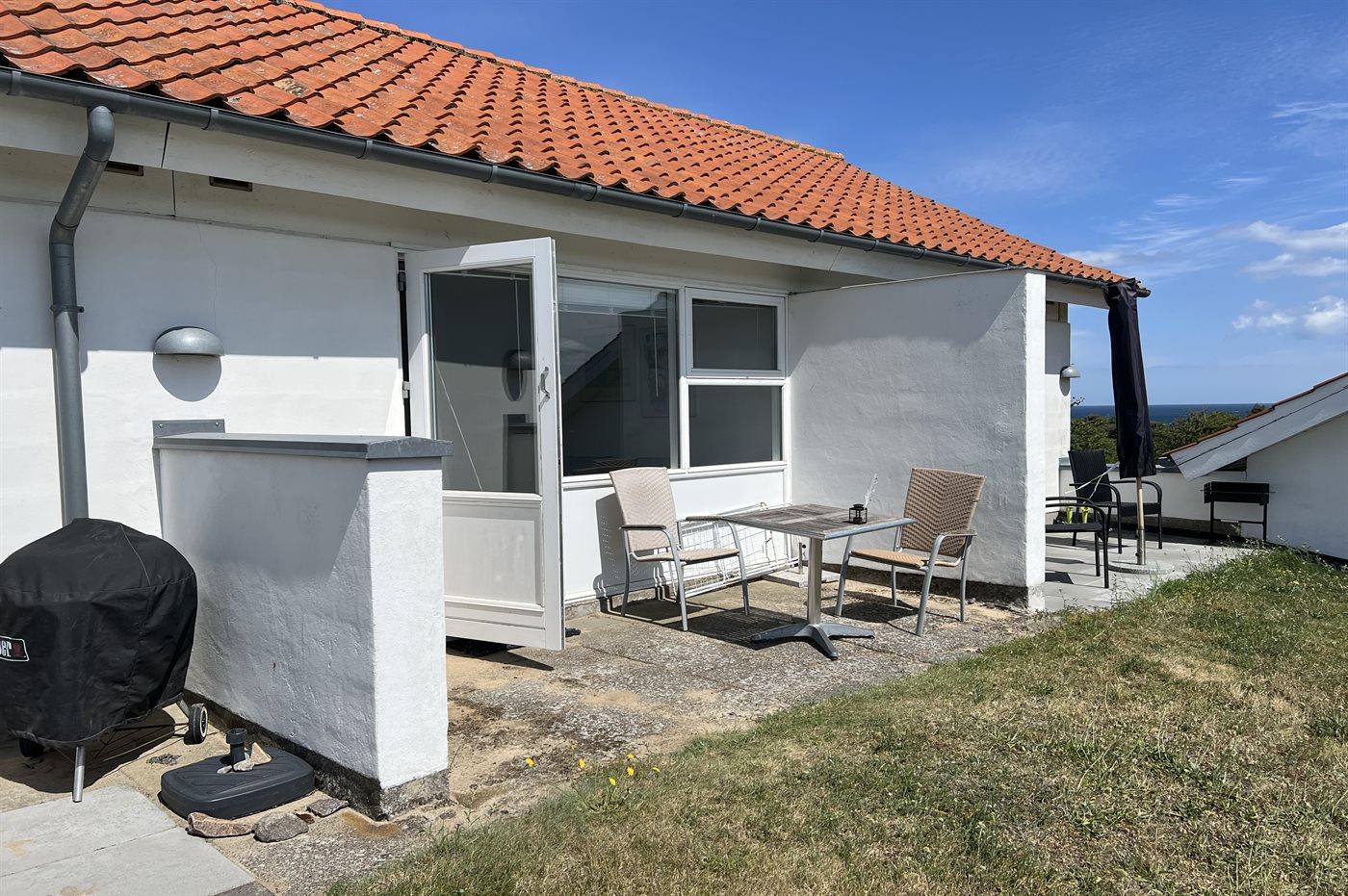 Helle Ferienwohnung gelegen mit einem wunderschönen Ausblick über Felder im hügeligen Gelände und über die Ostsee mit Christiansø in der Ferne. Die Ferienwohnung ist eingerichtet mit einem Wohnzimmer, einer kleinen Küche und einem einladenden Badezimmer. In der Küche findest du einen Kühlschrank, elektrische Kochplatten und einen Mini-Backofen. Im Wohnzimmer gibt es ein Schlafsofa für zwei Personen.