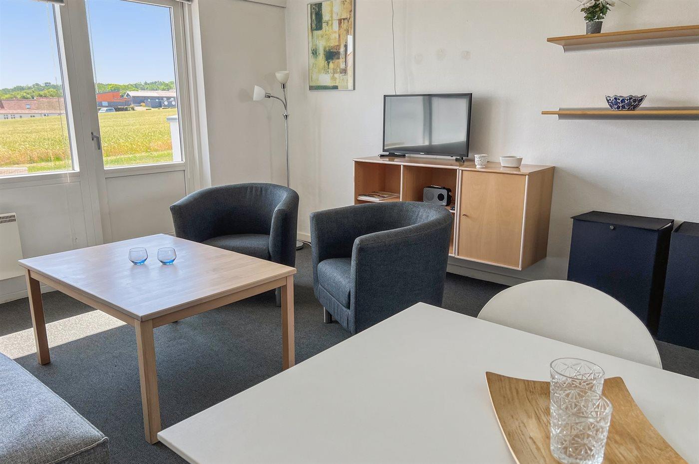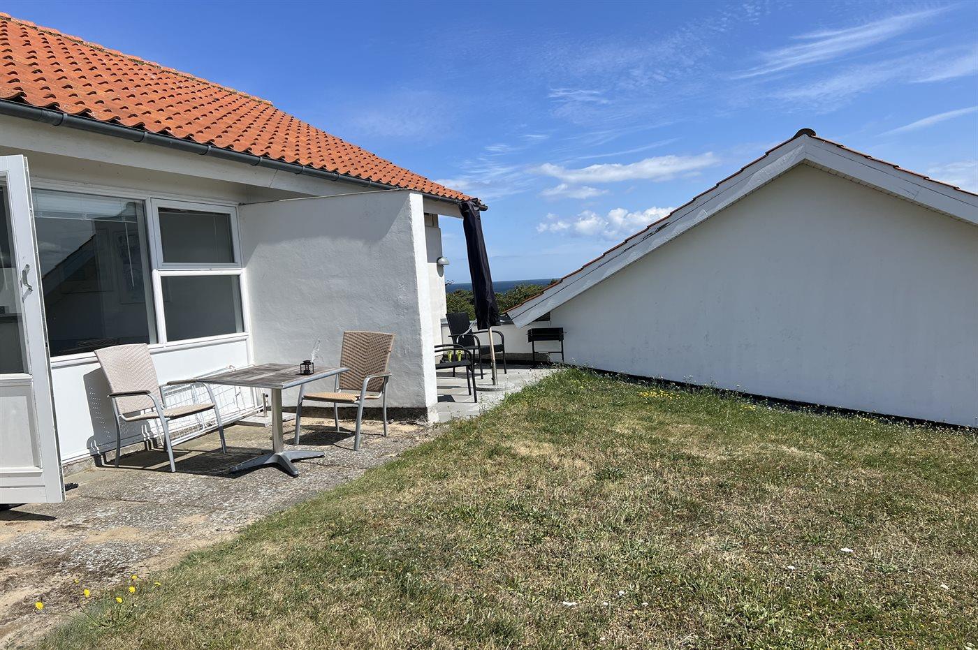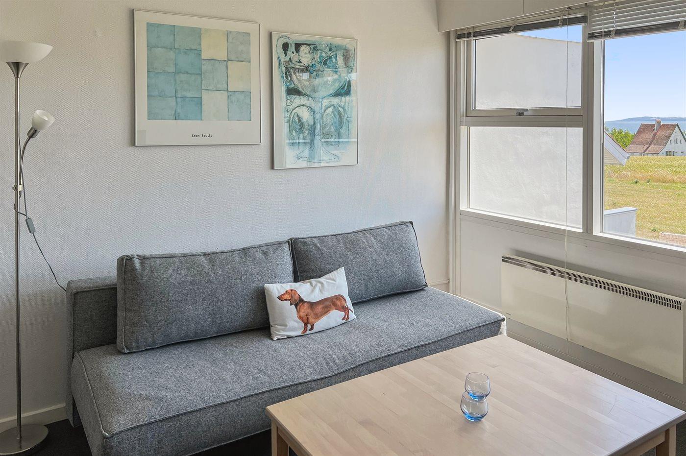 Helle Ferienwohnung gelegen mit einem wunderschönen Ausblick über Felder im hügeligen Gelände und über die Ostsee mit Christiansø in der Ferne. Die Ferienwohnung ist eingerichtet mit einem Wohnzimmer, einer kleinen Küche und einem einladenden Badezimmer. In der Küche findest du einen Kühlschrank, elektrische Kochplatten und einen Mini-Backofen. Im Wohnzimmer gibt es ein Schlafsofa für zwei Personen.