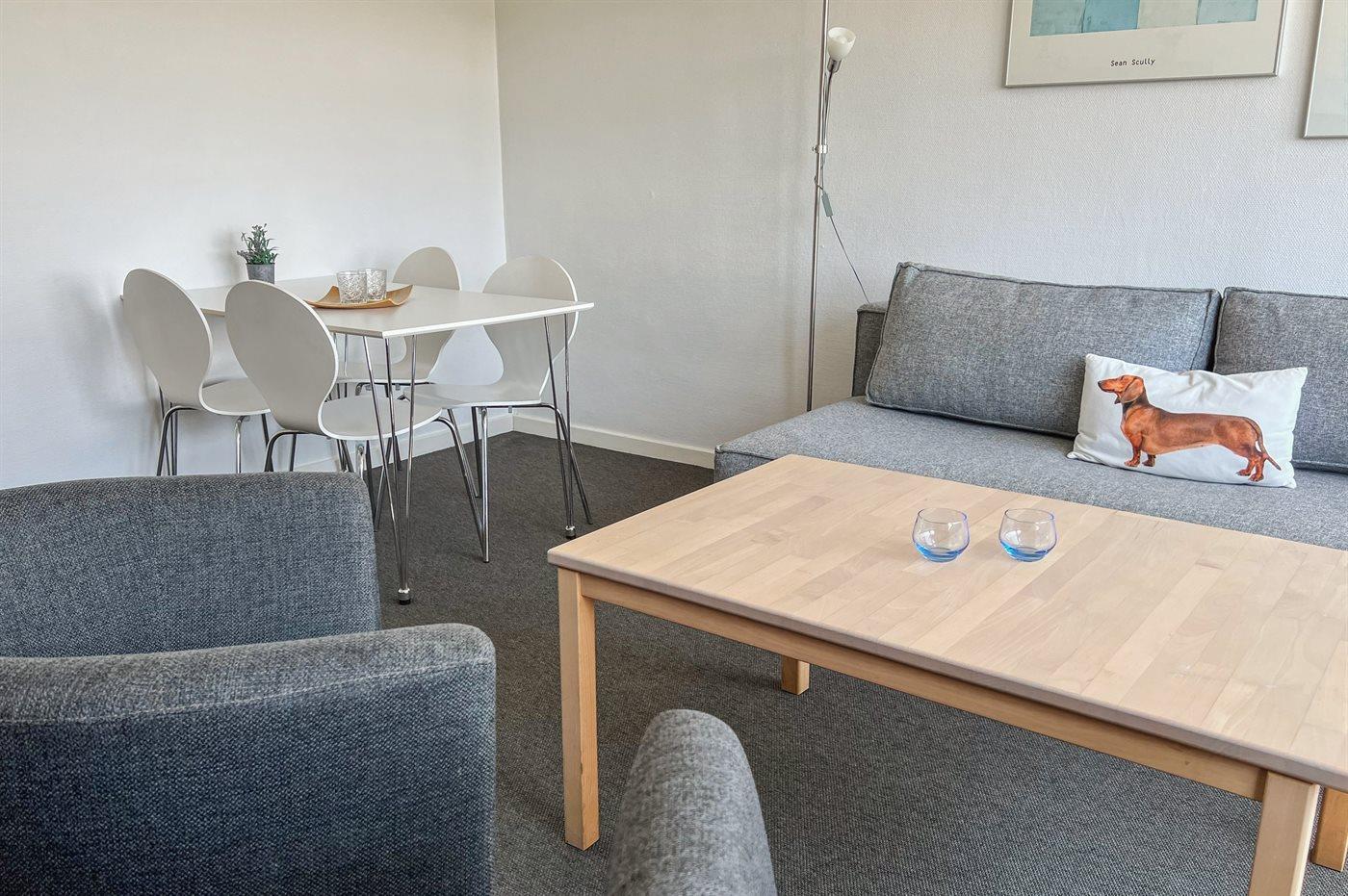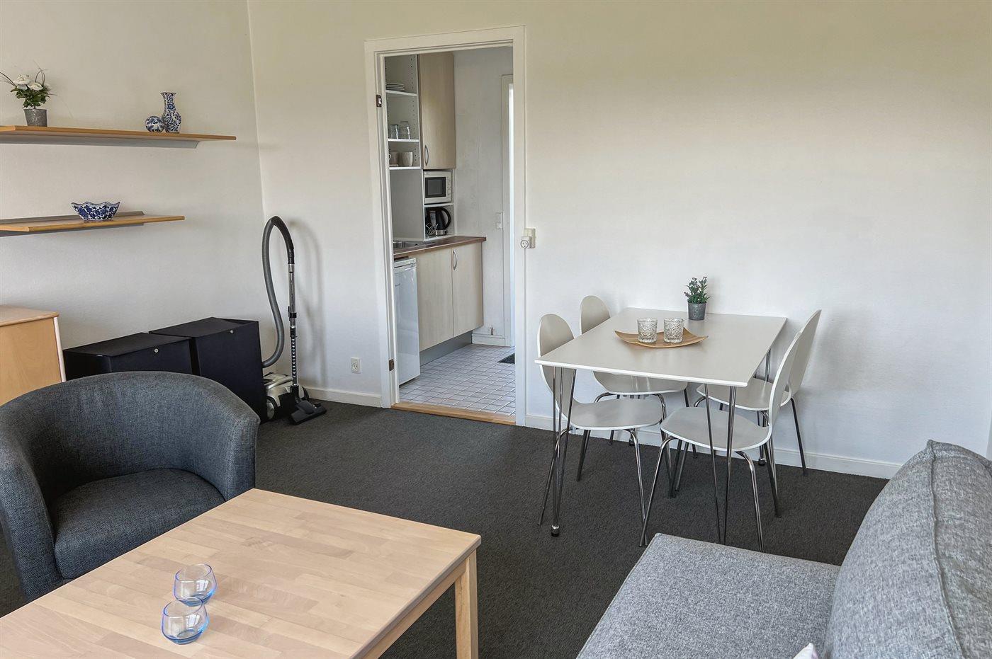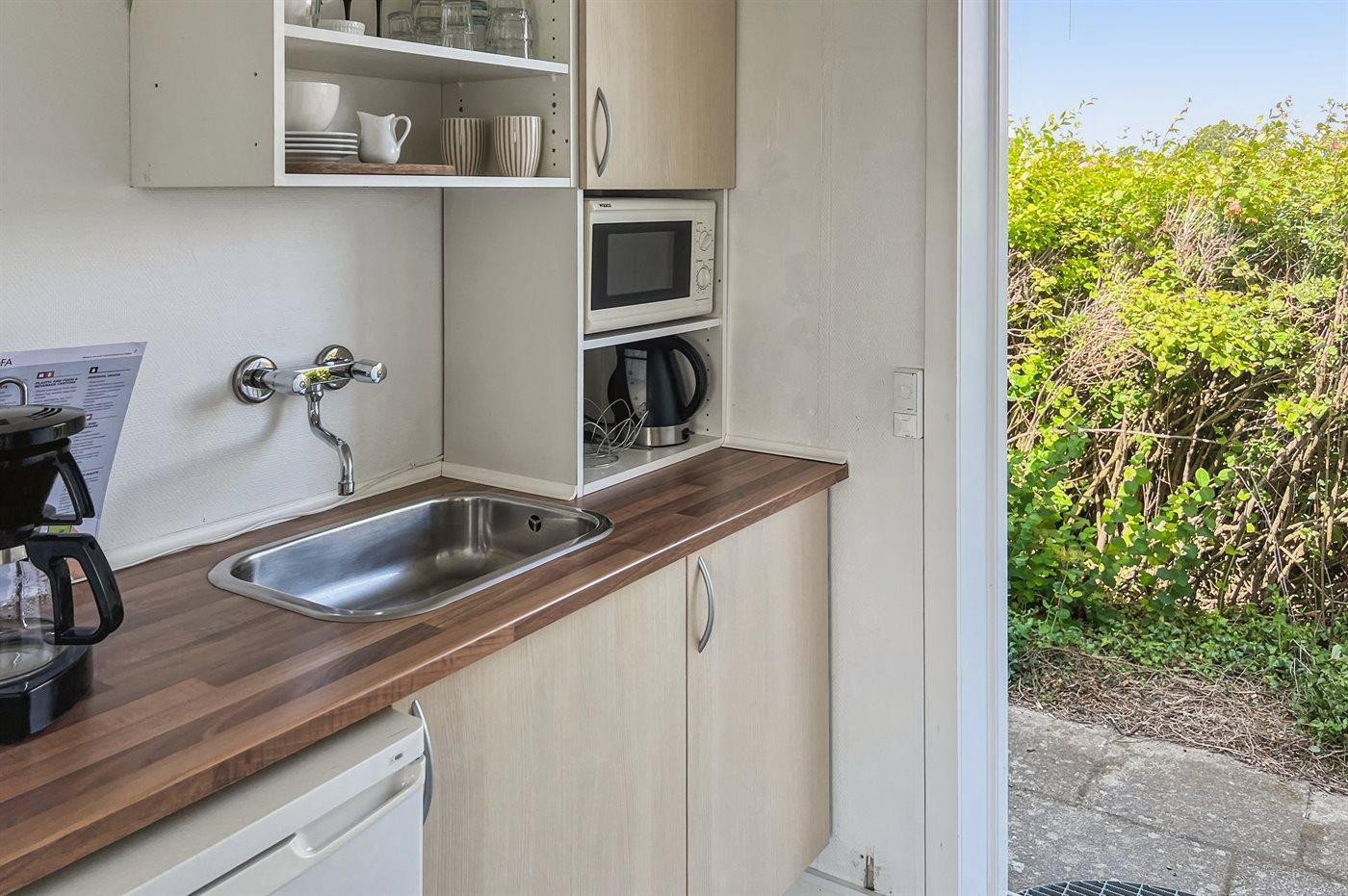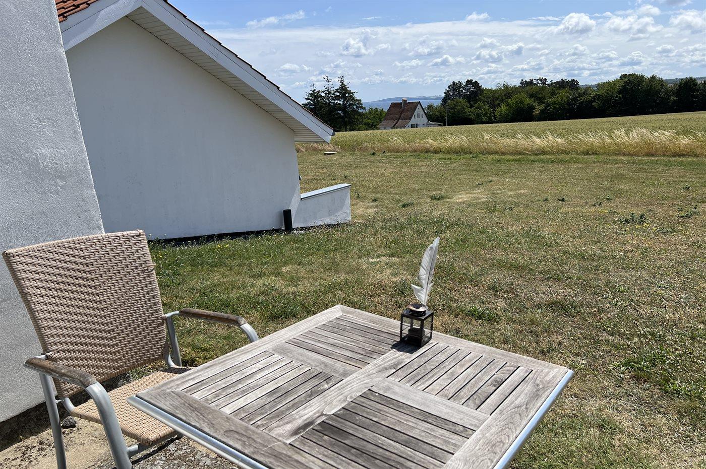Helle Ferienwohnung gelegen mit einem wunderschönen Ausblick über Felder im hügeligen Gelände und über die Ostsee mit Christiansø in der Ferne. Die Ferienwohnung ist eingerichtet mit einem Wohnzimmer, einer kleinen Küche und einem einladenden Badezimmer. In der Küche findest du einen Kühlschrank, elektrische Kochplatten und einen Mini-Backofen. Im Wohnzimmer gibt es ein Schlafsofa für zwei Personen.