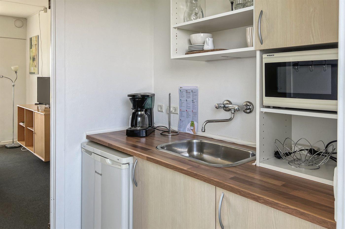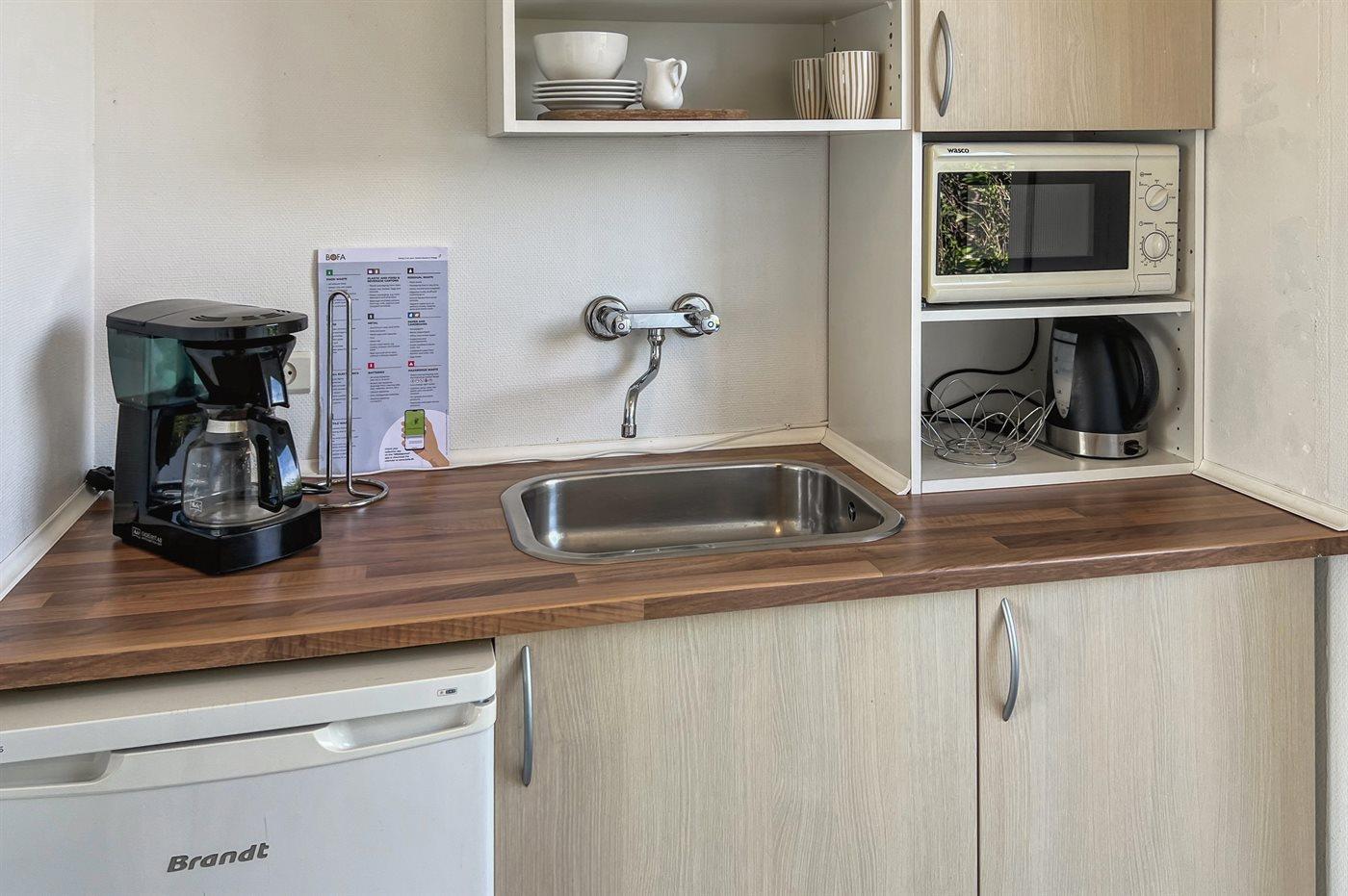 Die Küche ist mit Kühlschrank ausgestattet. Außerdem gibt es 2 elektrische Kochplatten, Minibackofen.