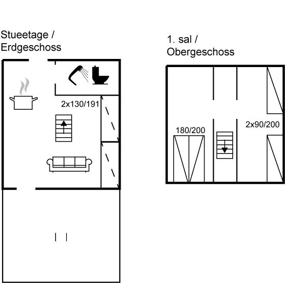 Die Schlafplätze verteilen sich auf 2 Schlafräume. 2 Schlafplätze in einem Doppelbett. 2 Schlafplätze in Einzelbetten. 2 Schlafplätze auf einer Doppelschlafcouch.