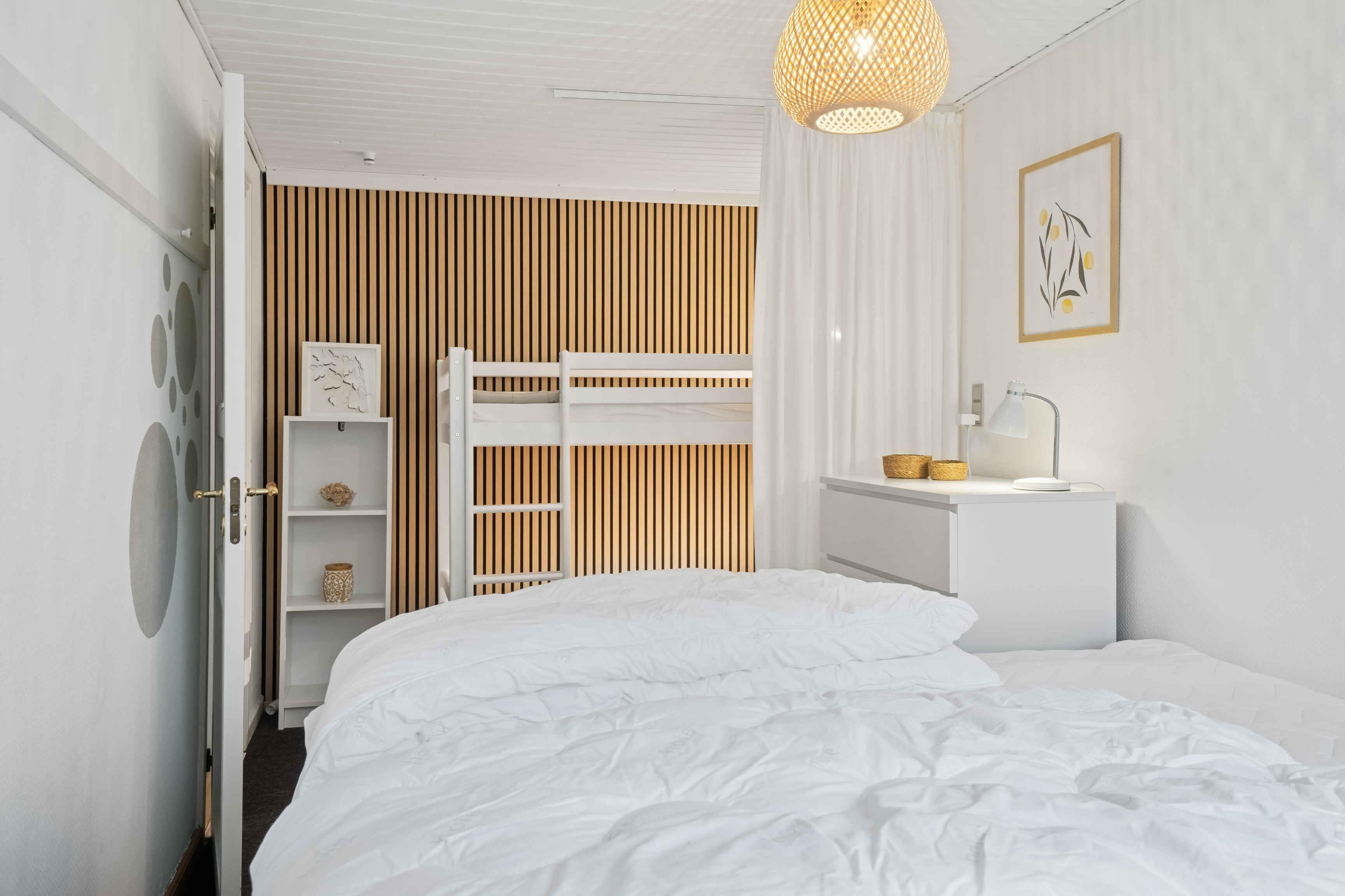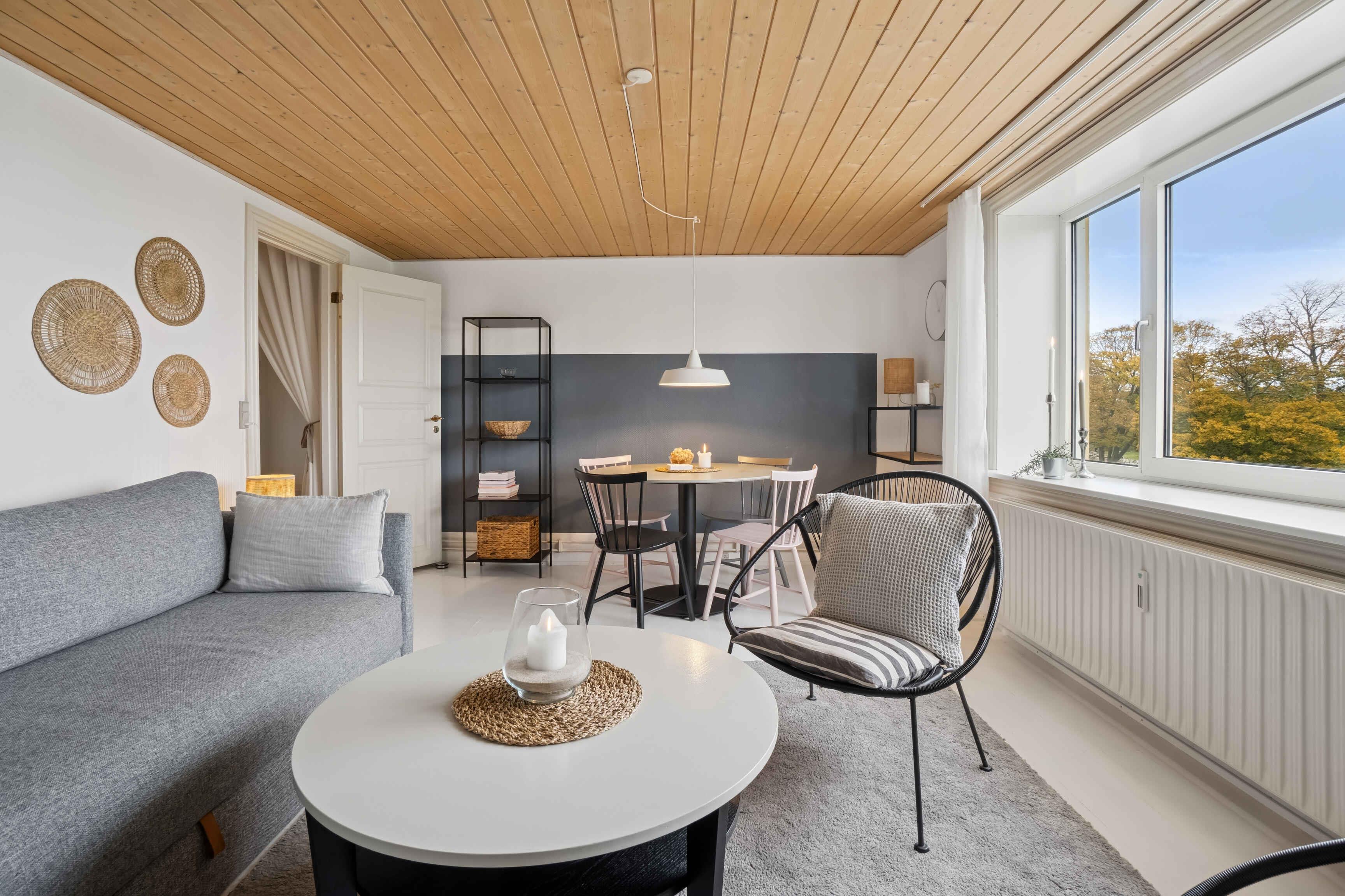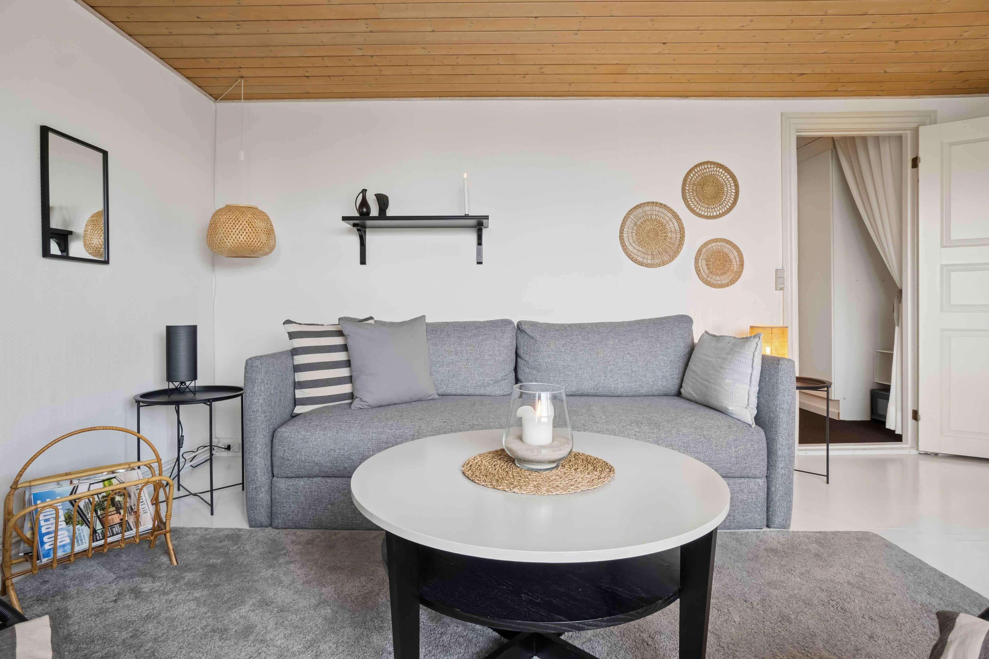 Die gepflegte Wohnung im ersten Stock eines repräsentativen Gebäudes bietet einen schönen Meerblick. Die 57 m² umfassen ein Schlafzimmer und drei Schlafplätze, und die Einrichtung ist schlicht und einladend. Vom Wohnzimmer aus blickt man auf den Park bei Domen, wo das wechselnde Licht über dem Meer den Tagesrhythmus bestimmt. Das Wasser liegt nur 150 Meter entfernt – ideal zum Morgenschwimmen oder für einen Abendspaziergang. Der charmante Garten mit Felsen und sonnigen Ecken lädt zum Entspannen ein. Parkplätze befinden sich auf der Rückseite des Hauses. Die Umgebung eignet sich hervorragend für Urlaubstage. Der Park vor der Wohnung ist Mittelpunkt des Folkemødet, und sowohl das Zentrum von Allinge als auch Sandvig sind zu Fuß erreichbar. Schöne Wanderwege beginnen in der Nähe, Fahrräder können gemietet werden und öffentliche Verkehrsmittel ermöglichen Ausflüge über die gesamte Insel.