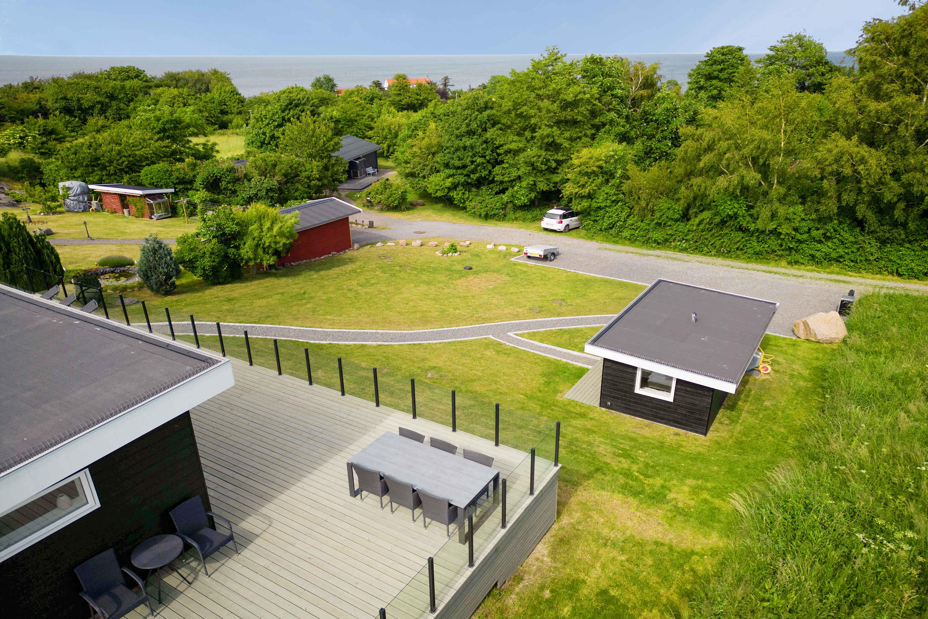 Modernes Ferienhaus auf Bornholm mit Meerblick, Terrasse und Nähe zu Strand sowie Restaurants.