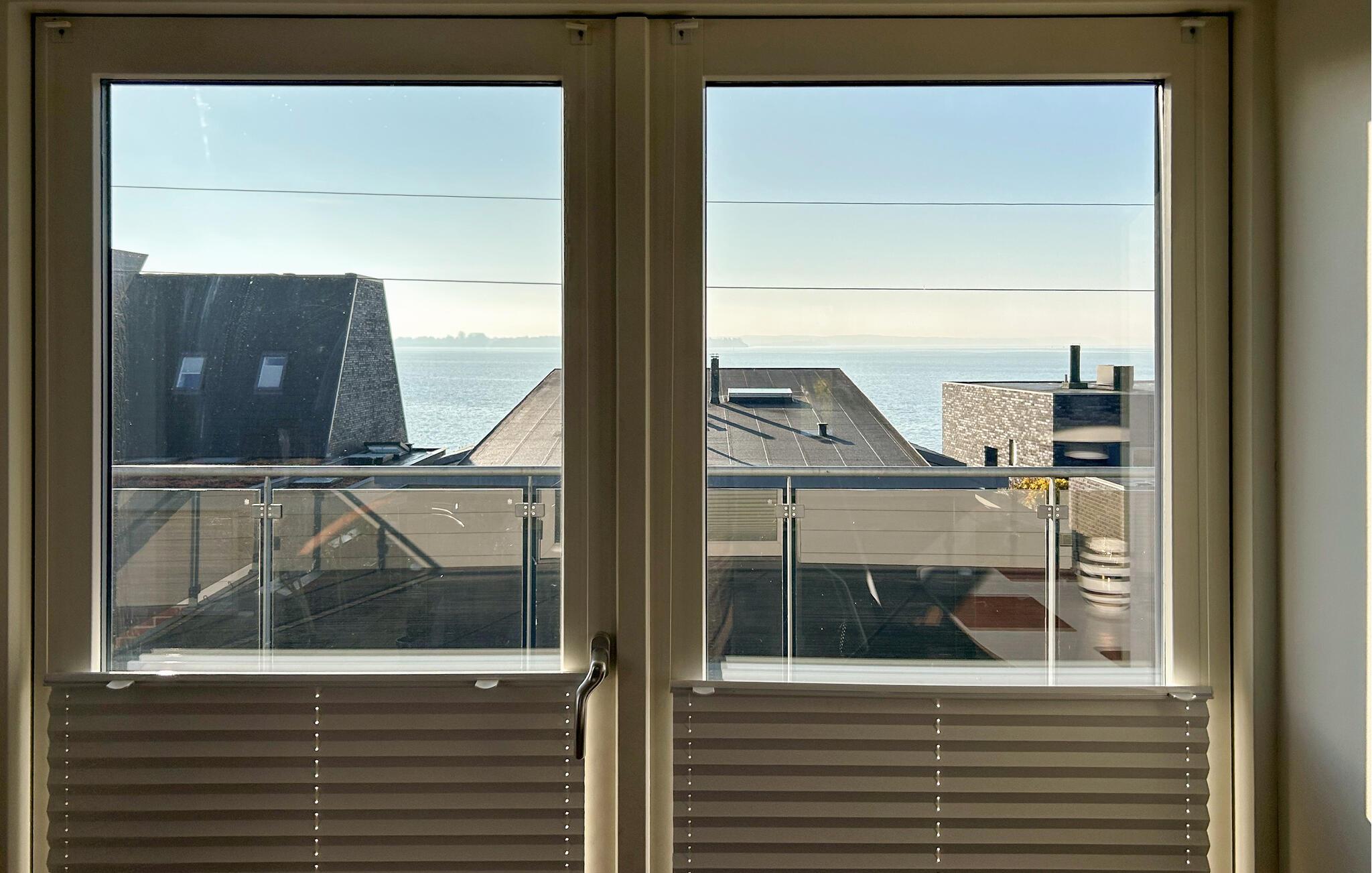 Gehen Sie hinaus auf den großzügigen Balkon und genießen Sie den Blick auf die Bucht. Atmen Sie die frische Meeresluft, während Sie den Tag mit einem Kaffee in der Morgensonne beginnen. Die erhöhte Lage und die moderne Glasbrüstung bieten Ihnen eine fantastische Aussicht über die Dächer bis hin zum Meer. Auch der kleine Gartenbereich lädt zum Verweilen und Entspannen ein.