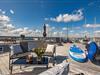 Terrasse im Unterdeck mit Hängematte und Sitzmöbeln, sowie Elektrogrill, Dachterrasse -mit Adirondack-Sessel, Sitzmöbeln mit Tisch, beleuchteten Sonnenschirm und Sonnenliegen.