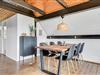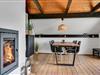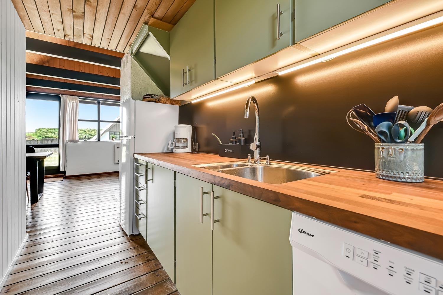 Rustikales Ferienhaus, 90 m2 mit 2 Schlafräumen: 5B. Schlafraum im 1. Stock mit 2B. 2 Einzellbetten über Eck im Raum im Erdgeschoss und 1 Einzelbett im Wohnraum. Das Haus ist sehr einfach eingerichtet; ein Wohnraum mit Polstermöbeln, TV mit dänischen und deutschen Programmen und einer Feuerstätte. Einfache Küchenecke mit E-Herd mit 4 Kochplatten und ein Kühlschrank mit kleinem Gefrierfach. Badezimmer mit Toilette, Dusche und Waschbecken. 2 Haustiere erlaubt. Nichtraucher-haus