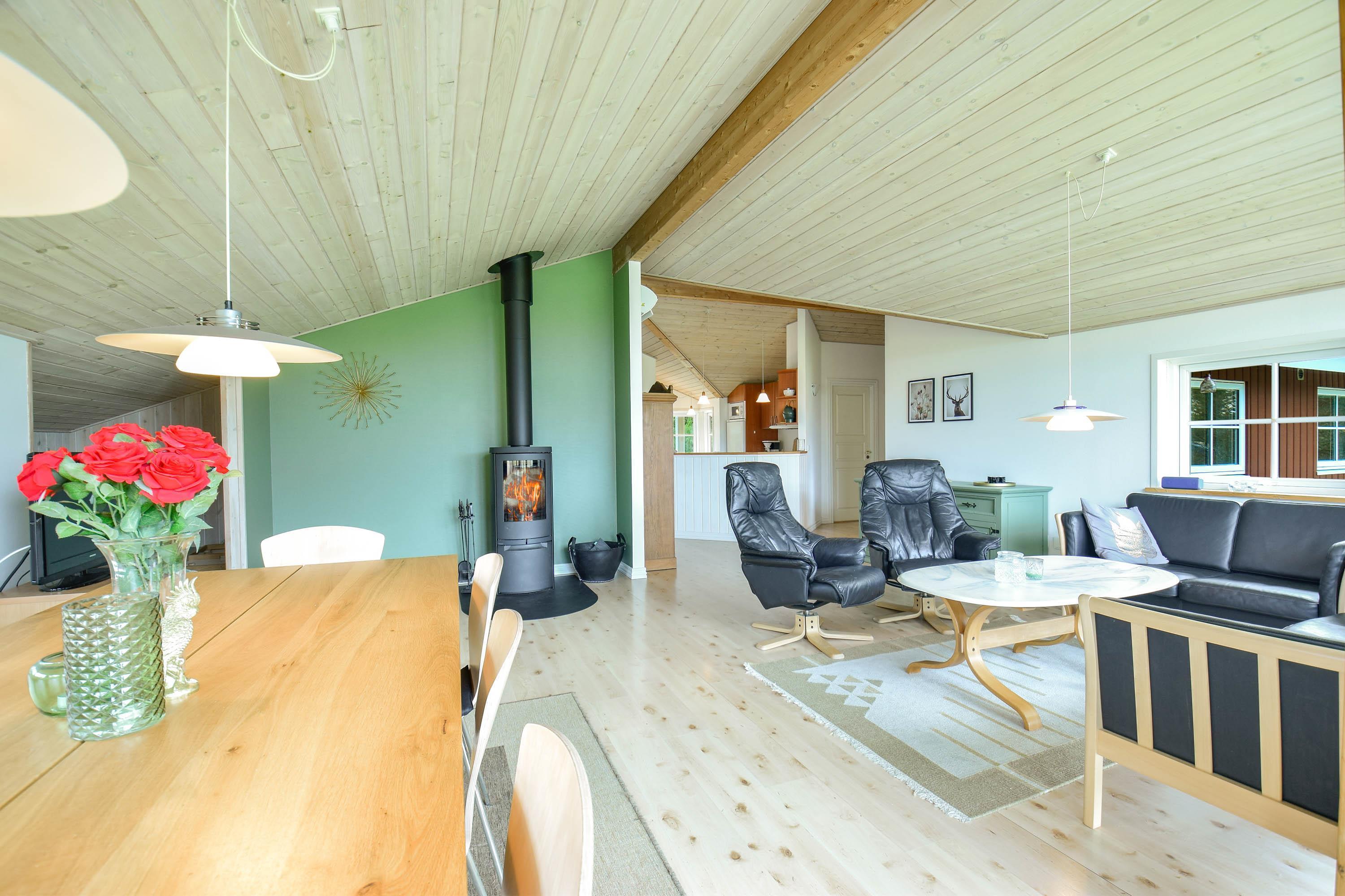 Der Kaminofen sorgt für wohlige Wärme und eine behagliche Atmosphäre, während die gemütliche Alkove ein perfekter Platz zum Lesen und Entspannen ist.