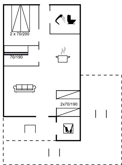 Die Schlafplätze verteilen sich auf 3 Schlafräume. 2 Schlafplätze in einem Doppelbett. 2 Schlafplätze in Einzelbetten. 2 Schlafplätze in einem Etagenbett. Ferner steht ein Kinderbett zur Verfügung.