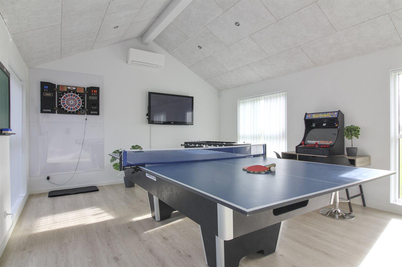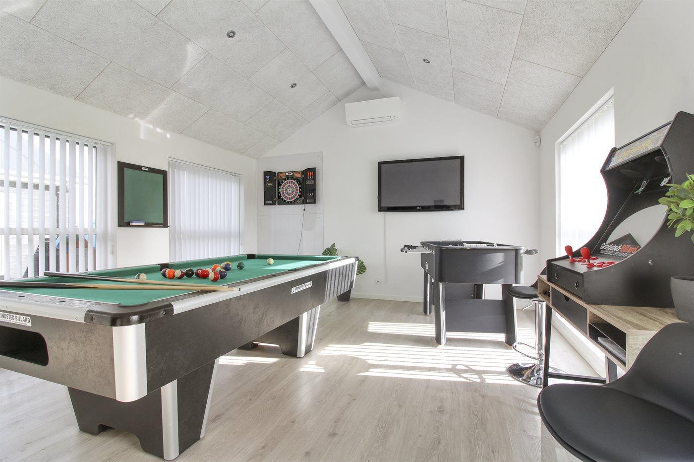 Im Aktivitätsraum: Billard, Tischtennis, Darts, Tischfußball, Shuffleboard, Spielautomat, TV und ein Radio (FM, DAB+, Internetradio und die Möglichkeit, Musik kabellos via Bluetooth abzuspielen). Im Haus gibt es ein Smart-TV und ebenfalls ein Radio mit den gleichen Funktionen. Zugang zu mindestens 4 dänischen Kanälen, 1–3 schwedischen Kanälen, 1–3 norwegischen Kanälen und mehr als 3 deutschen Kanälen.