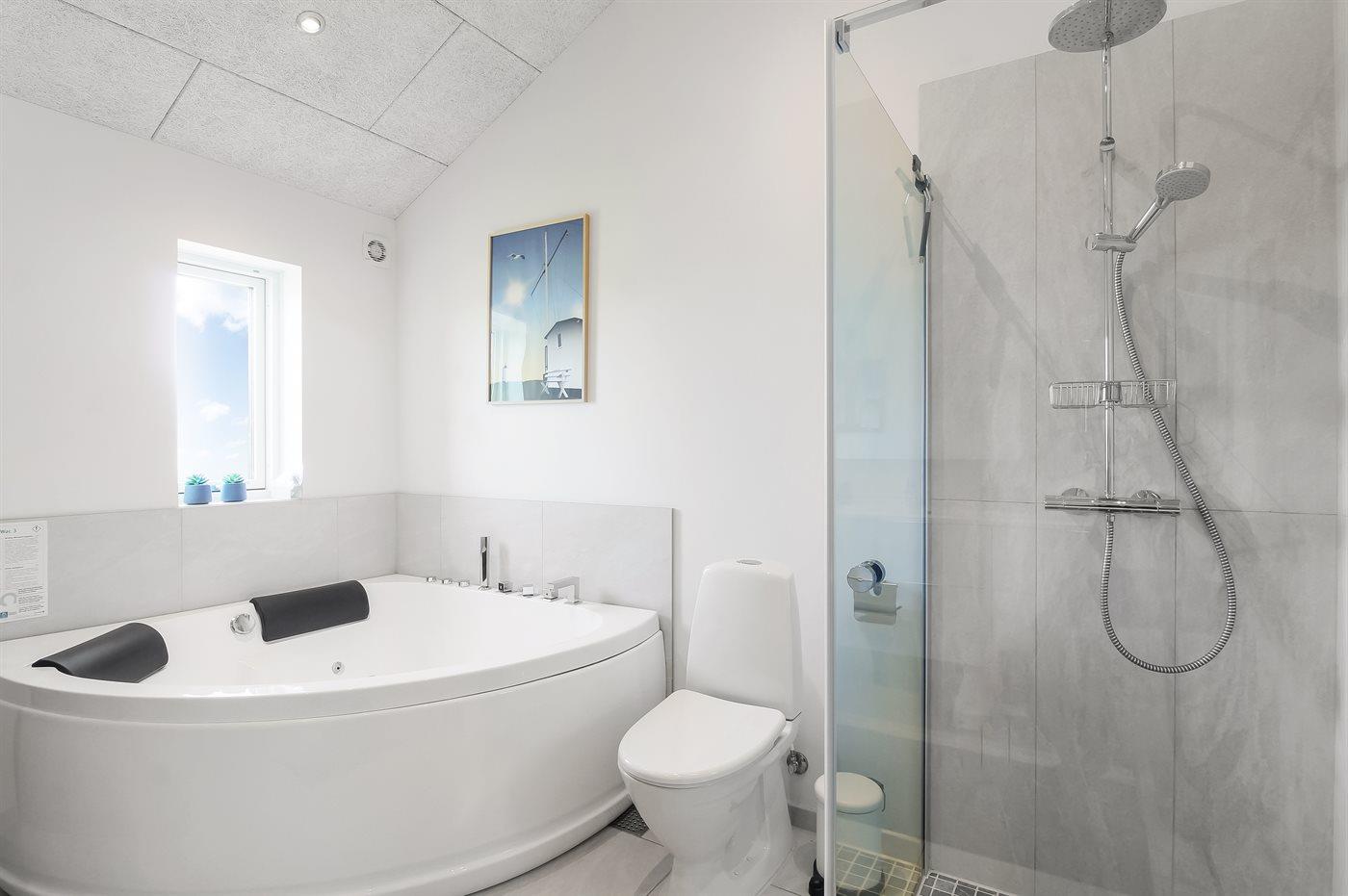 Es gibt 2 Badezimmer mit Dusche und 3 Toiletten, darunter 1 Gäste-WC. Beide Badezimmer haben Fußbodenheizung. In einem der Badezimmer kannst du dich in einem Indoor-Whirlpool für 2 Personen entspannen und die Sauna mit Bluetooth-Lautsprecher genießen.