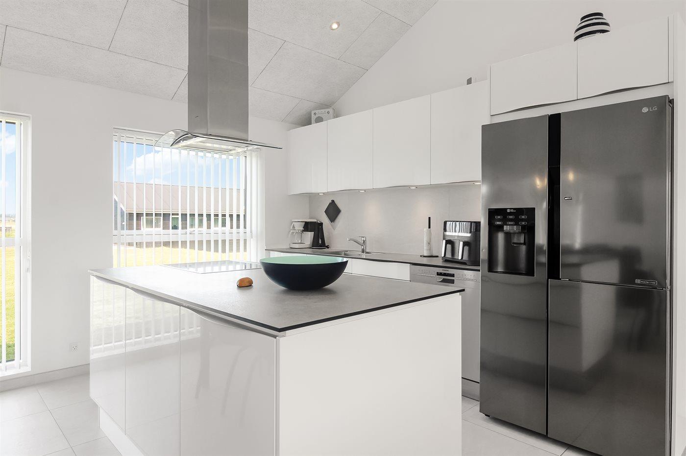 Die Küche ist ausgestattet mit einem amerikanischen Kühlschrank, einem Gefrierfach (90 Liter), 4 Induktionskochfeldern, Umluftofen, Mikrowelle, Airfryer, Paninigrill, Küchenmaschine sowie Geschirrspüler.