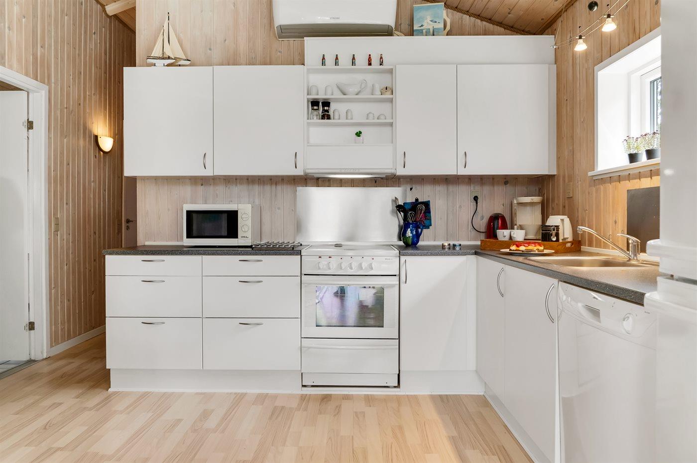Die Küche ist mit Kühlschrank ausgestattet. Außerdem gibt es 4 Keramik-Kochfelder, Umluftofen, Mikrowelle sowie Geschirrspüler.