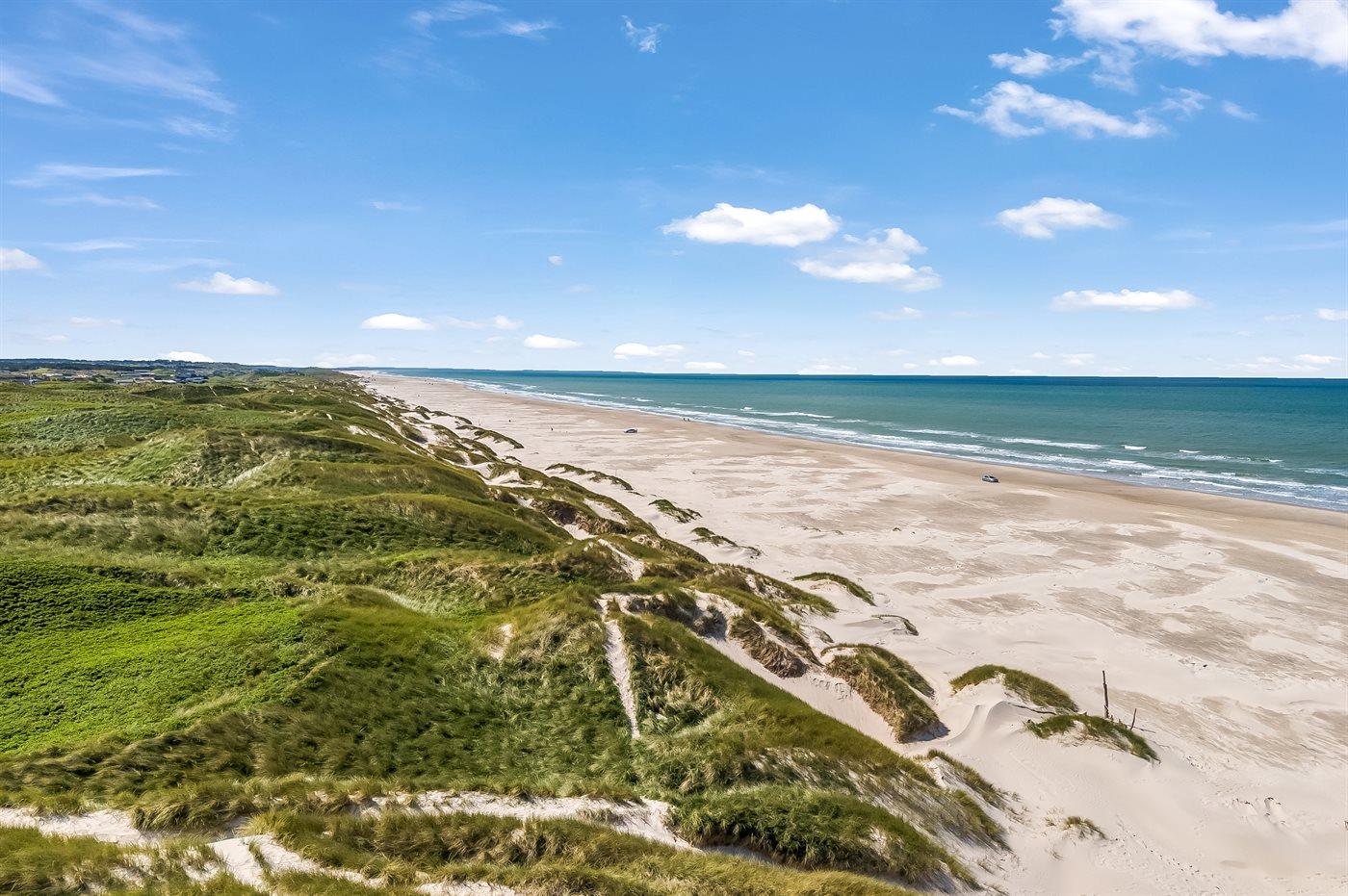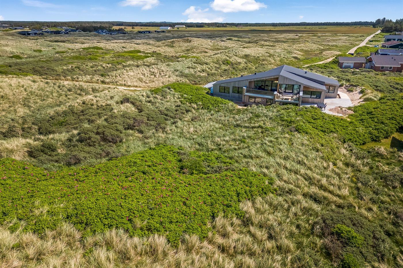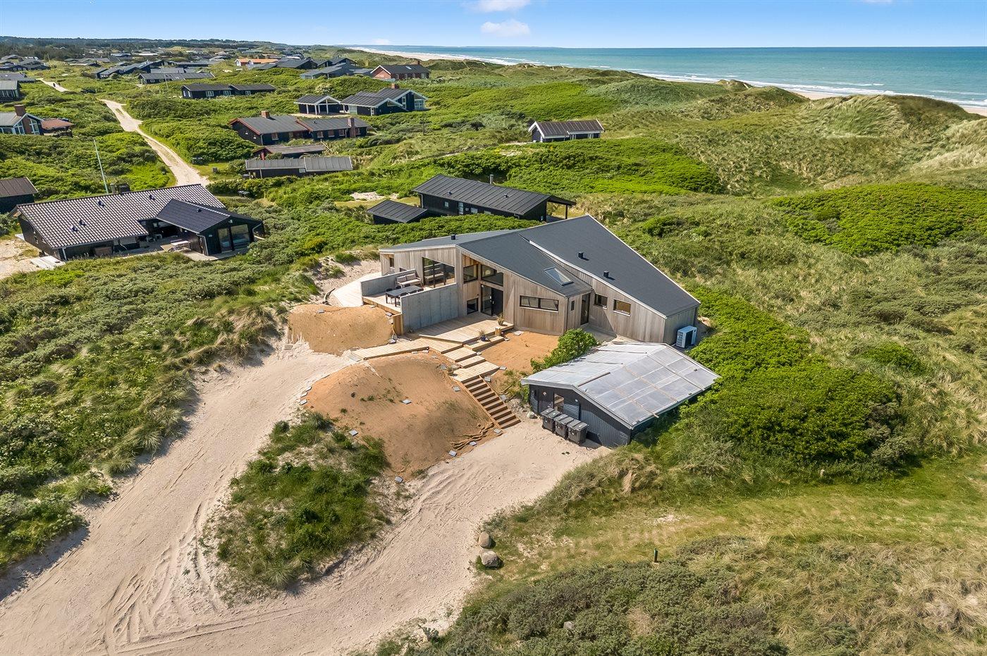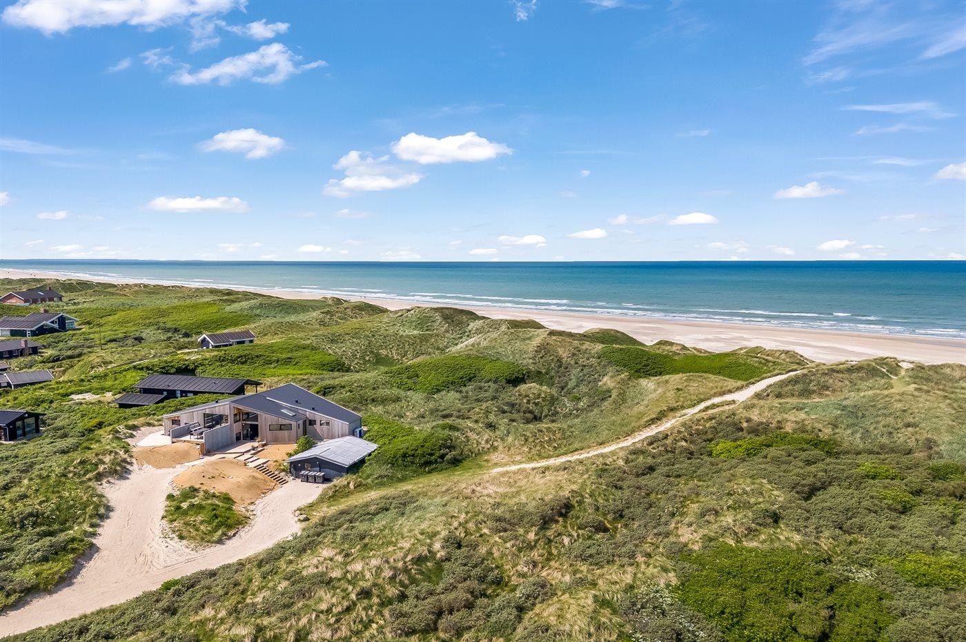 Das Haus liegt einzigartig am Ende einer Sackgasse mit den Dünen und dem Meer im Westen und dem unter Naturschutz stehenden Gebiet Munkens Klit im Norden. Vom erhöhten Küchen- und Wohnbereich hast du einen fantastischen Blick auf das Meer und die Dünen, mit direktem Zugang zu den Terrassen, auf denen du die Morgen- und Abendsonne mit Meerblick genießen kannst. Lausche dem Rauschen der Nordsee von den fünf Doppelzimmern aus, die mit großen Fenstern zu den Dünen im Westen hin ausgerichtet sind.