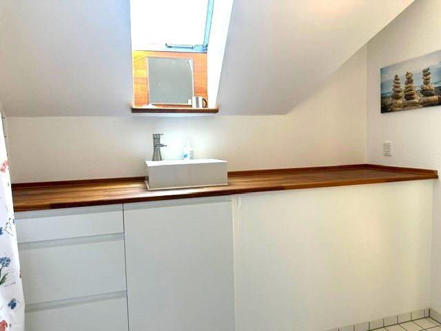 Die Ferienwohnung verfügt über eine praktische Küchenzeile mit Kochplatte, Mini-Backofen sowie Kühl-/Gefrierschrank, sodass Sie Ihre Mahlzeiten im Urlaub ganz einfach zubereiten können. Diese können Sie am Esstisch im Wohnzimmer genießen, wo die Aussicht für eine besondere Atmosphäre sorgt. Das Wohnzimmer bietet außerdem ein bequemes Schlafsofa und eine gemütliche Nische mit Platz für zwei Personen – ideal sowohl zum Entspannen als auch für eine erholsame Nachtruhe. Das Badezimmer ist hell und einladend und verfügt über eine geräumige Duschkabine.