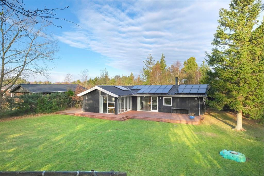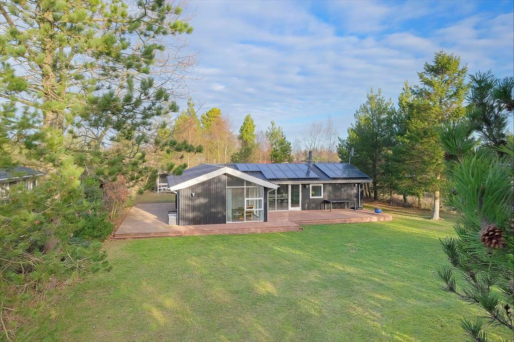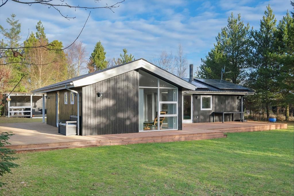 Ein Grill, Gartenmöbel und Liegestühle versüßen Ihnen Ihr Urlaubsleben auf der großen Holzterrasse, die sich rund um das Haus erstreckt. Falls Sie sich nicht nur den gesamten Tag über sonnen möchten, können Sie mit Ihrer Familie auf der Grasfläche verschiedenste Gartenspiele spielen. Ihre jüngsten Kinder dürfen sich auf dem 1.052 m² großen Grundstück auf ein Spielgerüst mit Schaukel und Rutsche freuen.