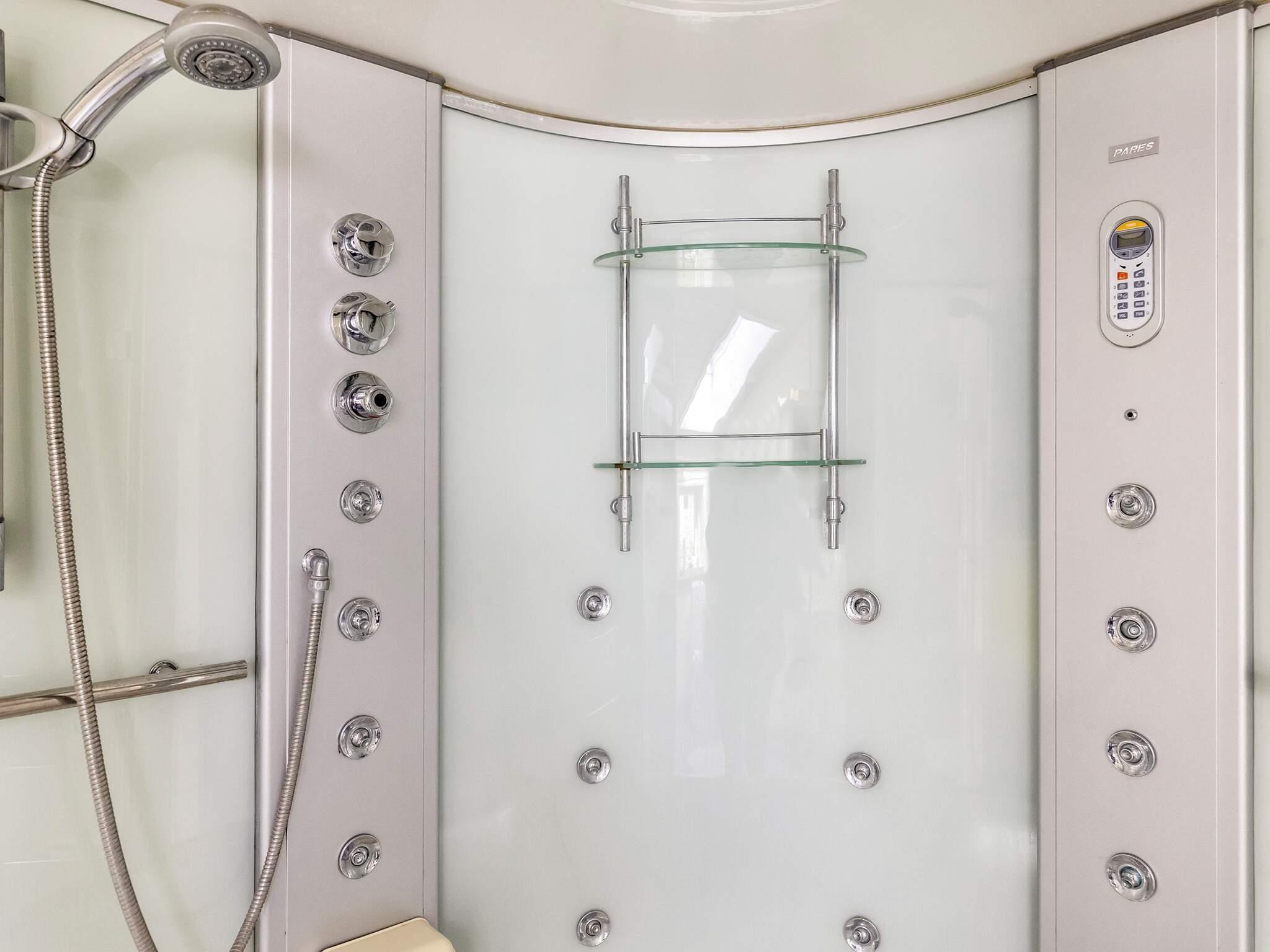 Das einzige Badezimmer des Hauses verfügt über eine Dampfduschkabine, deren Wanne auch als Whirlpool dient. Im Anschluss an das Badezimmer befindet sich auch die Sauna des Hauses.