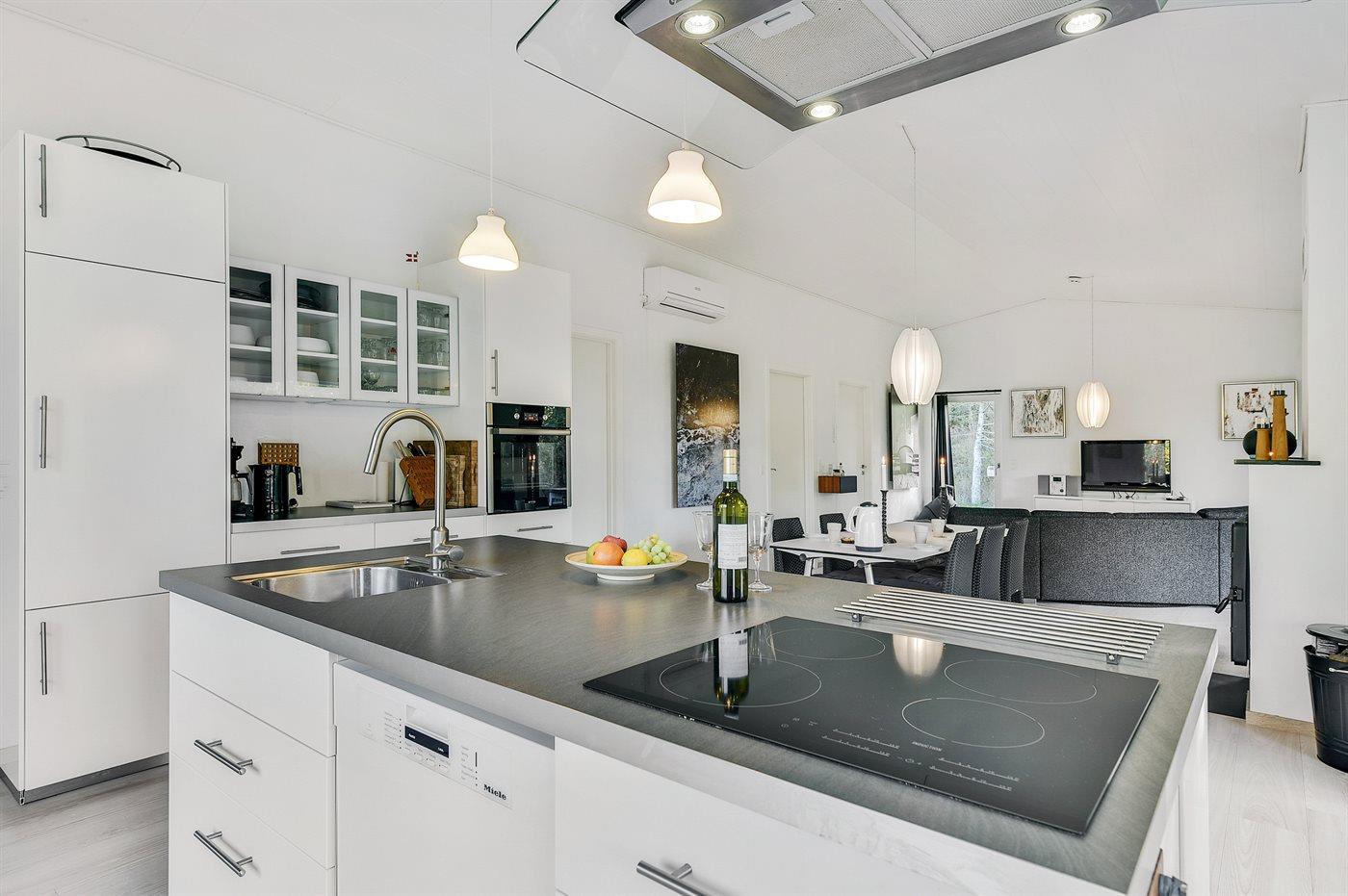 Die Küche ist mit Kühlschrank ausgestattet. Außerdem gibt es 4 Induktions-Kochzonen, Umluftofen, Mikrowelle sowie Geschirrspüler.
