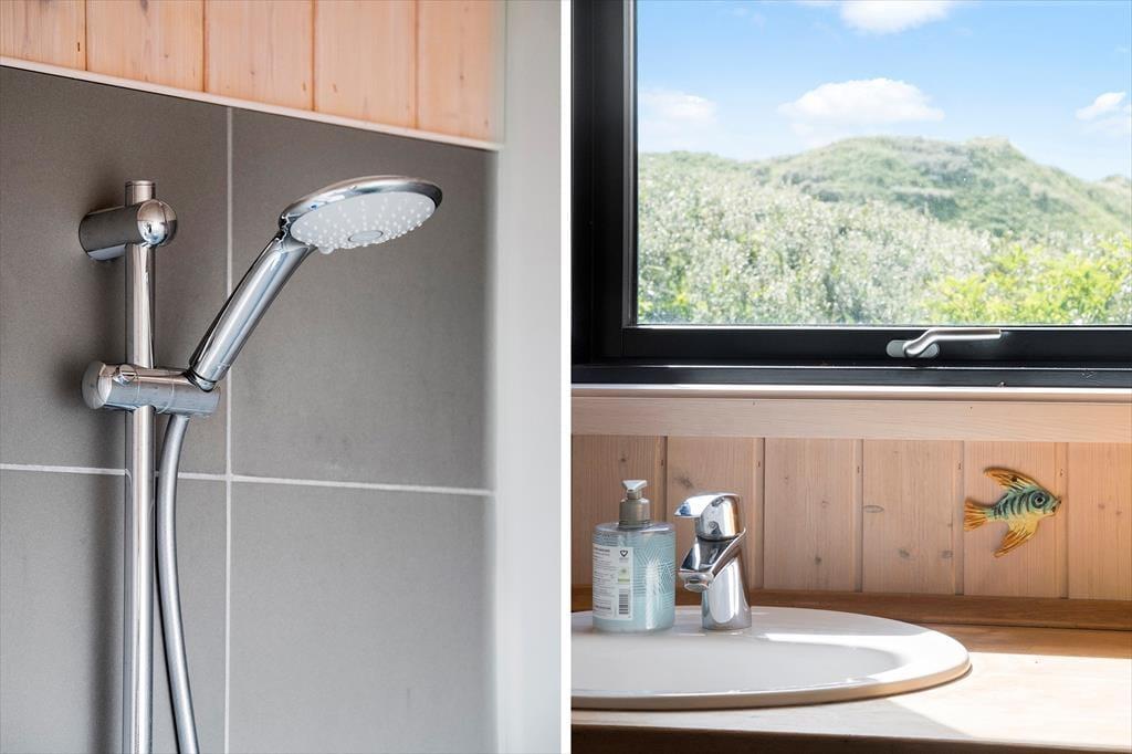 Das Ferienhaus liegt auf einem großen, ungestörten Naturgrundstück, das buchstäblich mit der umliegenden Landschaft verschmilzt. Für ein Frühstück in der Morgensonne bietet sich die Ostterrasse an. Später am Tag wirst du es dir mit deiner Familie gern auf der zweiten Terrasse gemütlich machen, auf der ihr die Sonne von Süden und Westen genießt. Die Außendusche mit warmem und kaltem Wasser erfrischt dich am Morgen und spült dir nach einem Abstecher an den Strand den Sand und das Salz des Meeres von der Haut.
