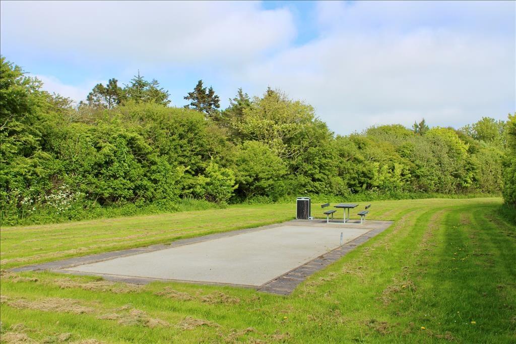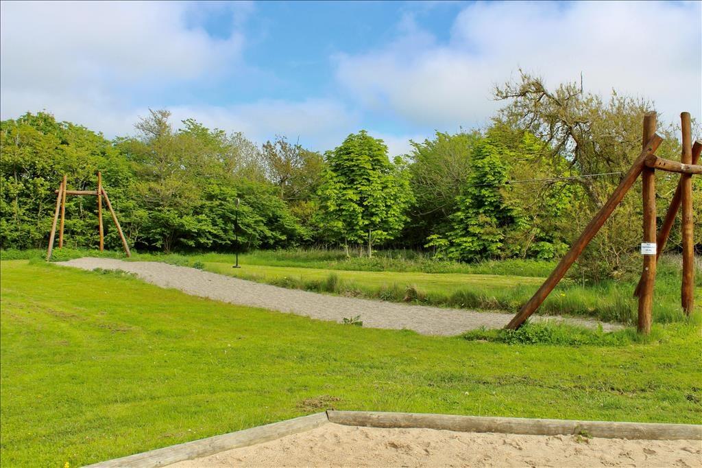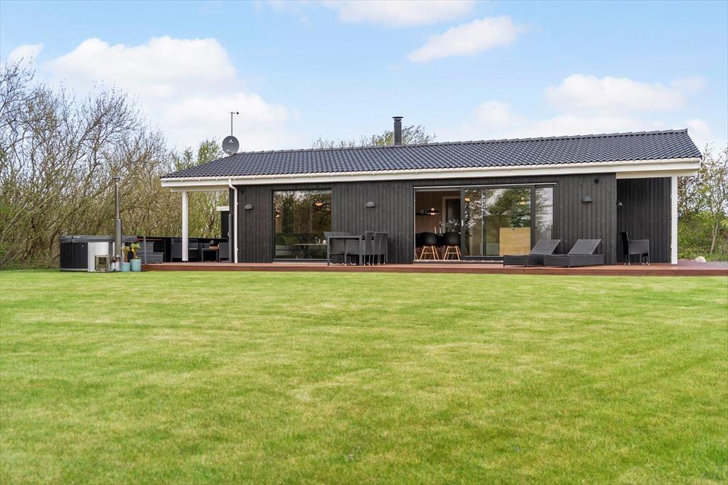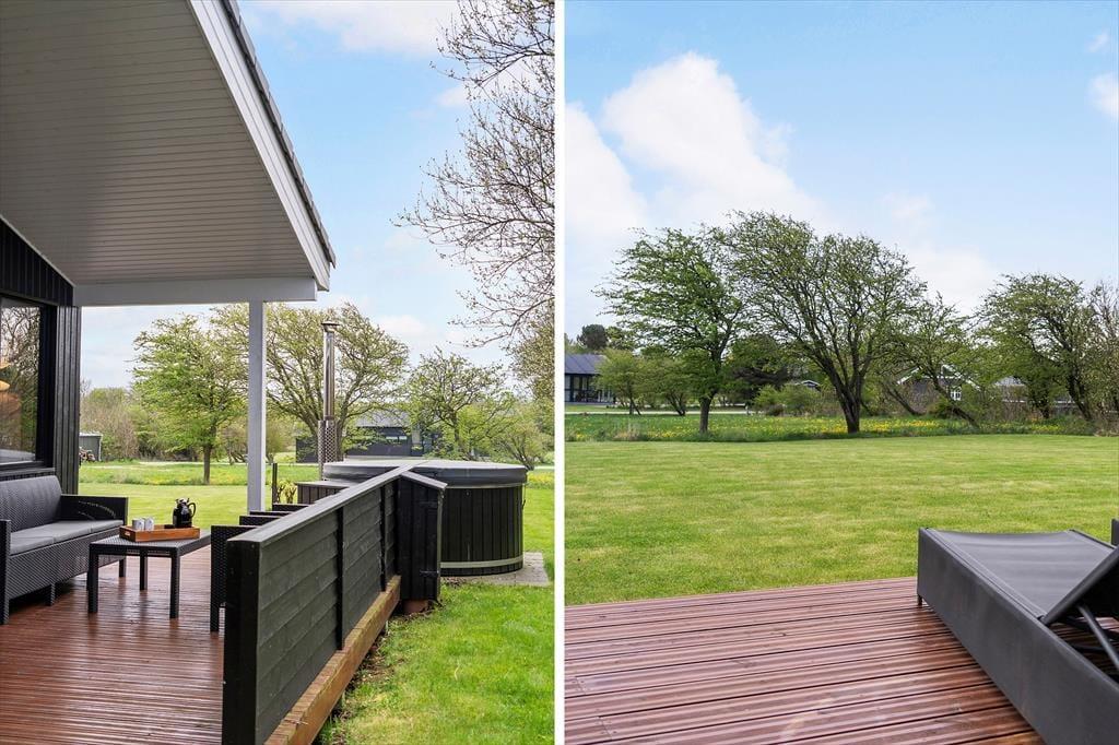 Auch draußen im Freien gibt eine Möglichkeit ein Bad zu nehmen: hier auf dem 930 m2 großen Grundstück befindet sich nämlich ein herrliches Wildnisbad, welches zu einer stillen Stunde, wenn die Dunkelheit einsetzt und der Ferienfrieden über Kjærgaarden einkehrt, einlädt. Sie können auch das Leben genießen auf der großen teilweise überdachten Holzterrasse, welche mit guten Qualitätsmöbeln ausgestattet ist. Auf dem Rasen des Gartens ist viel Platz für Spiel und Spaß, und darüber hinaus können Sie den Spielplatz des Ferienhausgebietes frei benutzen, wo es eine Petanque Bahn sowie eine Minigolfbahn – bitte bringen Sie selbst Bälle und Schläger mit, wenn Sie die Minigolfbahn benutzen möchten.