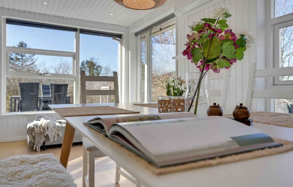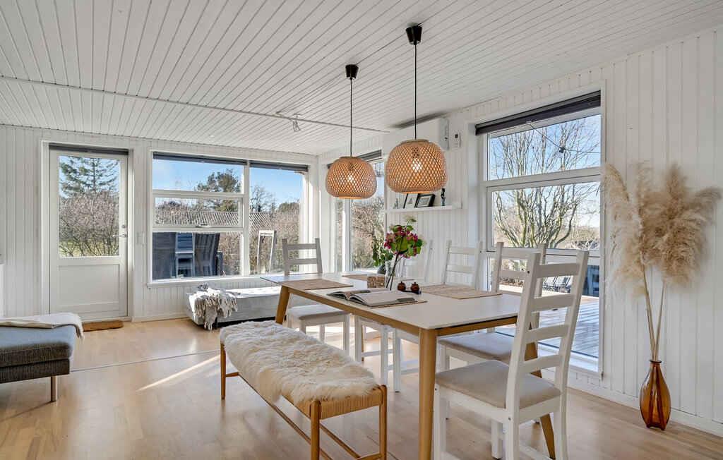 Helles, renoviertes Ferienhaus mit 75 m², 3 Schlafzimmern und Platz für 6 Personen. Ruhige Lage bei Dejret Klit, umlaufende Terrasse, Wildnisbad und Shelter. 300 m zum Meer, Badesteg und Wanderwege.