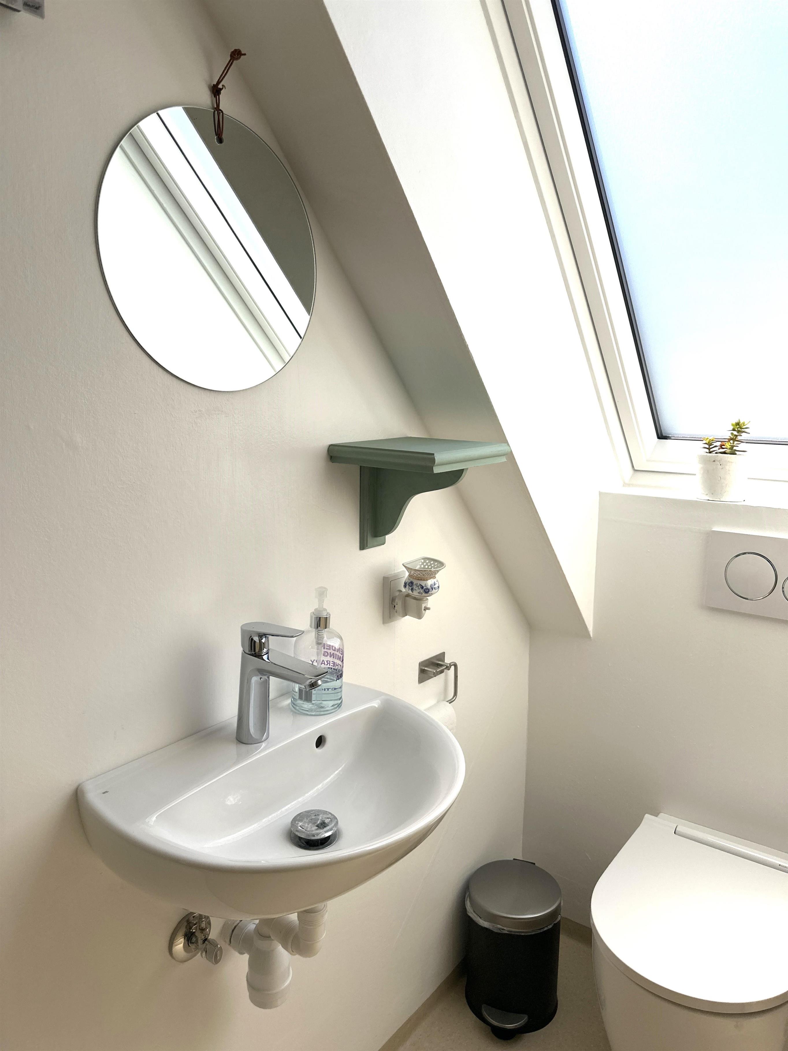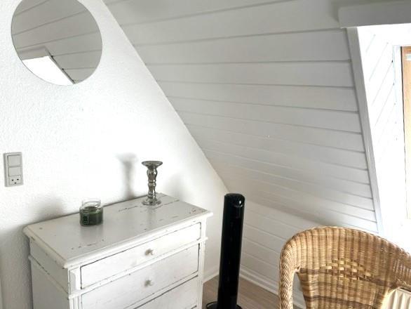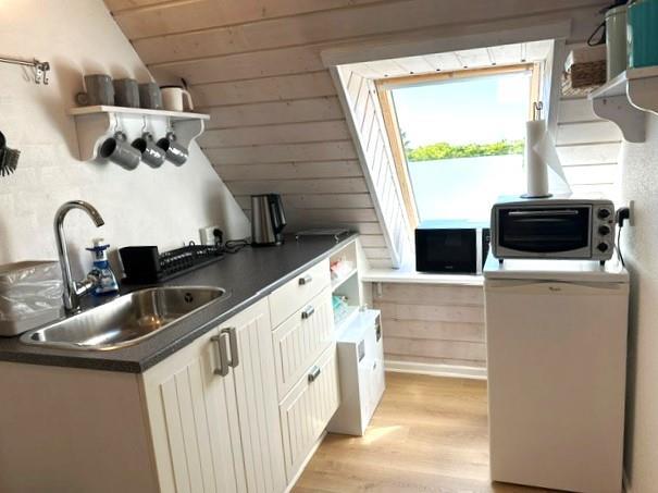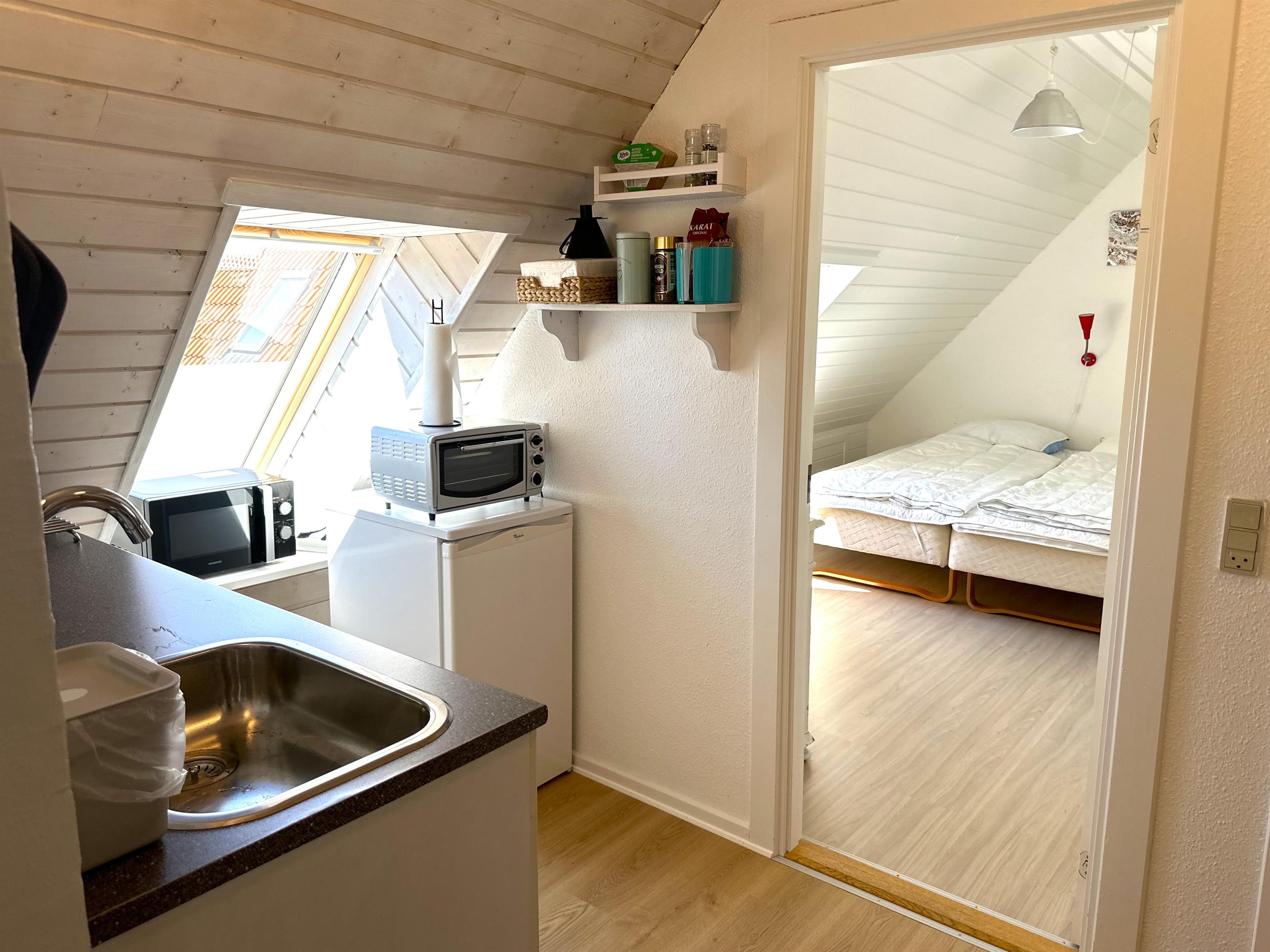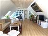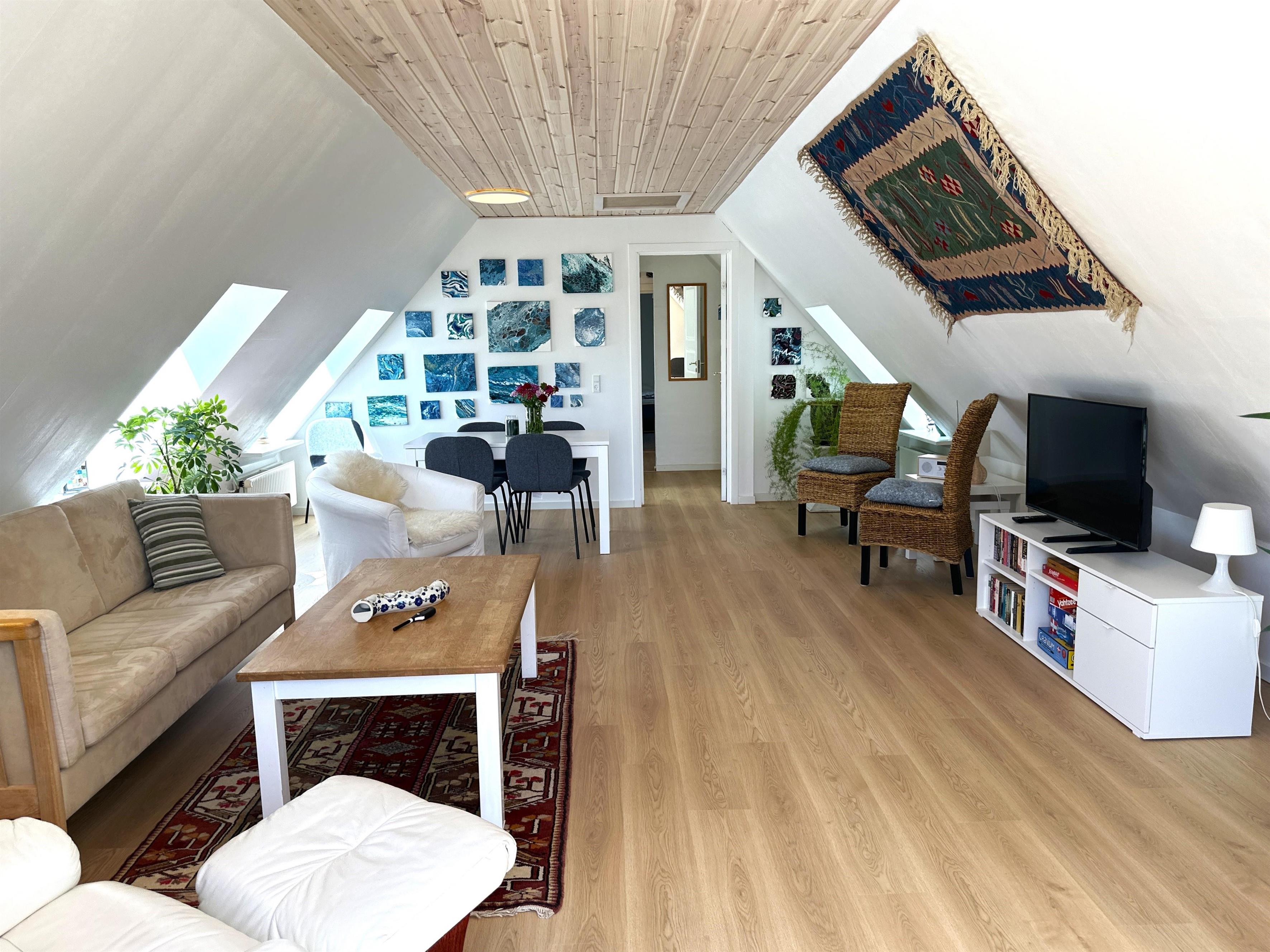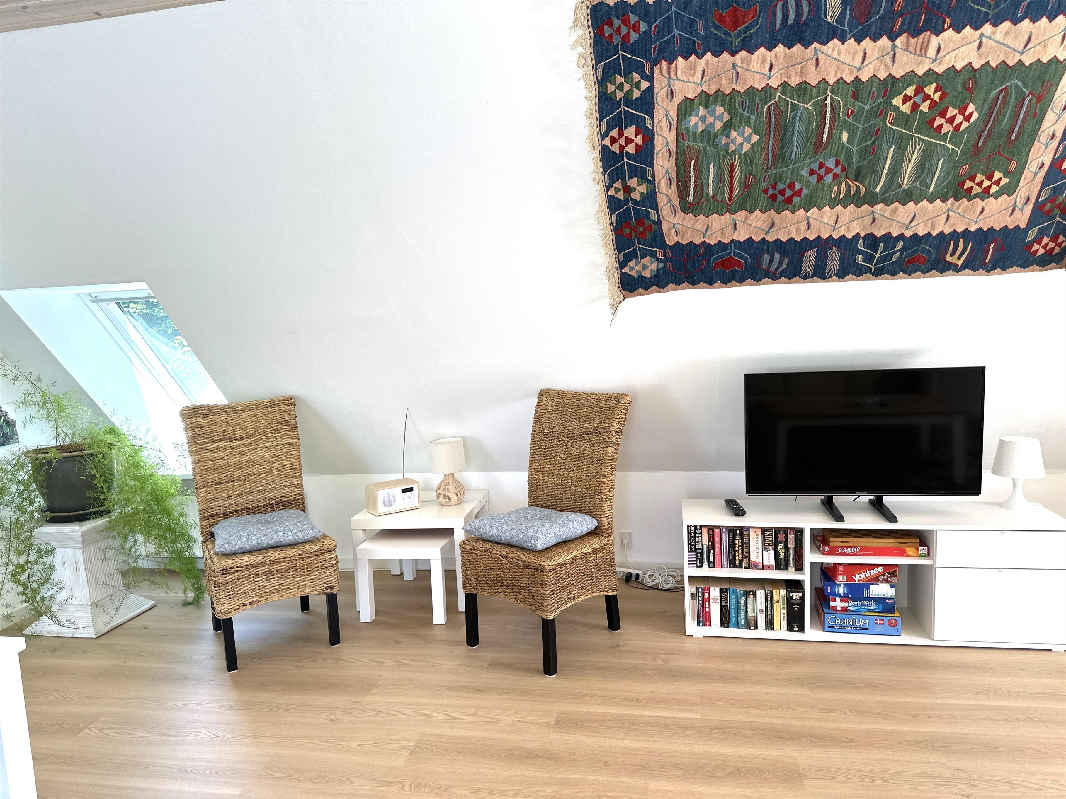 Die Wohnung ist hell, geräumig und komfortabel eingerichtet mit hohen Decken, was ein angenehmes Gefühl von Offenheit und Weite vermittelt. Das Wohnzimmer kombiniert einen Essbereich mit einer gemütlichen Sofaecke, sodass Sie die Familie zu Mahlzeiten, geselligen Spielen oder ruhigen Momenten mit einem guten Buch versammeln können. Die Küchenzeile, die mit dem Wohnzimmer verbunden ist, macht es einfach, sowohl kleinere Mahlzeiten als auch lokale Produkte aus Samsø zuzubereiten.
