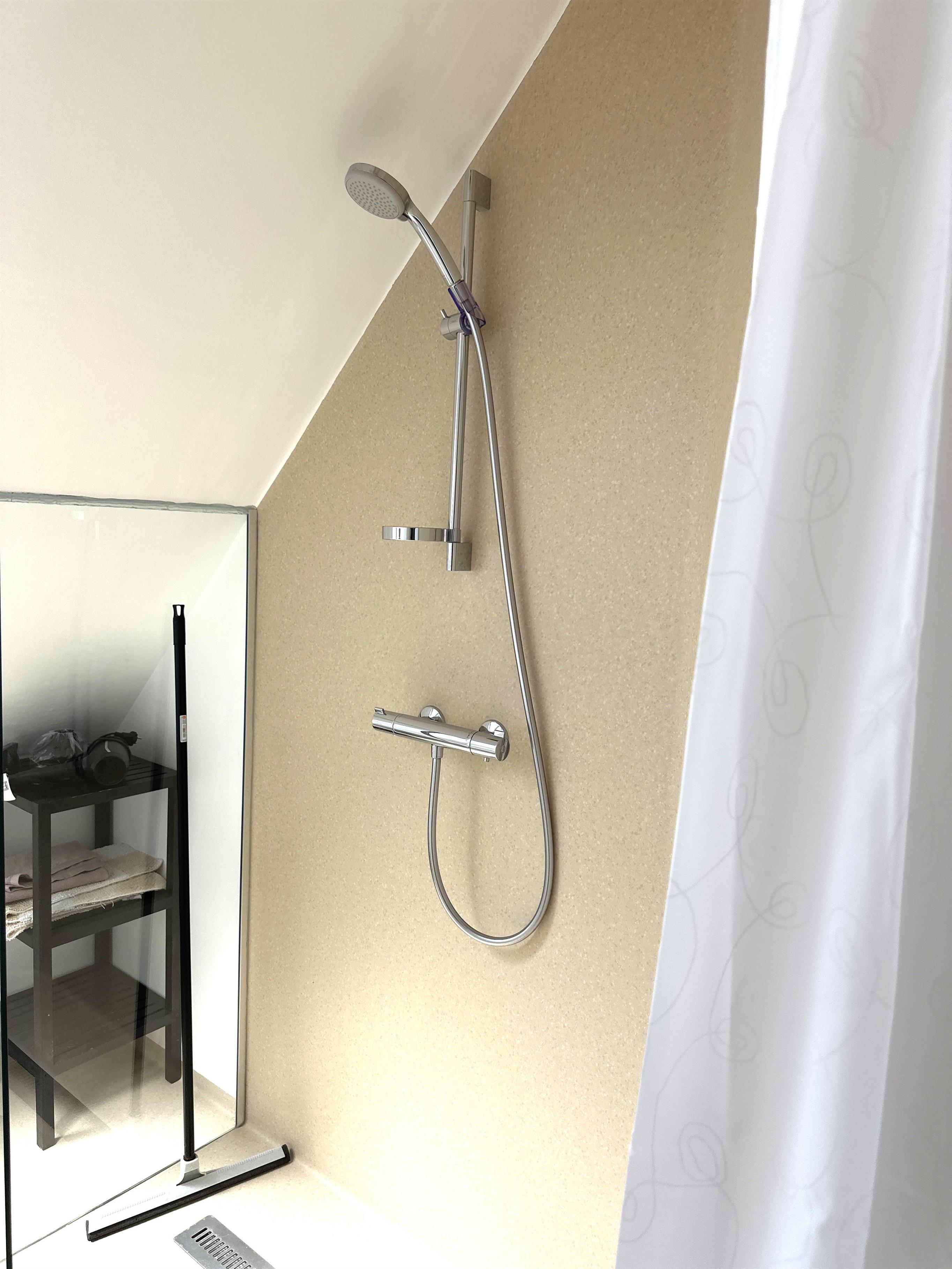 Es gibt zwei Schlafzimmer – eines mit einem Doppelbett und eines mit zwei Einzelbetten –, wodurch die Wohnung perfekt für Familien und kleinere Gruppen ist. Das Badezimmer ist modern und mit einer Duschkabine ausgestattet.