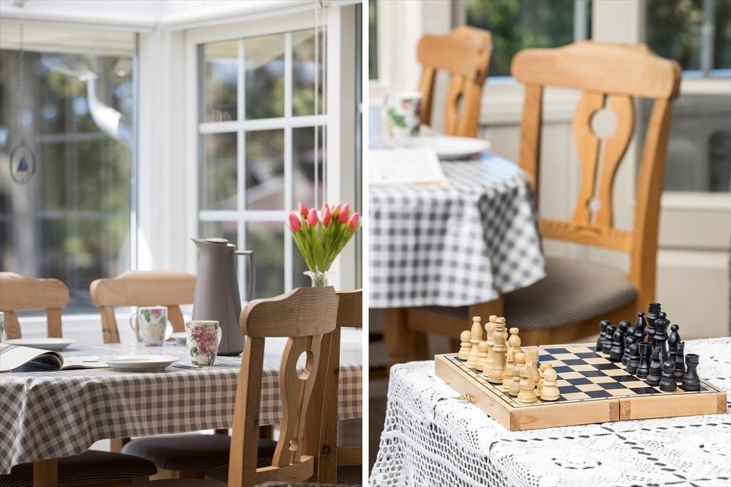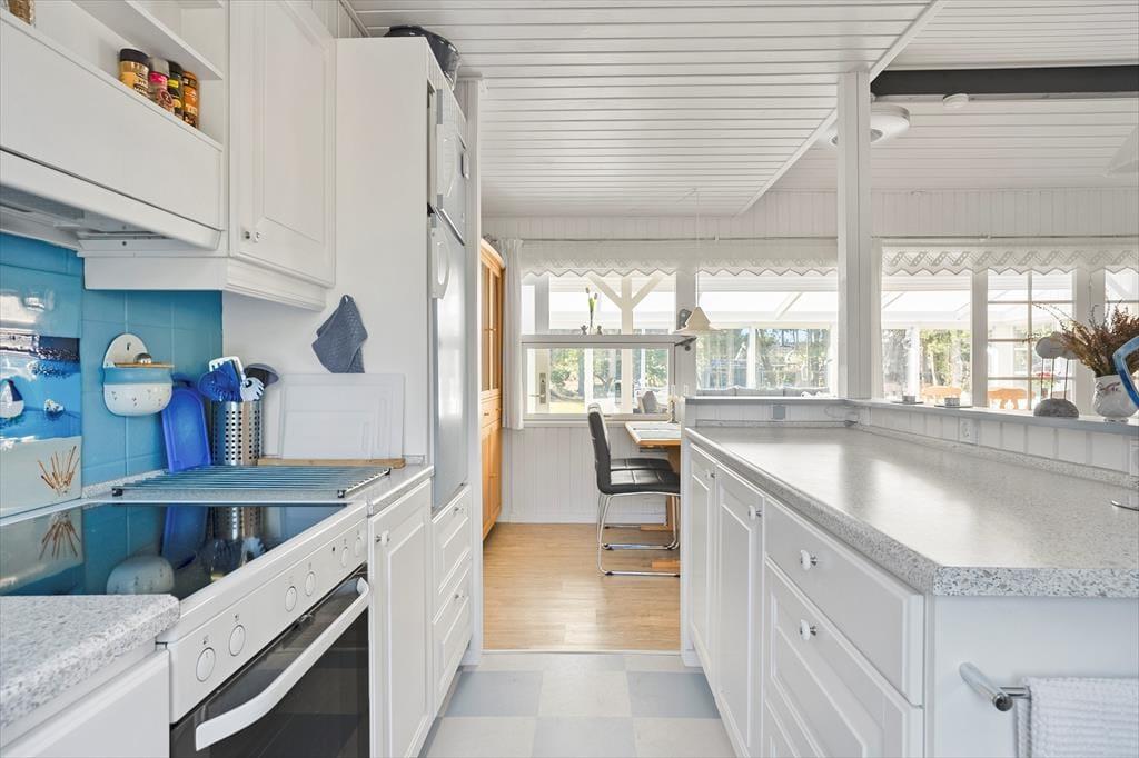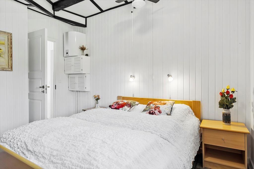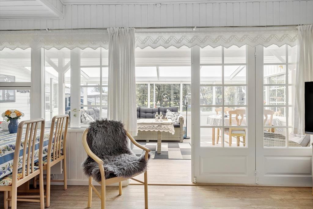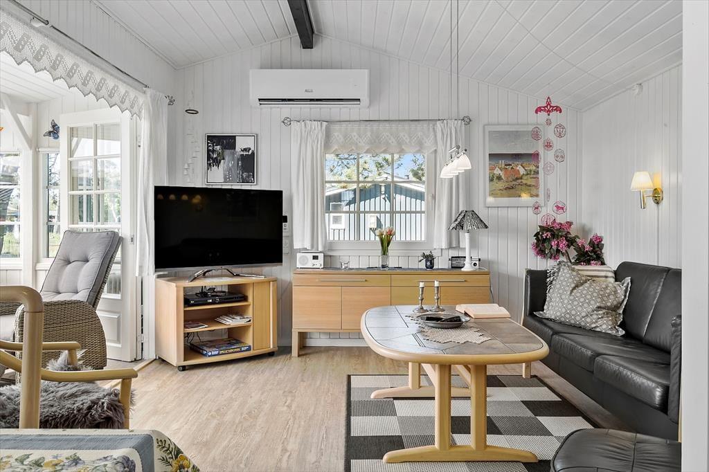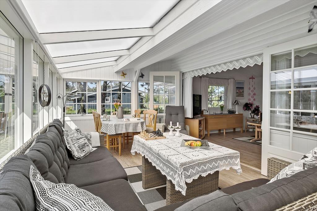 Når du træder indenfor i sommerhuset, bliver du mødt af en gennemført indretning med smagfulde detaljer, der emmer af skandinavisk charme. De lyse rum er indrettet med sans for hygge og komfort, og den åbne planløsning skaber en skøn forbindelse mellem køkkenet og stuen hvor de store vinduespartier sørger for en helt særlig atmosfære. Her kan du og dine nærmeste slappe af i sofaen med udsigt til haven, mens børnene hygger sig med en god film på fladskærmen, eller I kan fordybe jer i brætspil ved spisebordet, mens aftenens måltid simrer i køkkenet. Sommerhusets gode anneks giver jer ekstra fleksibilitet, da det kan bruges som hyggeligt sovested for de større børn eller som en privat krog til et vennepar, der er med på ferie.