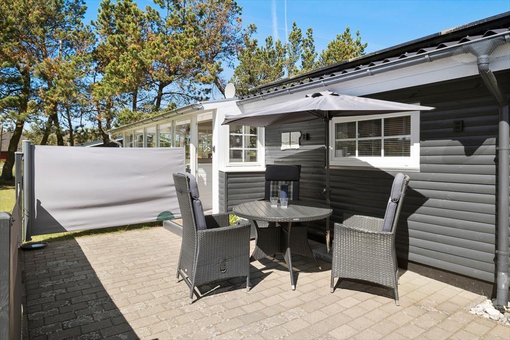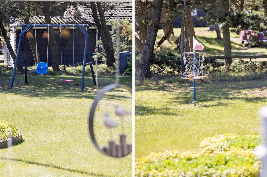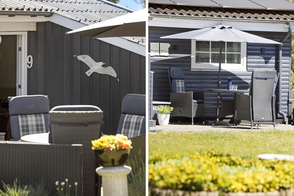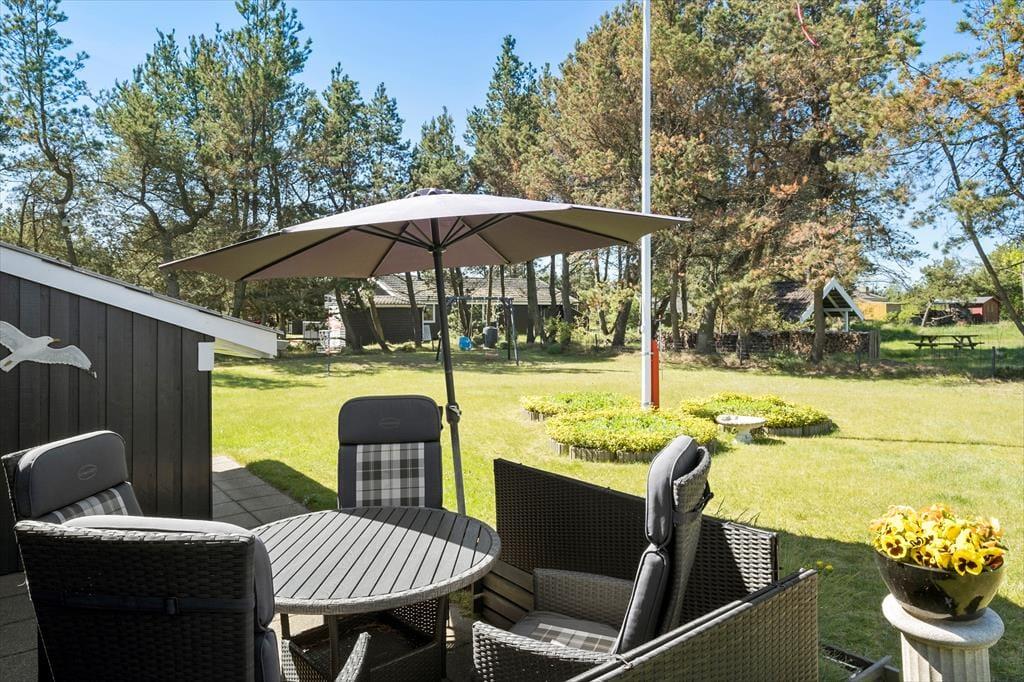 Udendørs venter en skøn, stor terrasse, hvor du kan bruge solrige dage og lune aftener i rolige og grønne omgivelser. Terrassen er anlagt, så du kan følge solens gang og finde lige præcis den plads, hvor du vil nyde dagens første kop kaffe eller en afslappet frokost. Om aftenen er grillen klar til at blive tændt, og her kan du lave alt fra friske majskolber til lækre steaks, mens familien leger på græsplænen eller slår sig ned i havemøblerne og nyder den fredelige atmosfære. Den fine have med græs og træer giver børnene rig mulighed for leg og aktiviteter i trygge omgivelser, og sommerhusets afslappede uderum inviterer til stille dage i naturens skød.