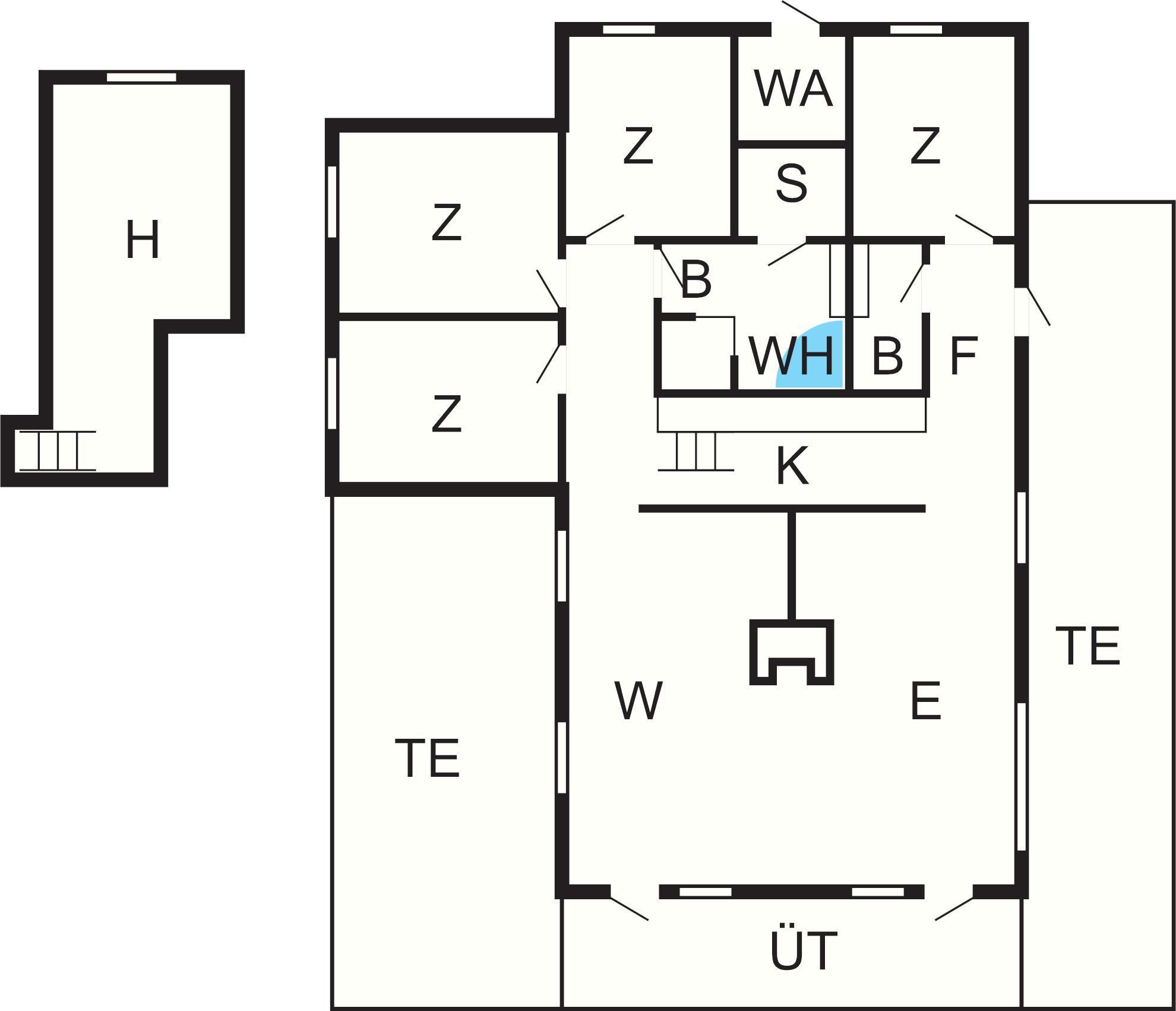 Und: Terrasse, überd. Terrasse, E-Heiz., Luft-Luft-Wärmepumpe, Naturgrundst. m. Bäumen 5100 m2, komfortable Möblierung, Ferienhausgebiet, Nichtraucherhaus