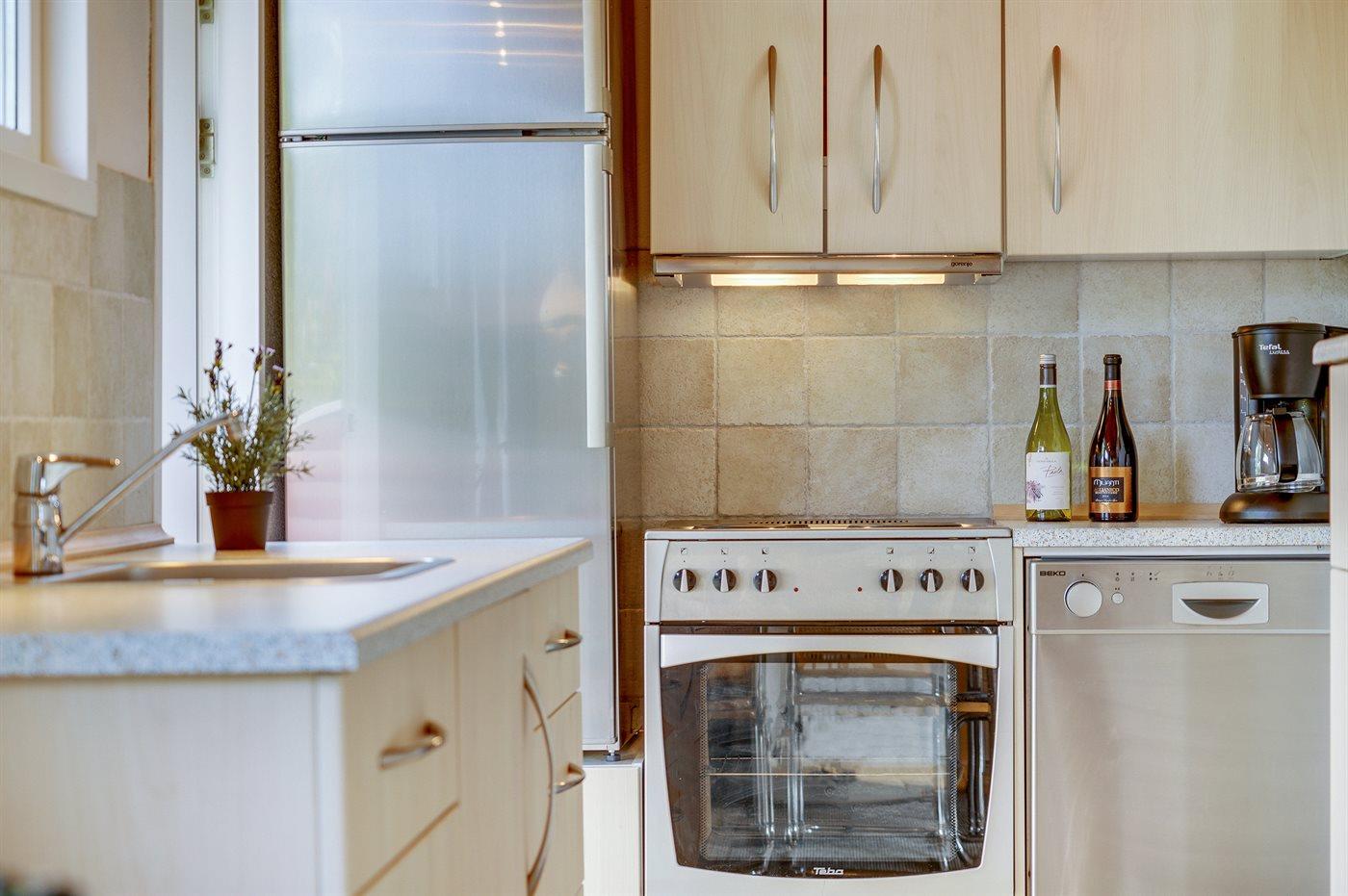Die Küche ist mit Kühlschrank ausgestattet. Außerdem gibt es 4 Keramik-Kochfelder, Umluftofen sowie Geschirrspüler.