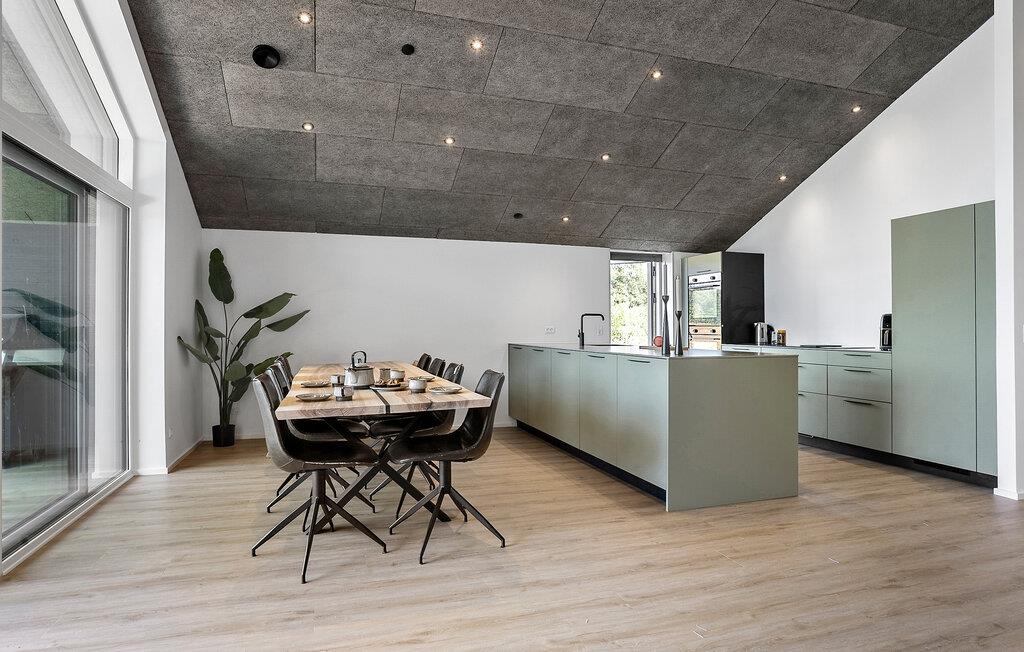 Dieses großzügige Haus verbindet stilvolle Eleganz mit wohnlichem Komfort und wird durch eine große Fensterfront von natürlichem Licht durchflutet. Während Sie in der modernen Küche leckere Mahlzeiten zaubern oder am hölzernen Esstisch Platz nehmen, genießen Sie den herrlichen Blick ins Grüne. Im Anschluss lädt das bequeme Sofa zu entspannten Stunden ein – ob bei einem guten Film oder einfach beim Zurücklehnen und Durchatmen.