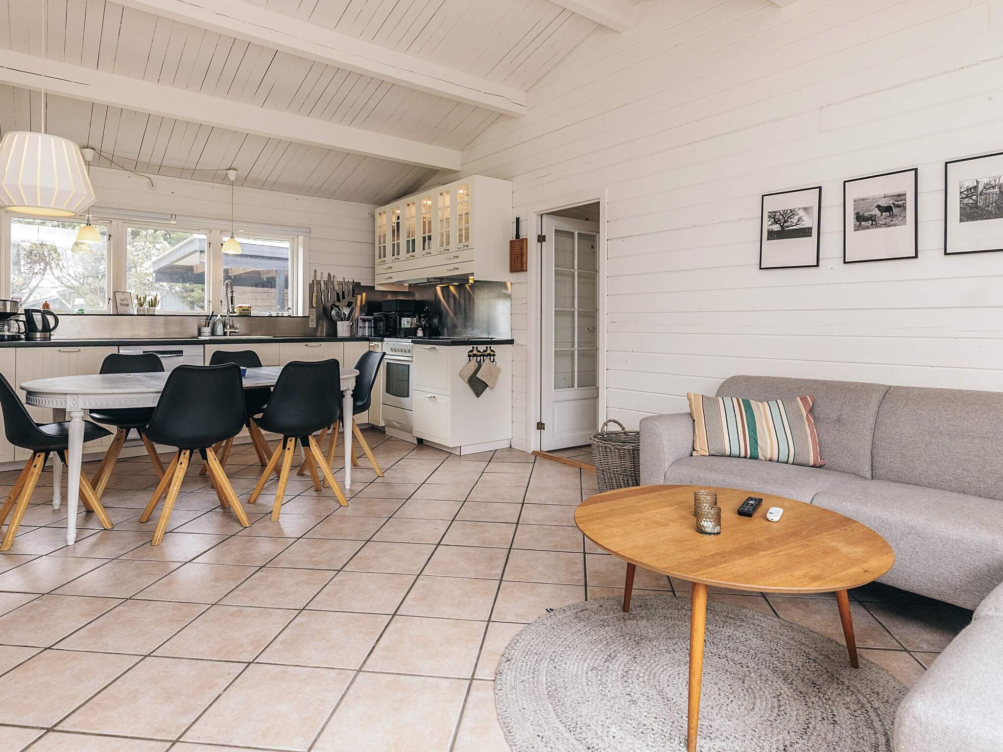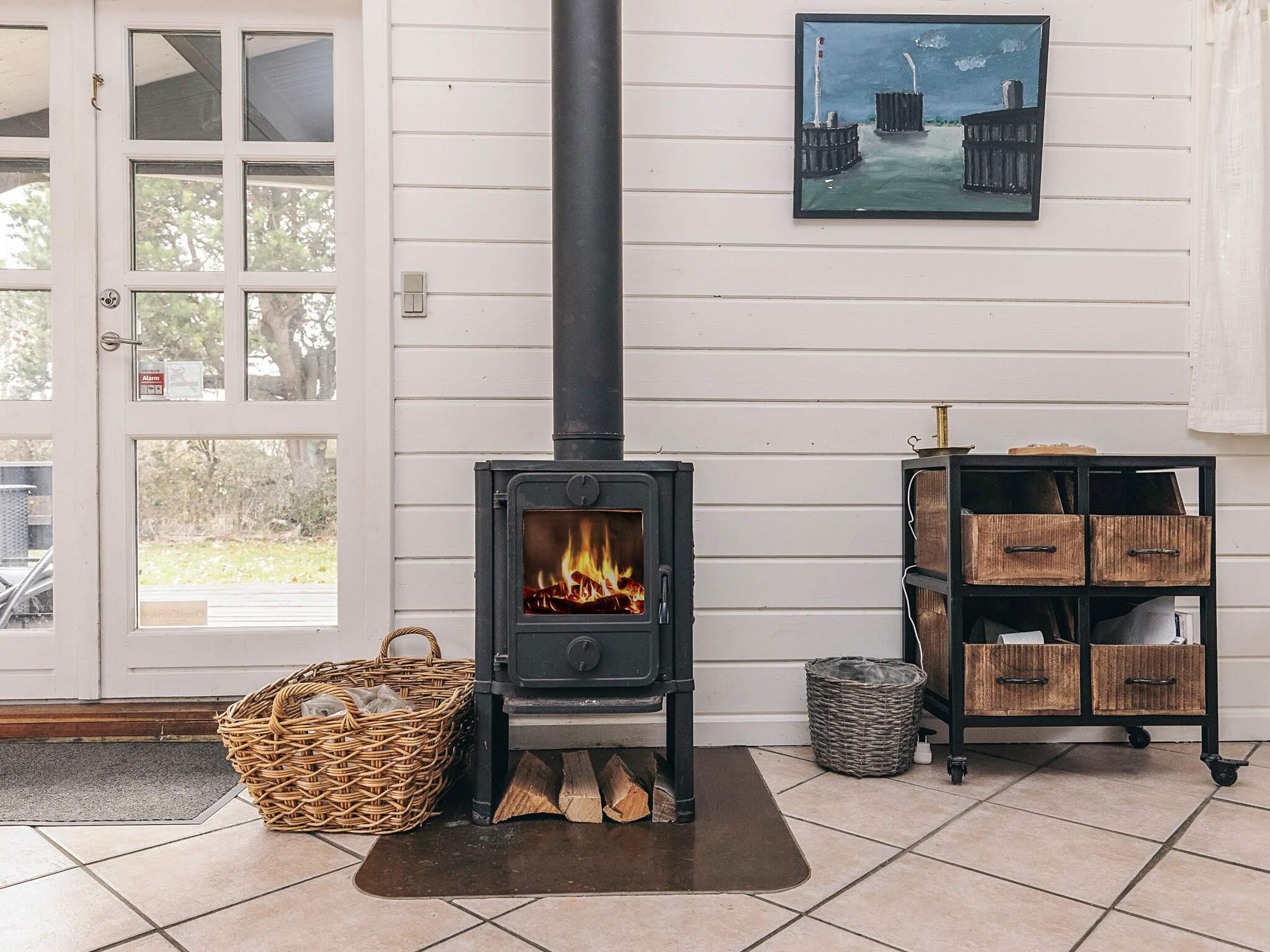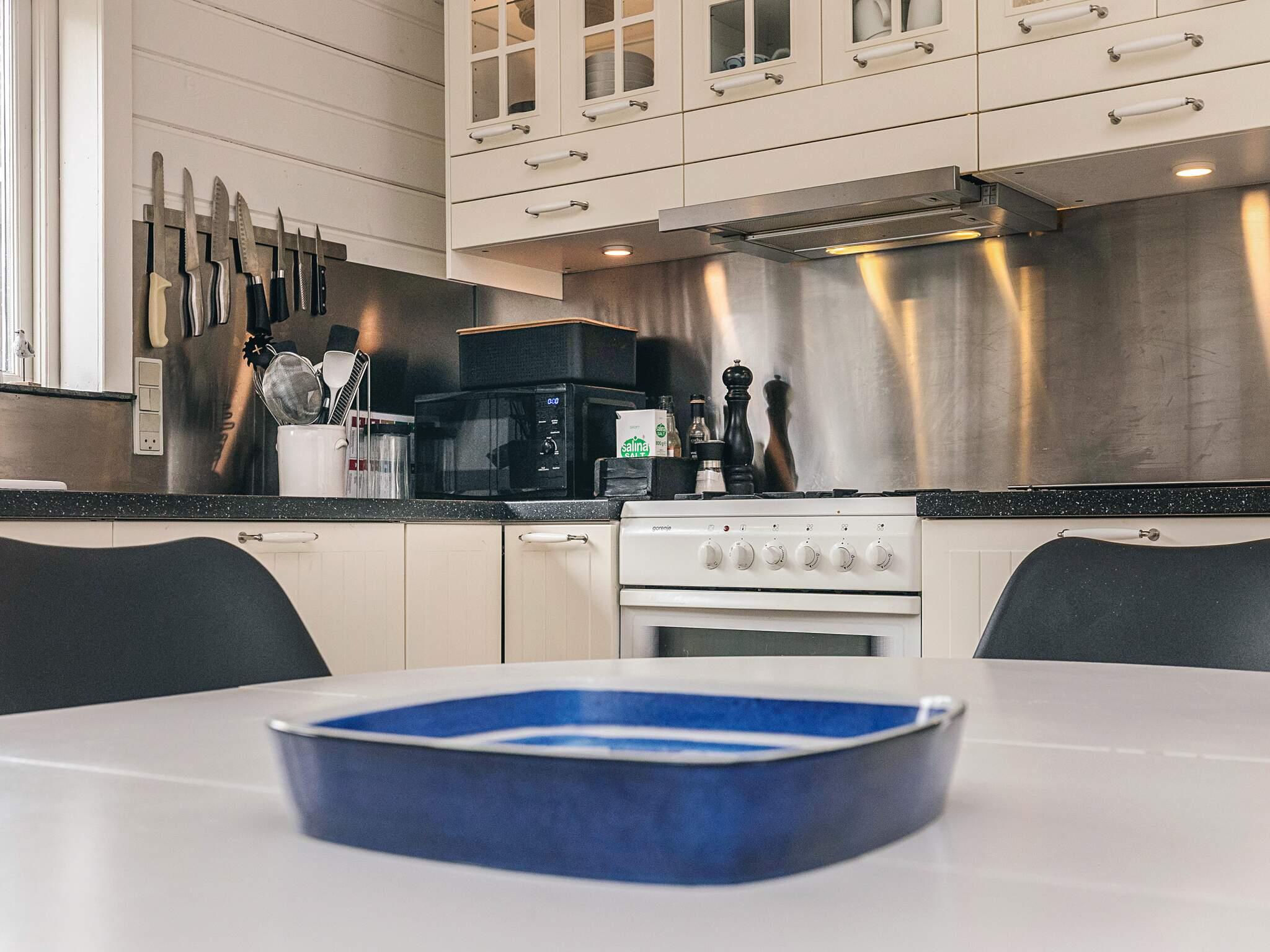 Im Haus befinden sich drei Schlafzimmer; eines mit Doppelbett, eines mit zwei Einzelbetten und ein 3. mit einem Einzelbett. Die offene Küche ist gut ausgestattet und verfügt unter anderem über einen Gasherd, eine Kaffeemaschine, eine Mikrowelle, einen Geschirrspüler und einen Gefrierschrank. Das Wohnzimmer verfügt über eine Wärmepumpe und einen Holzofen, einen Fernseher mit Chromecast und WLAN. Das Badezimmer ist mit Toilette, Waschbecken und Dusche ausgestattet. Vom Wohnzimmer aus haben Sie Zugang zur Terrasse und zum Garten.