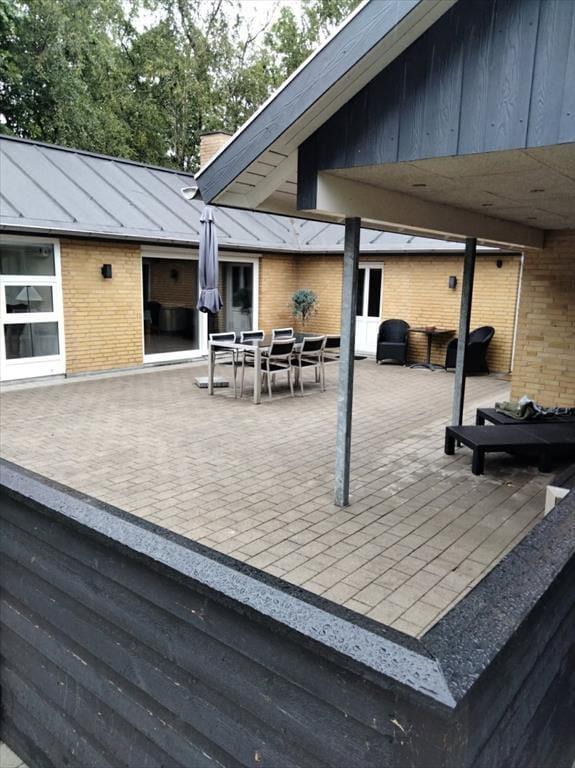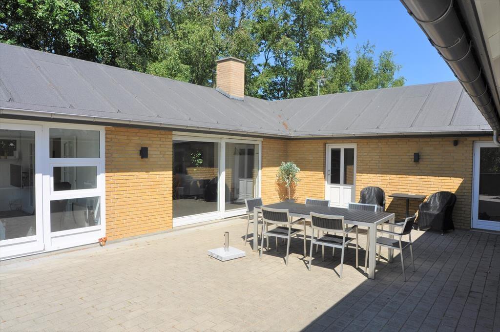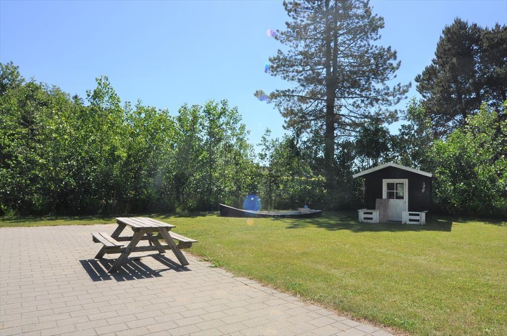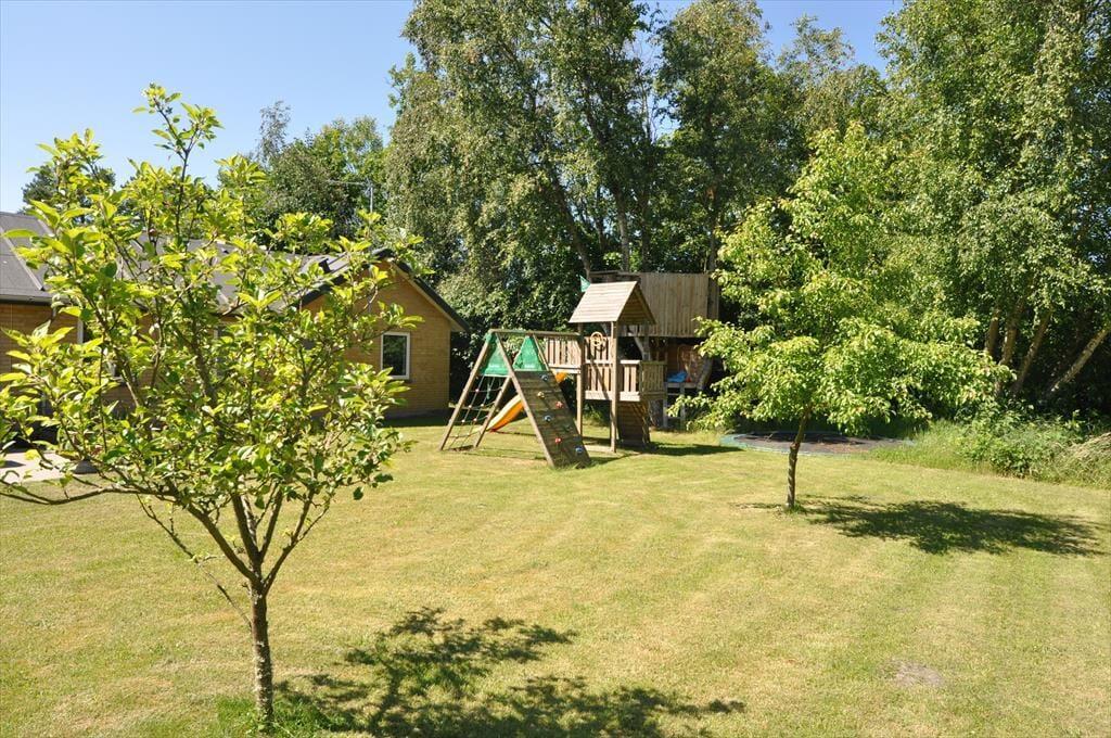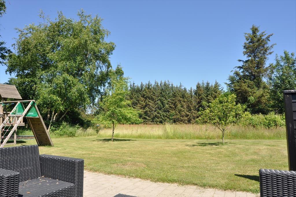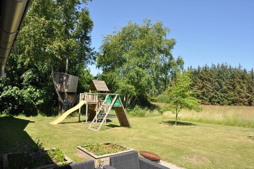 Drei Ausgänge machen es dir leicht, hinaus in den schönen, gen Süden gerichteten Innenhof zu treten. Hier kannst du dich wunderbar vor Wind geschützt in aller Ruhe niederlassen, die wärmenden Sonnenstrahlen und die frische Nordseeluft genießen. Während du es dir mit einem Kaffee und einem Buch gemütlich machst, wird dein Hund entspannt zu deinen Füßen liegen. Deine Kindern spielen derweil stundenlang auf dem Grundstück, auf dem ein Spielturm, eine Sandkiste und ein Spielhaus für Abwechslung sorgen. Alternative Aufenthaltsplätze bietet dir die schöne, gen Nordwesten weisende Terrasse, die mit Aussicht auf Felder und Bäume zu verzaubern weiß. Zwischen den Bäumen kannst du sogar den Fjord schimmern sehen.