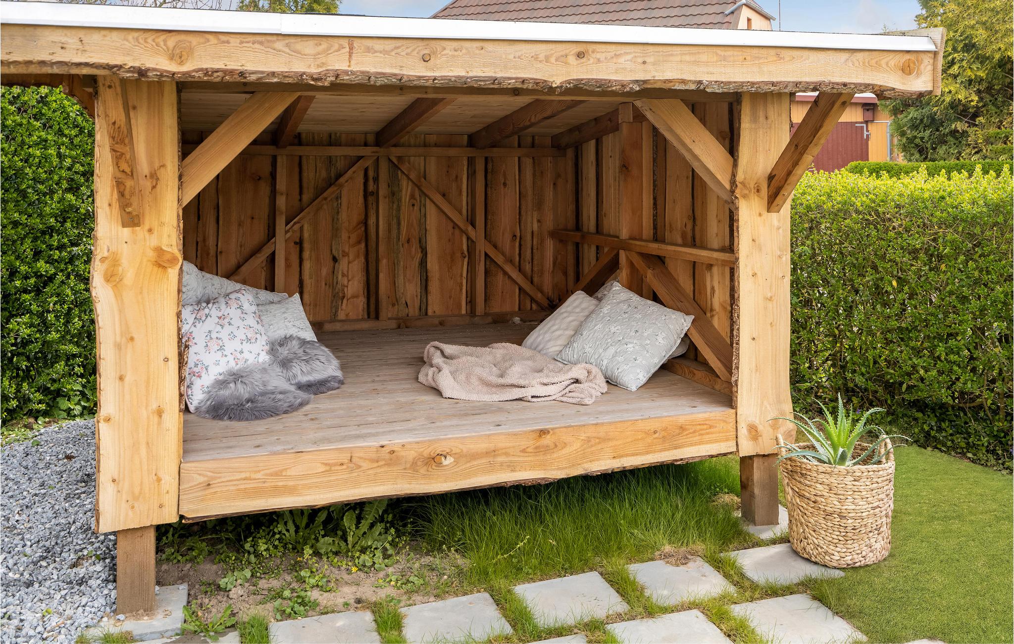 Draußen lädt die Terrasse zu entspannten Stunden im Freien ein. Grillen Sie mit der Familie und genießen Sie das Abendlicht über den Feldern. Der große Garten bietet Platz zum Spielen und Verweilen. Für besondere Erlebnisse sorgt die Shelter-Hütte auf dem Grundstück.