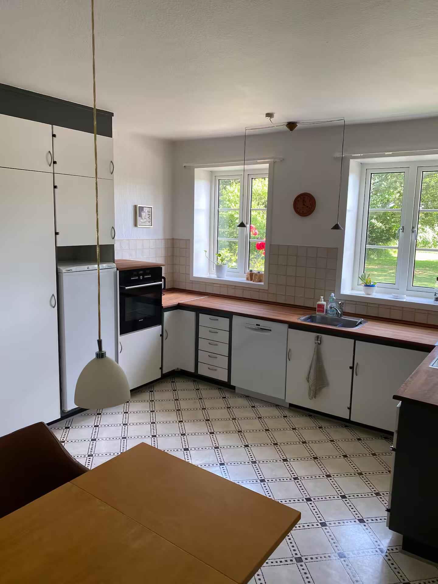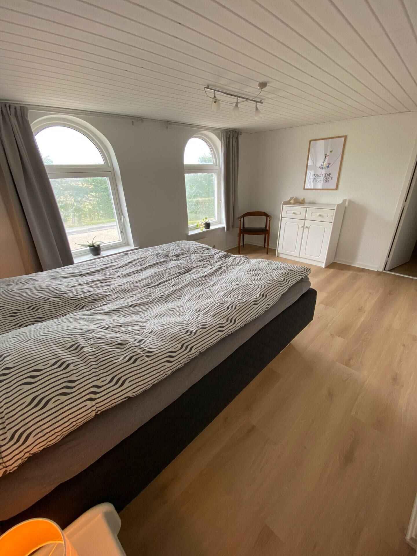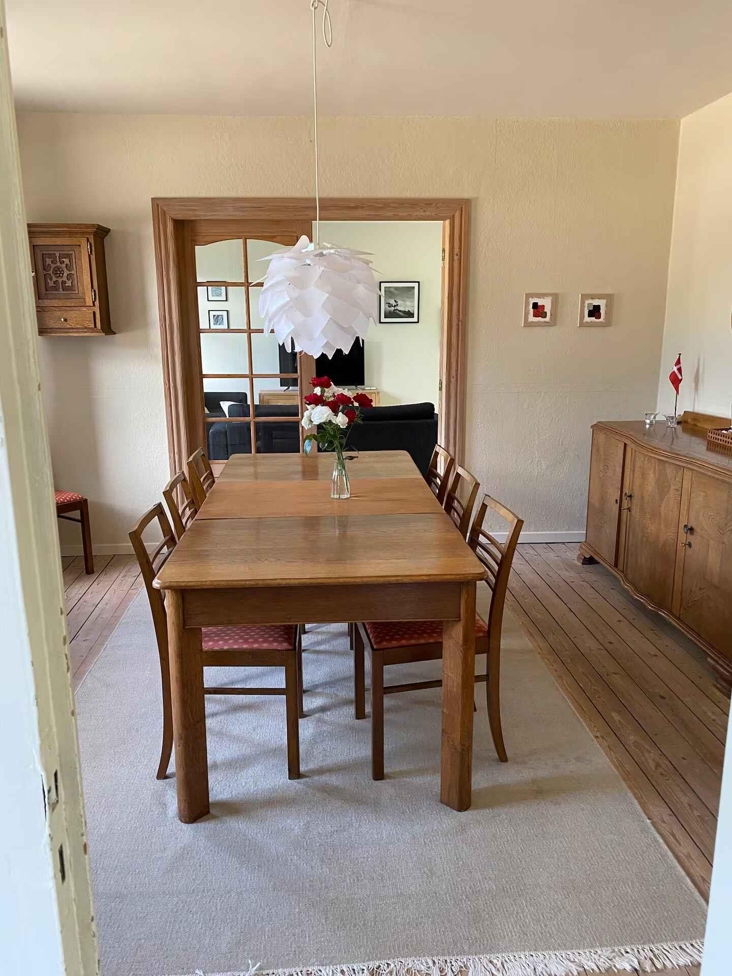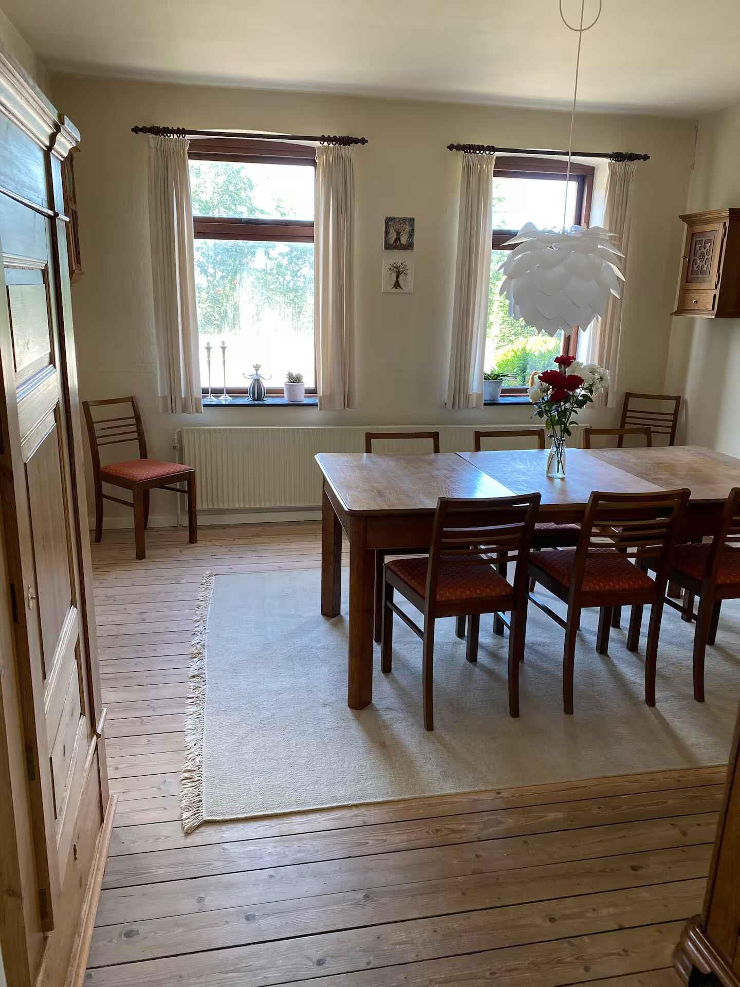 Ein Aufenthalt in diesem großzügigen Landhaus bietet Ruhe, Natur und viel Platz. Bis zu sechs Gäste können hier die friedliche Umgebung mit Blick auf den Frøslev-Wald genießen. Das 250 m² große Haus verbindet Funktionalität mit gemütlichen Wohnräumen und einladenden Außenbereichen. Die große Diele führt in einen praktischen Hauswirtschaftsraum mit direktem Zugang zur teilweise überdachten Terrasse. In der Küche gibt es Sitzplätze für fünf Personen, und im angrenzenden Esszimmer können bis zu acht Gäste gemeinsam speisen. Das Wohnzimmer ist hell, freundlich und mit zwei großen Sofas ausgestattet. Im Erdgeschoss befinden sich ein Badezimmer mit Badewanne und ein separates Gäste-WC. Im Obergeschoss liegen drei Schlafzimmer – zwei mit Doppelbetten (180 x 200 cm) und eines mit 160 x 200 cm – sowie ein großzügiger Flur. Vom Garten aus hat man freien Blick auf den Frøslev-Wald, perfekt für Spaziergänge oder Radtouren. Die vielen Wege machen die Umgebung ideal für Naturliebhaber und Familien, die Ruhe und frische Luft schätzen. Die Grenzregion bietet zudem Kultur und Geschichte: Flensburg, Museen und historische Stätten sind schnell erreicht – eine ideale Mischung aus Erholung, Natur und spannenden Ausflügen.