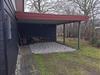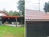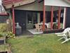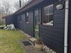 Gemütliches Ferienhaus mit überdachter Terrasse und großer Rasenfläche.