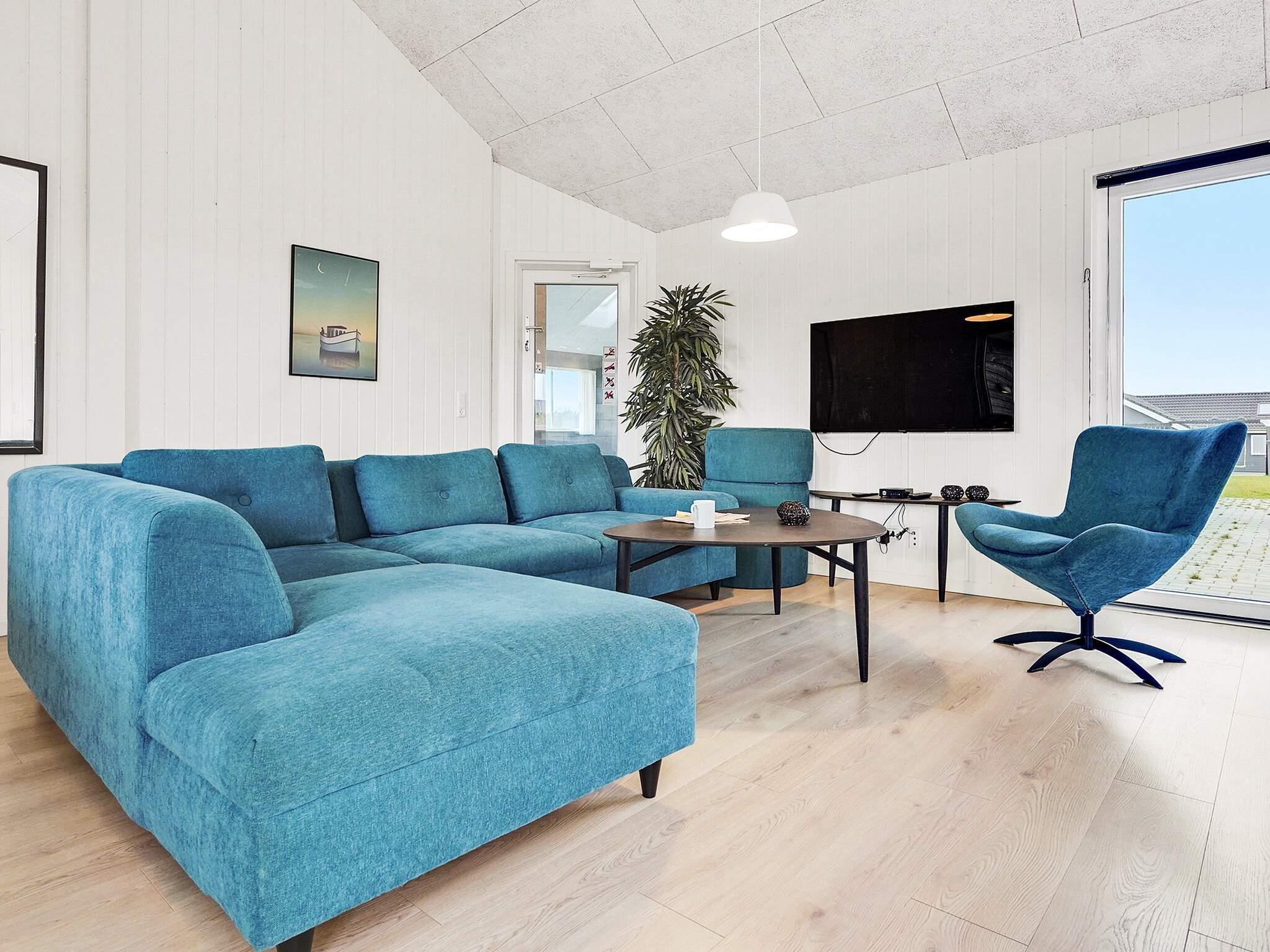 Das Feriendomizil ist optimal mit modernem Mobiliar eingerichtet, sehr geräumig und gut dimensioniert. Der geräumige Wohnbereich bietet Zugang zur Terrasse und bildet den natürlichen Mittelpunkt des Hauses. Hier stehen Ess- und Sitzecke sowie ein Holzofen für kühlere Abende bereit. Der Küchenbereich ist offen integriert.