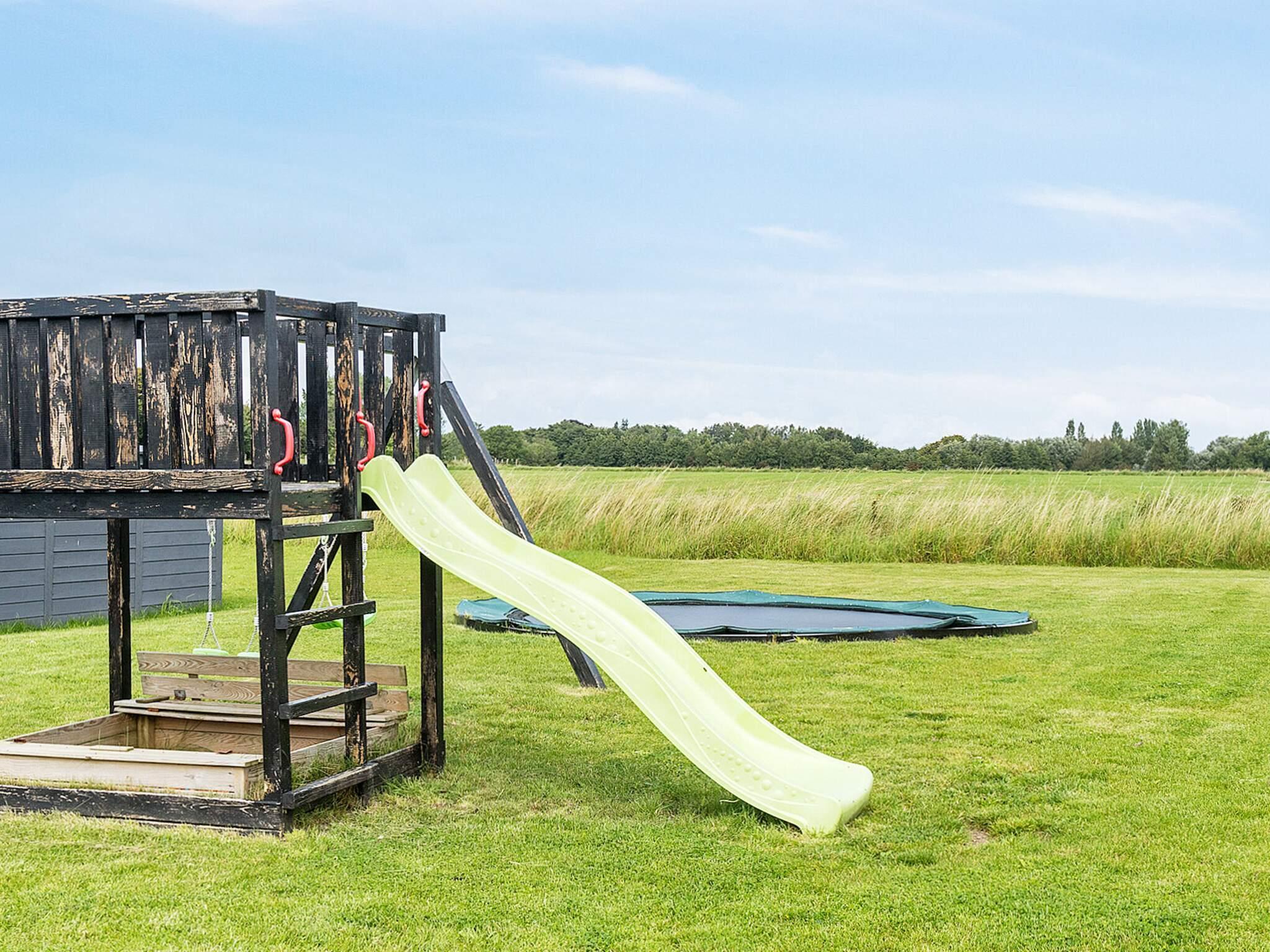 Die Kinder sind mit Schaukel, Kletterturm und Sandkasten beschäftigt. Außerdem steht ein Gartentrampolin bereit (Nutzung nur auf eigenes Risiko!).