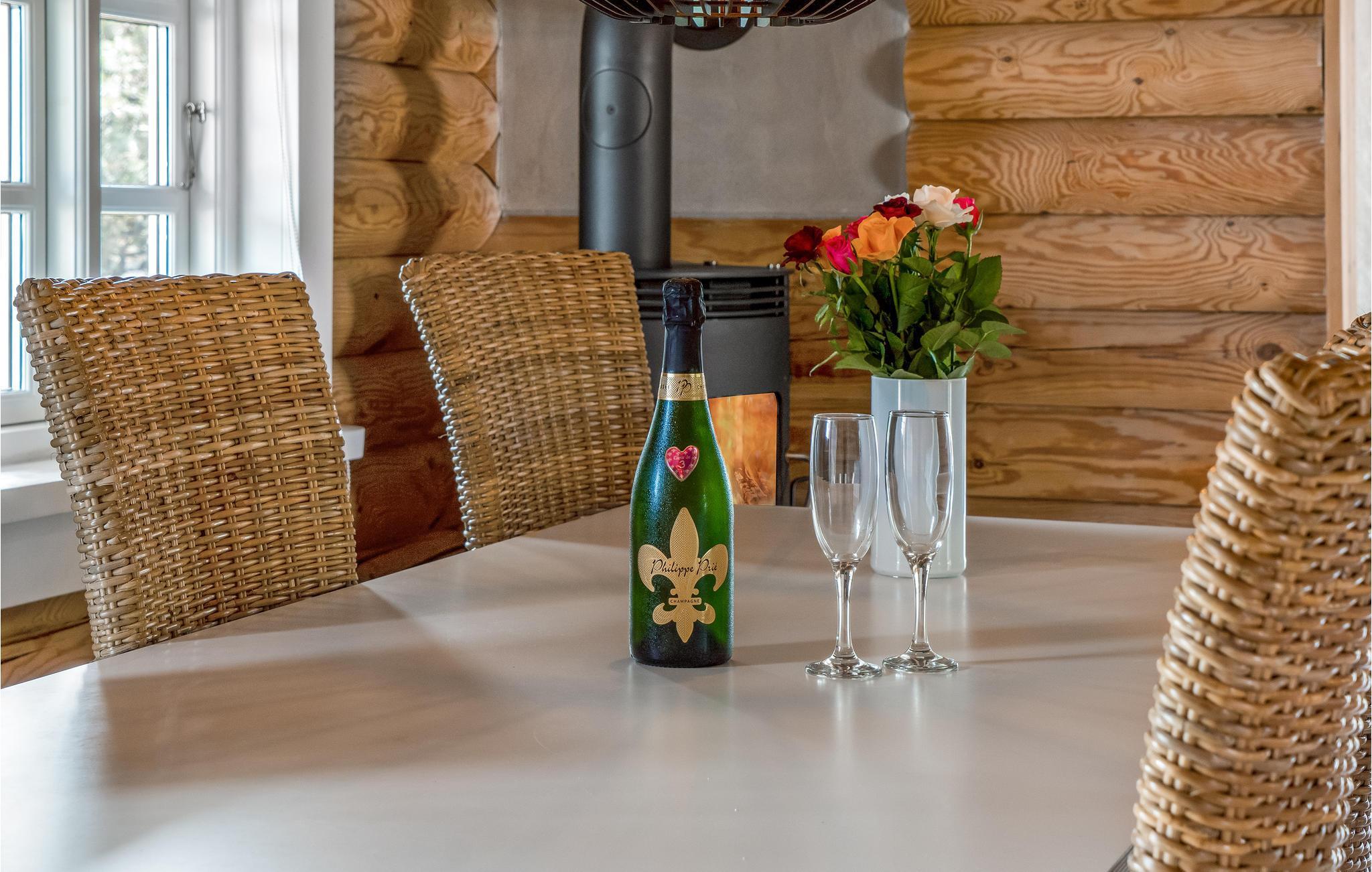 Gemütliches Blockhaus mit Whirlpool, zwei Kaminen und Meerblick.