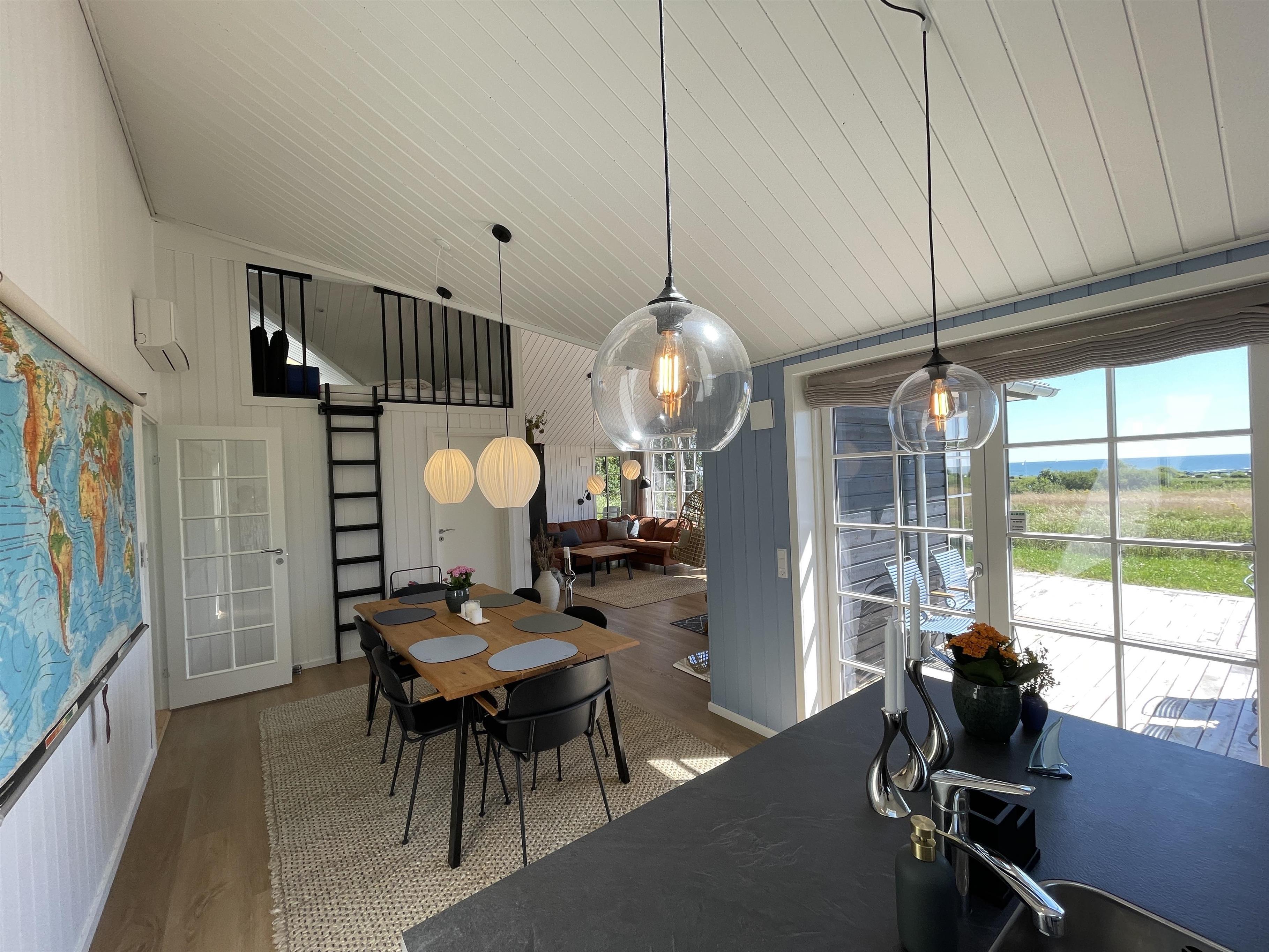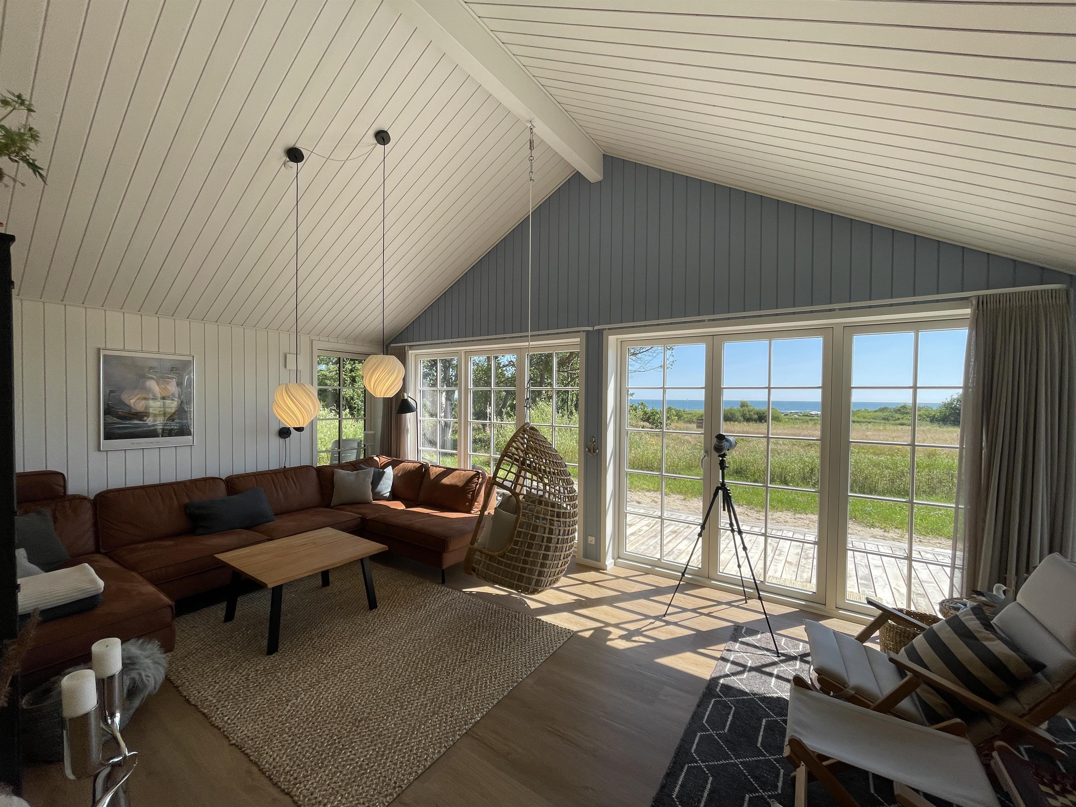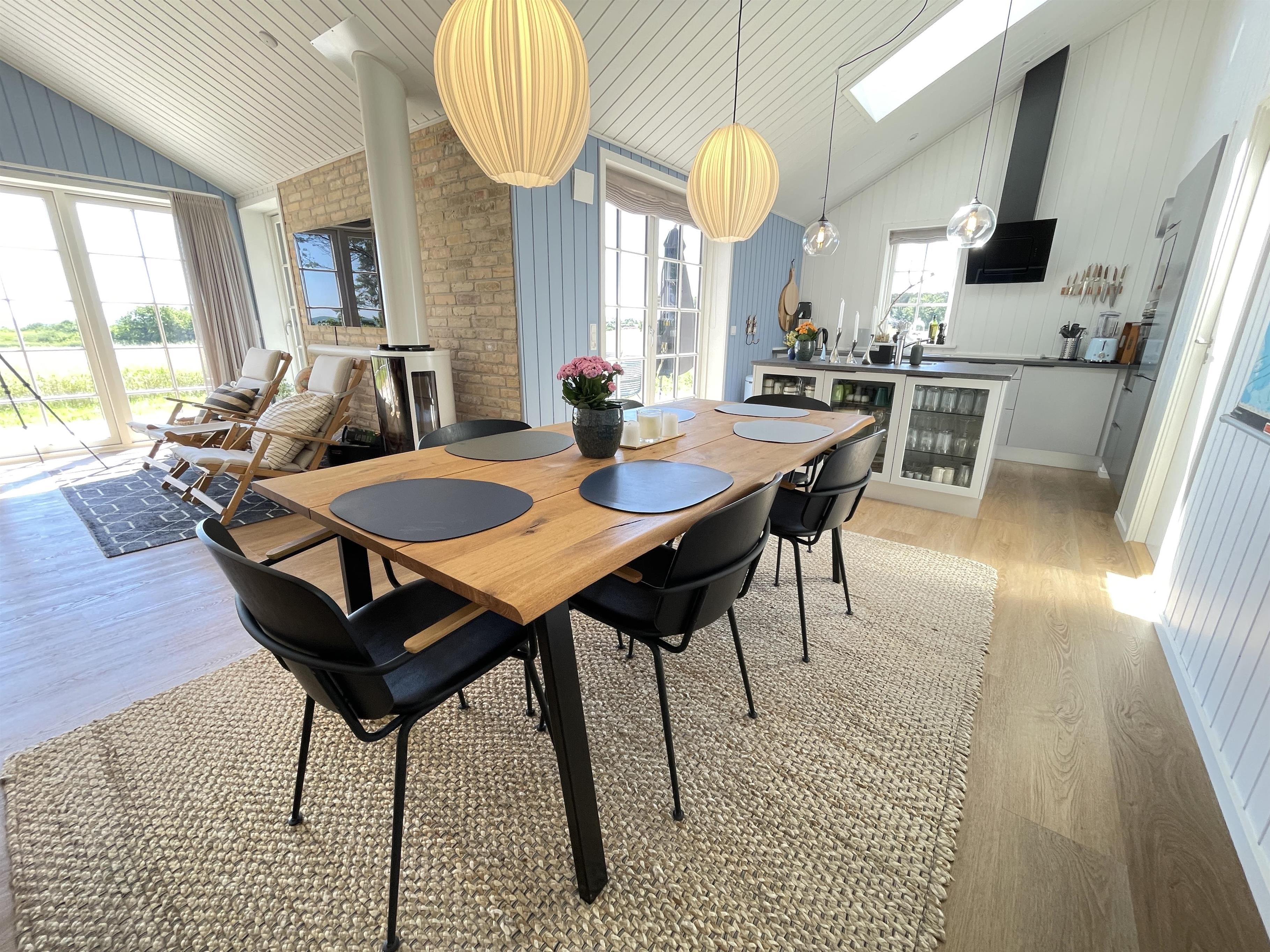 Beim Betreten des großen Gemeinschaftsraums gelangen Sie in die Küche, den Essbereich und das Wohnzimmer, die sich zu einem geräumigen Gemeinschaftsraum für die Gäste des Hauses vereinen. Große Fensterfronten öffnen den Blick auf das spektakuläre Kattegat, und viel Licht durchflutet das exklusive und rustikale Interieur des Wohnzimmers. Das große luxuriöse Sofa lädt zu gemütlichen Momenten ein, begleitet von einem knisternden Kaminofen im Hintergrund.