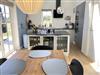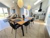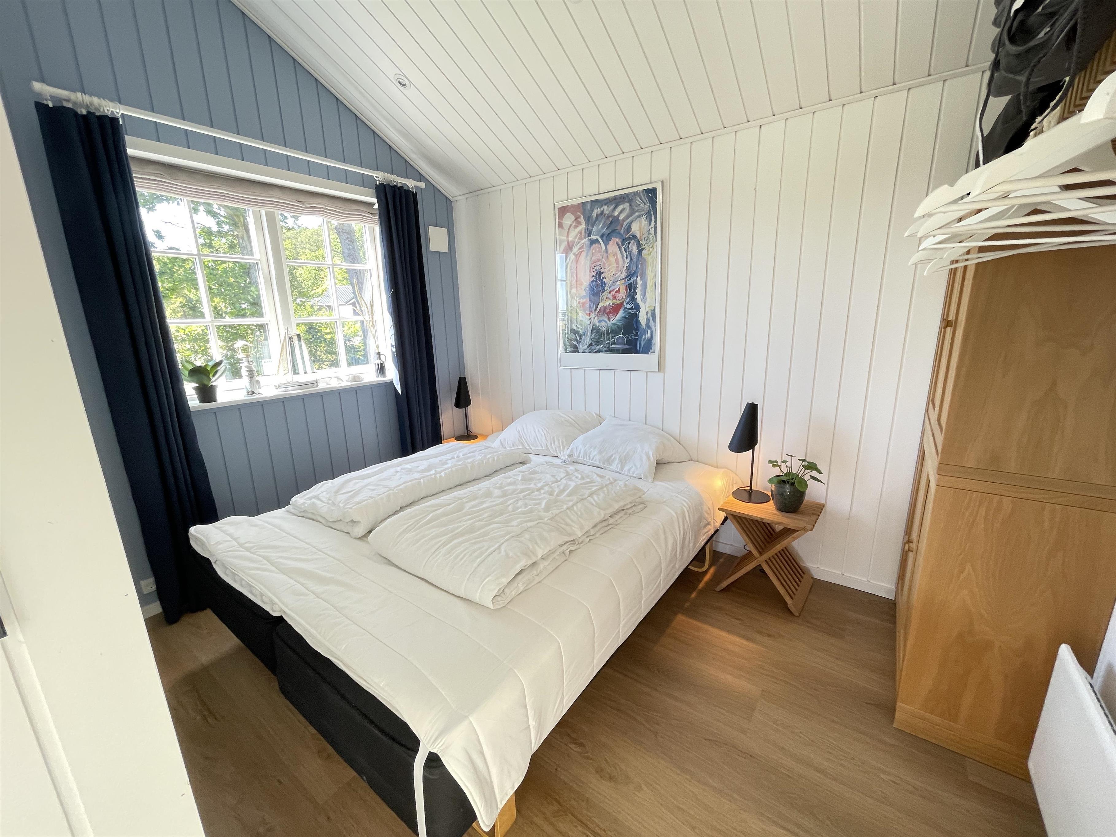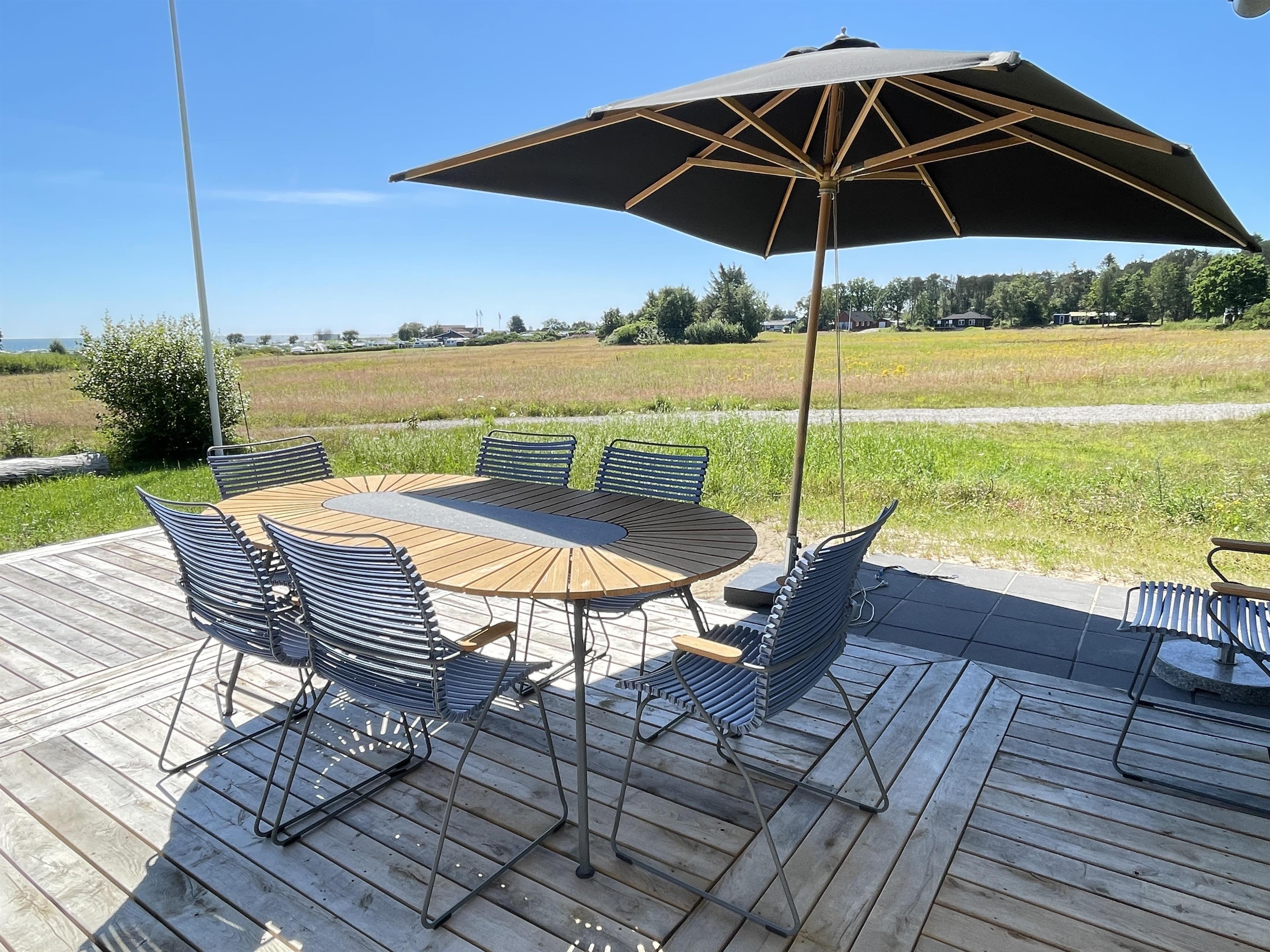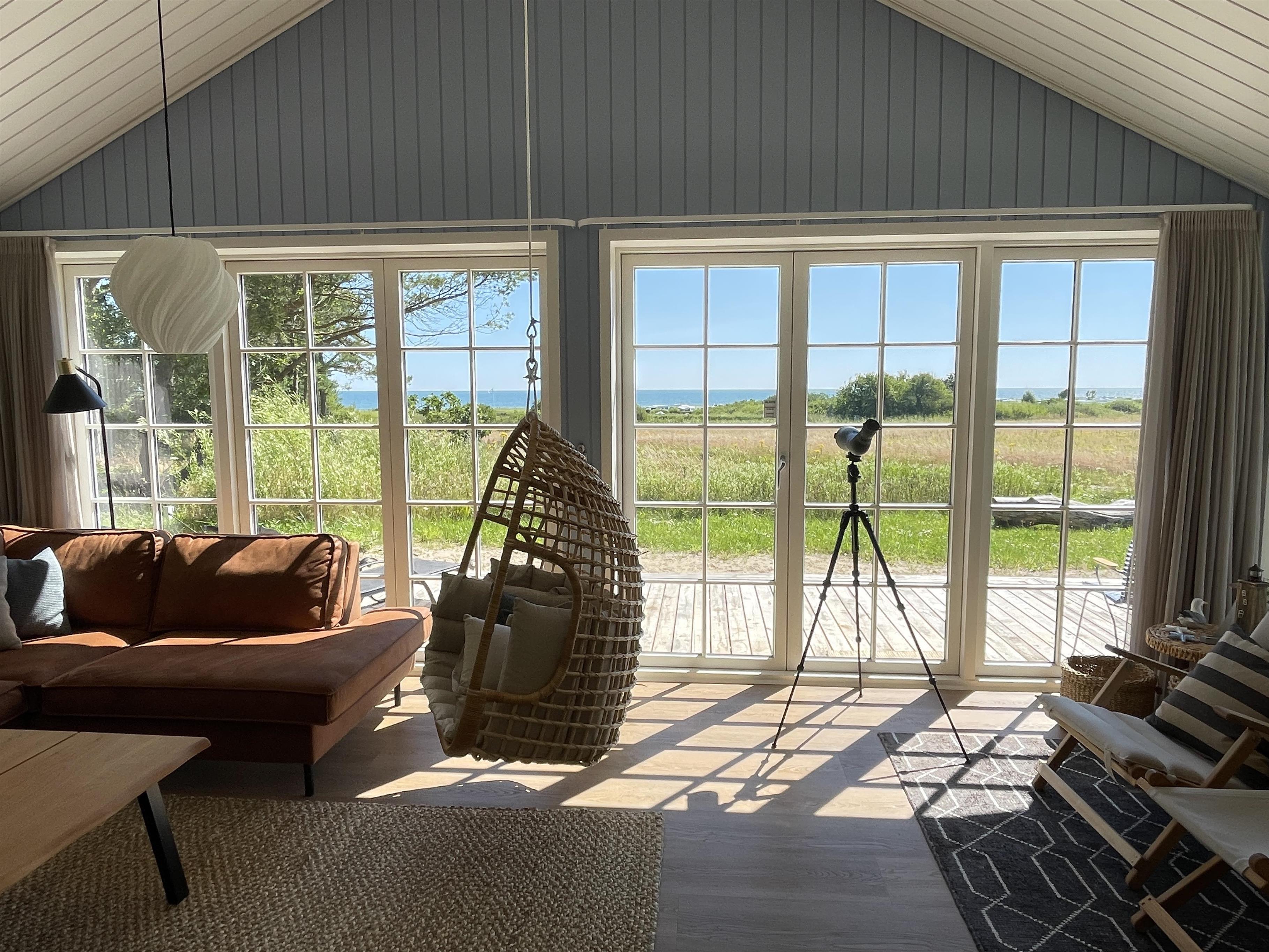 Beim Betreten des großen Gemeinschaftsraums gelangen Sie in die Küche, den Essbereich und das Wohnzimmer, die sich zu einem geräumigen Gemeinschaftsraum für die Gäste des Hauses vereinen. Große Fensterfronten öffnen den Blick auf das spektakuläre Kattegat, und viel Licht durchflutet das exklusive und rustikale Interieur des Wohnzimmers. Das große luxuriöse Sofa lädt zu gemütlichen Momenten ein, begleitet von einem knisternden Kaminofen im Hintergrund.