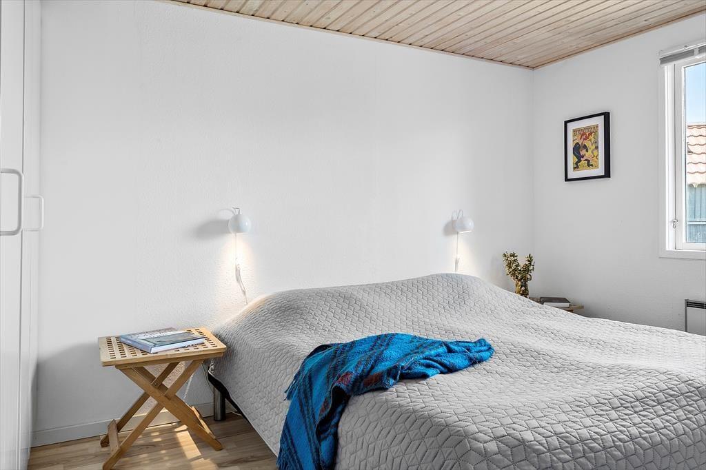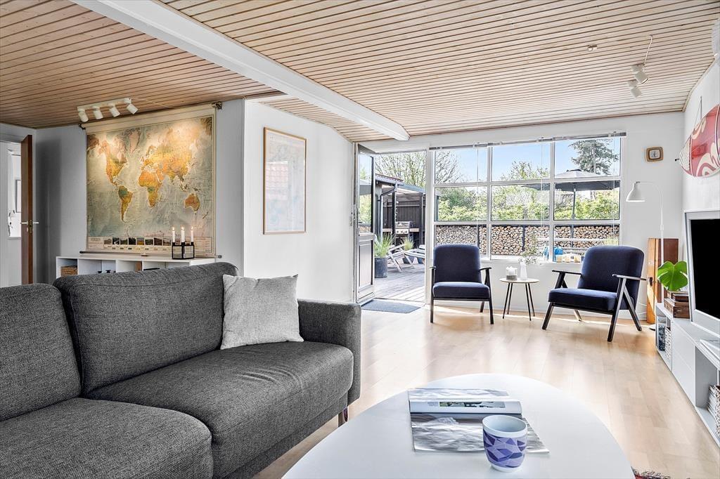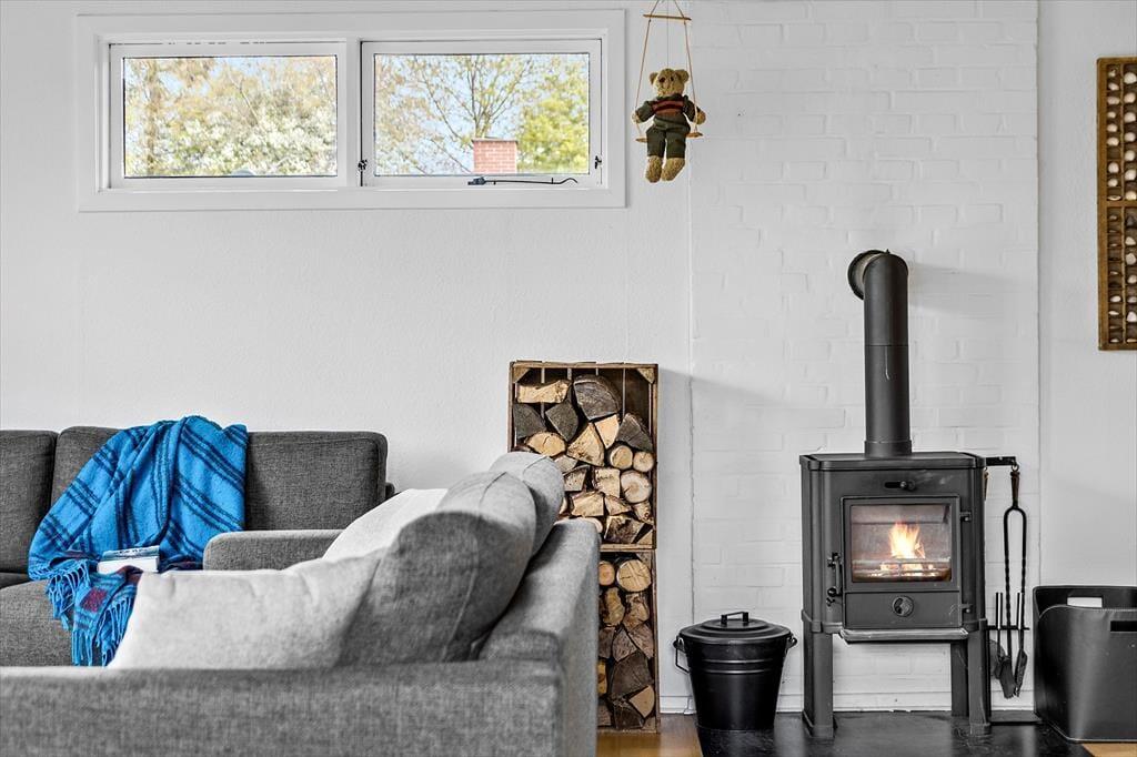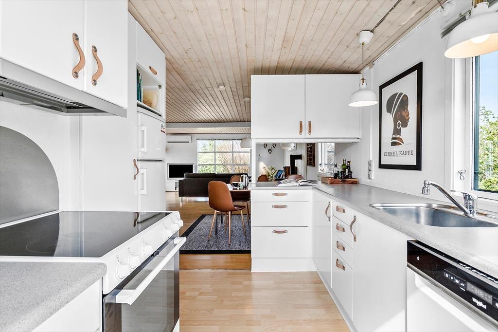 Sobald Sie den großen, hellen Wohnraum betreten, werden Sie die Seele und der Charme dieses Hauses in den Bann ziehen. Sie werden das Gefühl verspüren, dass Sie in diesem Urlaubsdomizil wunderbar aufgehoben sind. Der Kamin sorgt im gemütlichen Wohnraum und in der direkt angrenzenden, offenen Küche für heimelige Wärme und ein Maximum an echter dänischer Ferienhausstimmung. Das Ferienhaus verfügt zudem über eine Wärmepumpe mit Kühlfunktion. In der Küche treffen Sie auf einen Induktionsherd und einen Geschirrspüler. Von hier aus gelangen Sie außerdem hinaus in den Garten an der östlichen Hausseite. Die drei vorhandenen Schlafräume sind allesamt über einen Flur zugänglich und empfangen Sie mit jeweils einem Doppelbett.