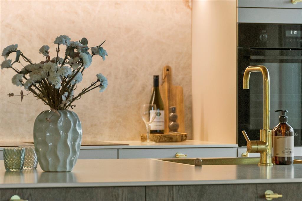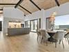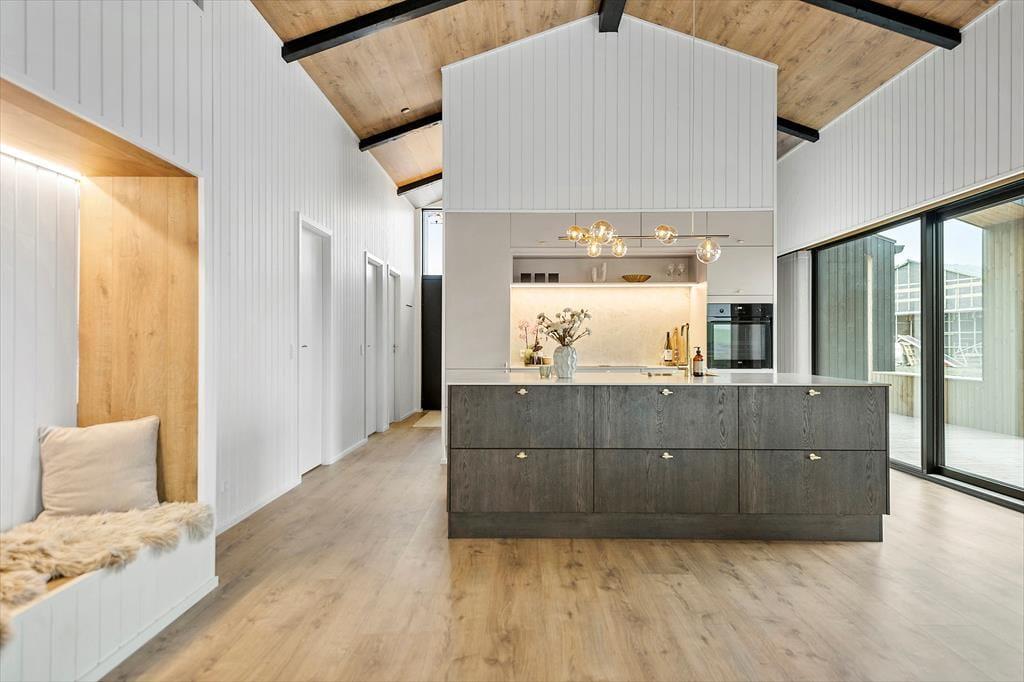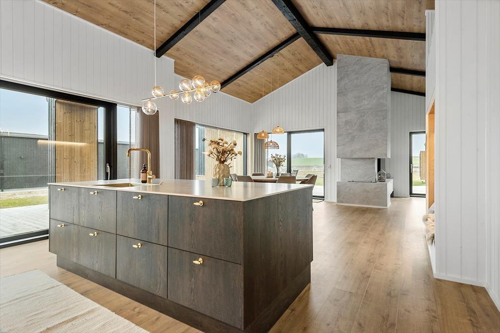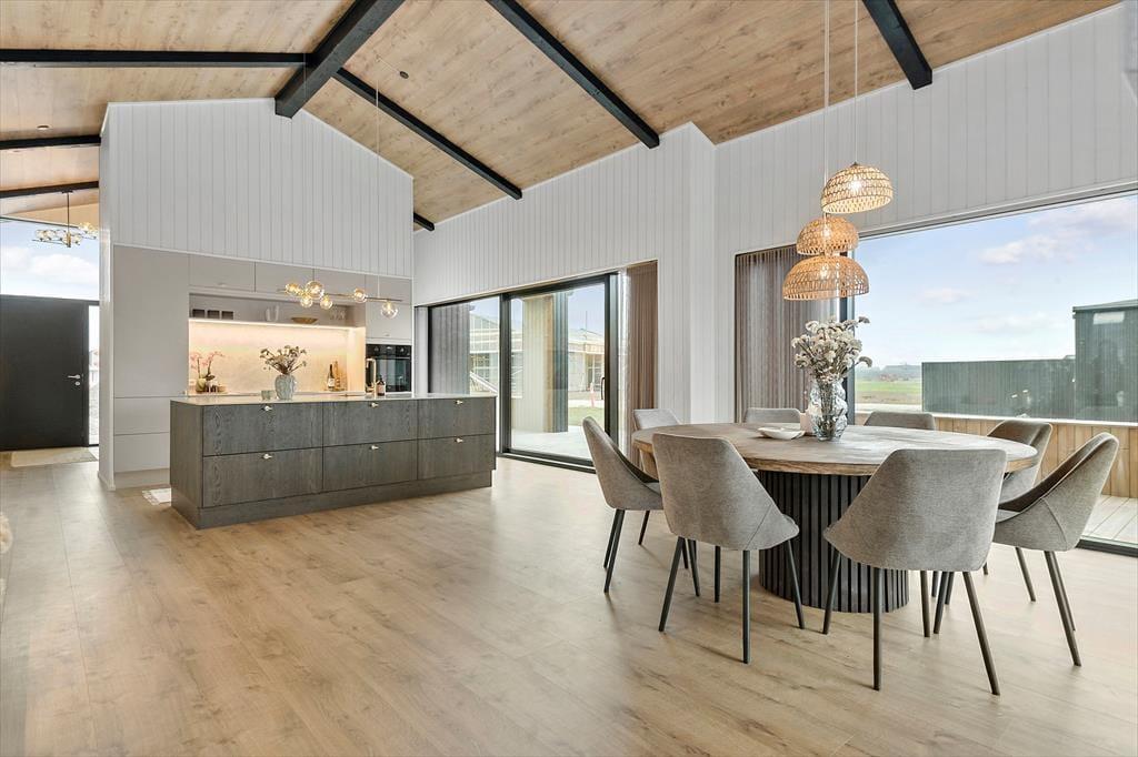 Die offene, großzügige Küche lädt dazu ein, gemeinsam zu kochen, den Tisch zu decken oder einfach auf dem Sofa zu entspannen. Und wenn der Tag sich dem Ende neigt, können Sie es sich auf dem Sofa mit einem Film gemütlich machen und den sanften Abendhimmel genießen.