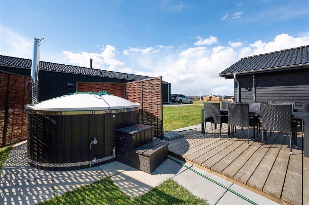 Das Ferienhaus öffnet sich zu einer großen Terrasse und einem Garten, der reichlich Platz für Entspannung und Bewegung bietet. Hier lassen sich Mahlzeiten unter freiem Himmel wunderbar genießen, die Tage können langsam beginnen und abends kann der Grill die Wärme des Sommers verlängern. Der Badezuber lädt zu ruhigen Momenten unter dem Sternenhimmel ein, und Spa und Sauna schenken tiefe Erholung zu jeder Jahreszeit. Der Garten bietet Raum für Spiel, für sonnige Ruhepausen und für die Augenblicke, in denen du einfach die frische Luft der Küste spürst.