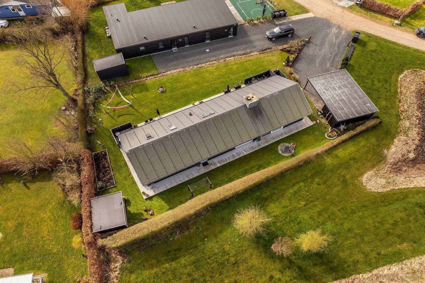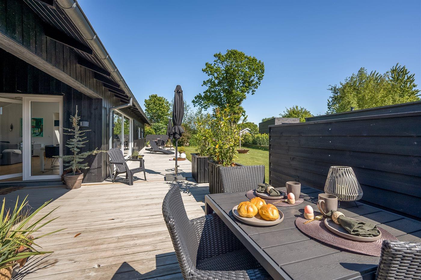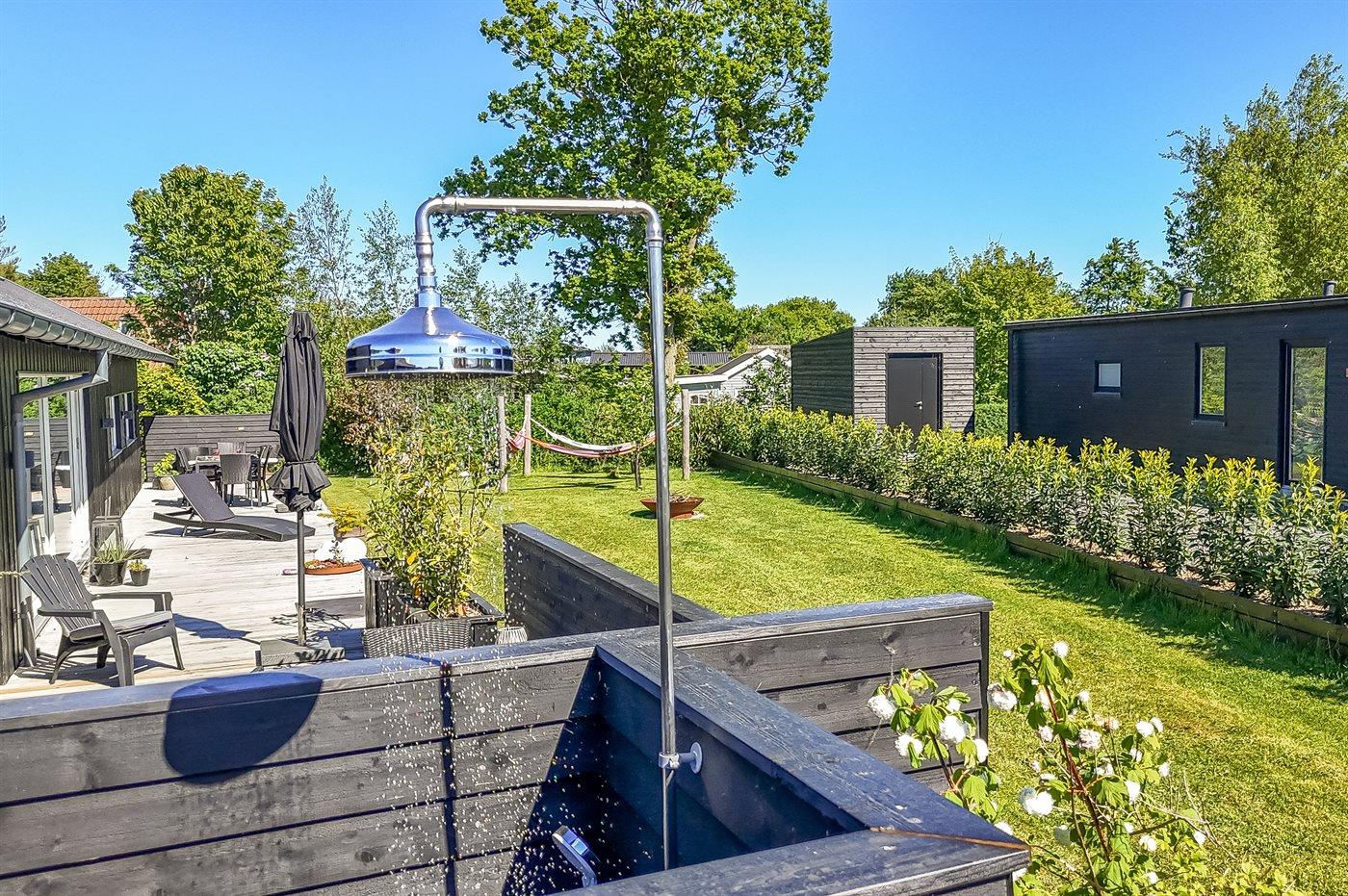 Die Ferienunterkunft liegt auf einem 820 m² großen Gartengrundstück. Die Entfernung zum Meer beträgt 300 m. Die Entfernung zum Fjord beträgt 2000 m. Die Entfernung zu einem See beträgt 25 m. Die nächste Einkaufsmöglichkeit liegt 1000 m entfernt. In einem Abstand von 5000 m gibt es einen Golfplatz. Es steht ein offenes Terrassenareal zur Verfügung. Außerdem gibt es überdachte Terrasse. Die Entfernung zu einem Spielplatz beträgt 300 m.Lagerfeuerstelle. Windschutzhütte. Außendusche. An Sommerabenden sorgt der Außenkamin für eine gemütliche Atmosphäre. Es steht ein Grill zur Verfügung. Es steht ein Carport zur Verfügung. Es ist ein Ladestecker für Elektroautos installiert. Ladestecker Typ 2. Mit einer Ladeleistung von 11 kW. Parkplatz auf dem Grundstück.