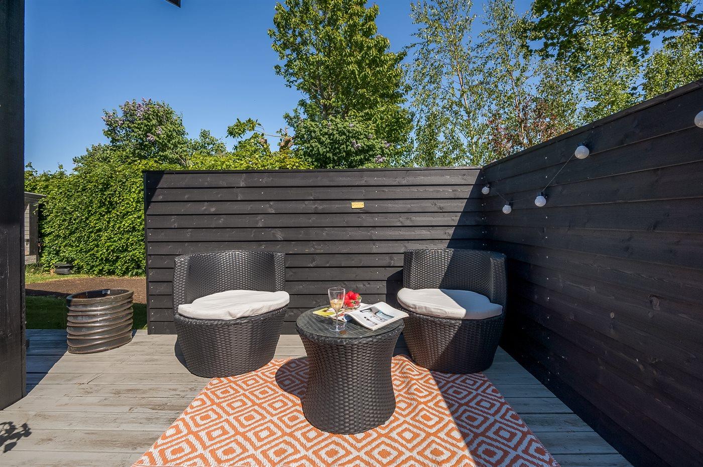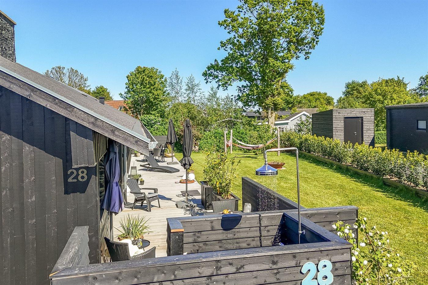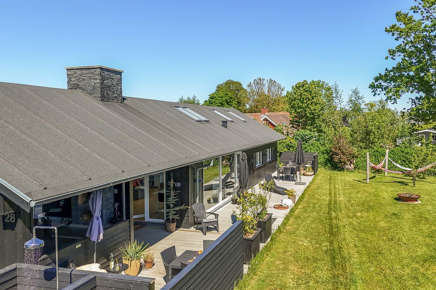 Die Ferienunterkunft liegt auf einem 820 m² großen Gartengrundstück. Die Entfernung zum Meer beträgt 300 m. Die Entfernung zum Fjord beträgt 2000 m. Die Entfernung zu einem See beträgt 25 m. Die nächste Einkaufsmöglichkeit liegt 1000 m entfernt. In einem Abstand von 5000 m gibt es einen Golfplatz. Es steht ein offenes Terrassenareal zur Verfügung. Außerdem gibt es überdachte Terrasse. Die Entfernung zu einem Spielplatz beträgt 300 m.Lagerfeuerstelle. Windschutzhütte. Außendusche. An Sommerabenden sorgt der Außenkamin für eine gemütliche Atmosphäre. Es steht ein Grill zur Verfügung. Es steht ein Carport zur Verfügung. Es ist ein Ladestecker für Elektroautos installiert. Ladestecker Typ 2. Mit einer Ladeleistung von 11 kW. Parkplatz auf dem Grundstück.