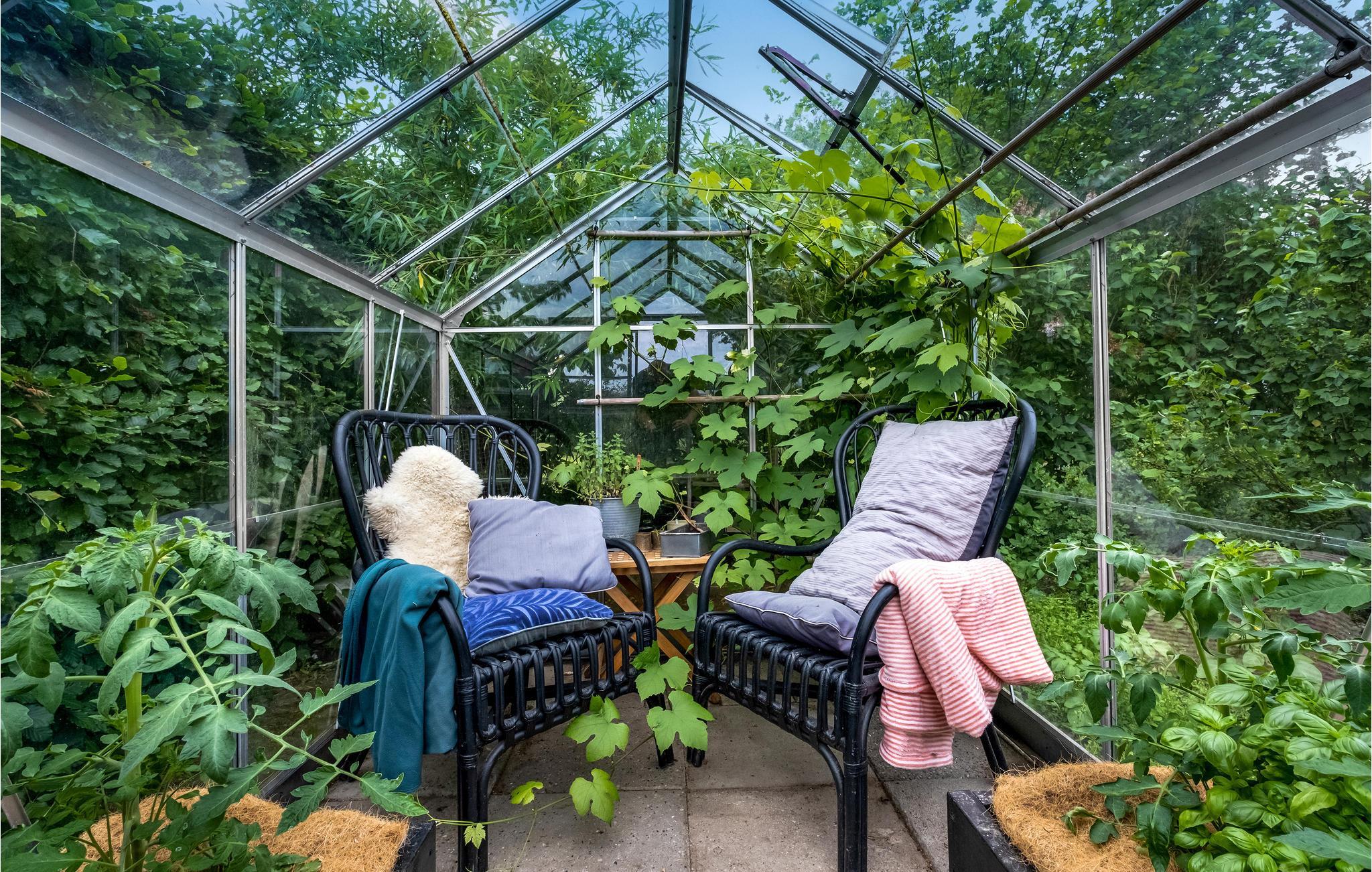 Draußen finden Sie eine Terrasse mit Loungemöbeln, wo Sie das sommerliche Wetter richtig genießen können. Im gepflegten Garten finden Sie und Ihre Kinder mehrere gemütliche Ecken und viel Platz zum Spielen. Genießen Sie die idyllische, abendliche Atmosphäre am Gartentisch oder im charmanten Gewächshaus und lassen Sie den Tag herrlich ausklingen.