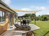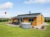 Modernes, CO2-neutrales Ferienhaus mit Holzterrasse und Badezuber nahe dem weißen Strand von Saksild.