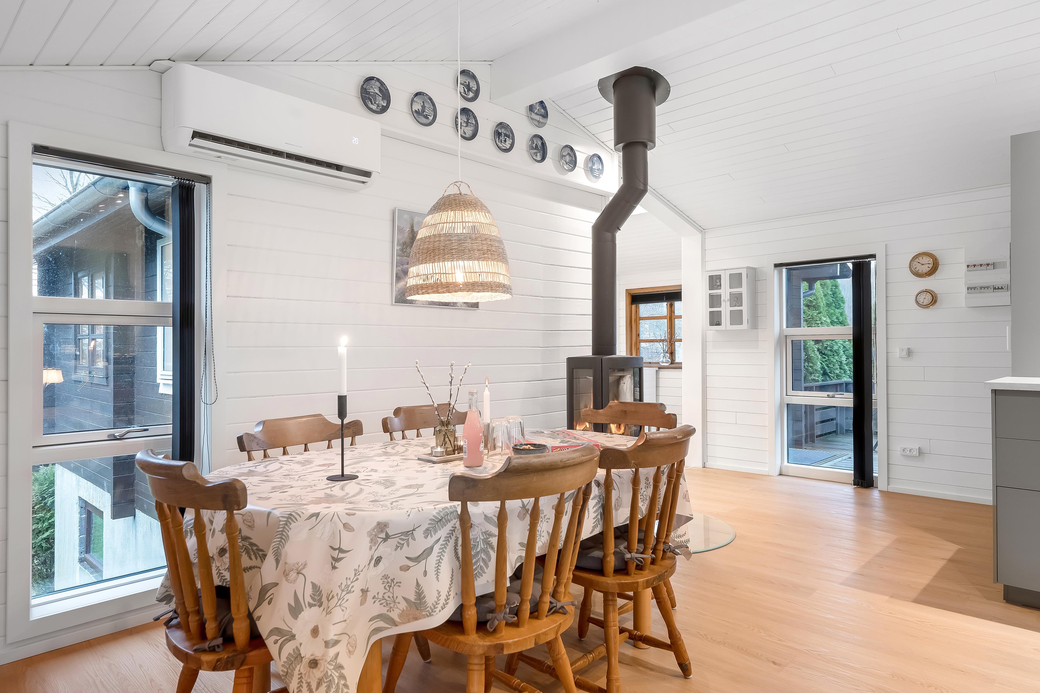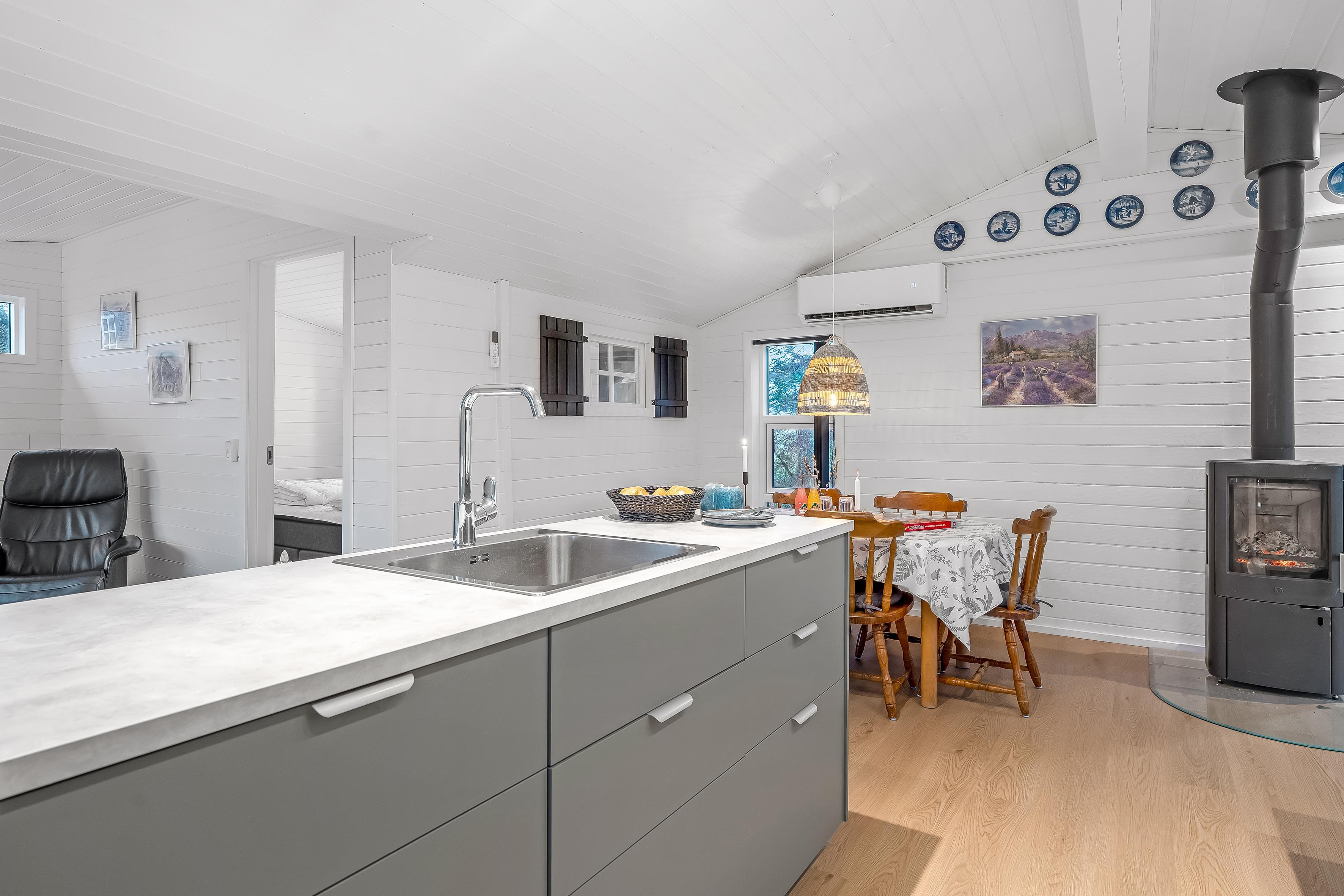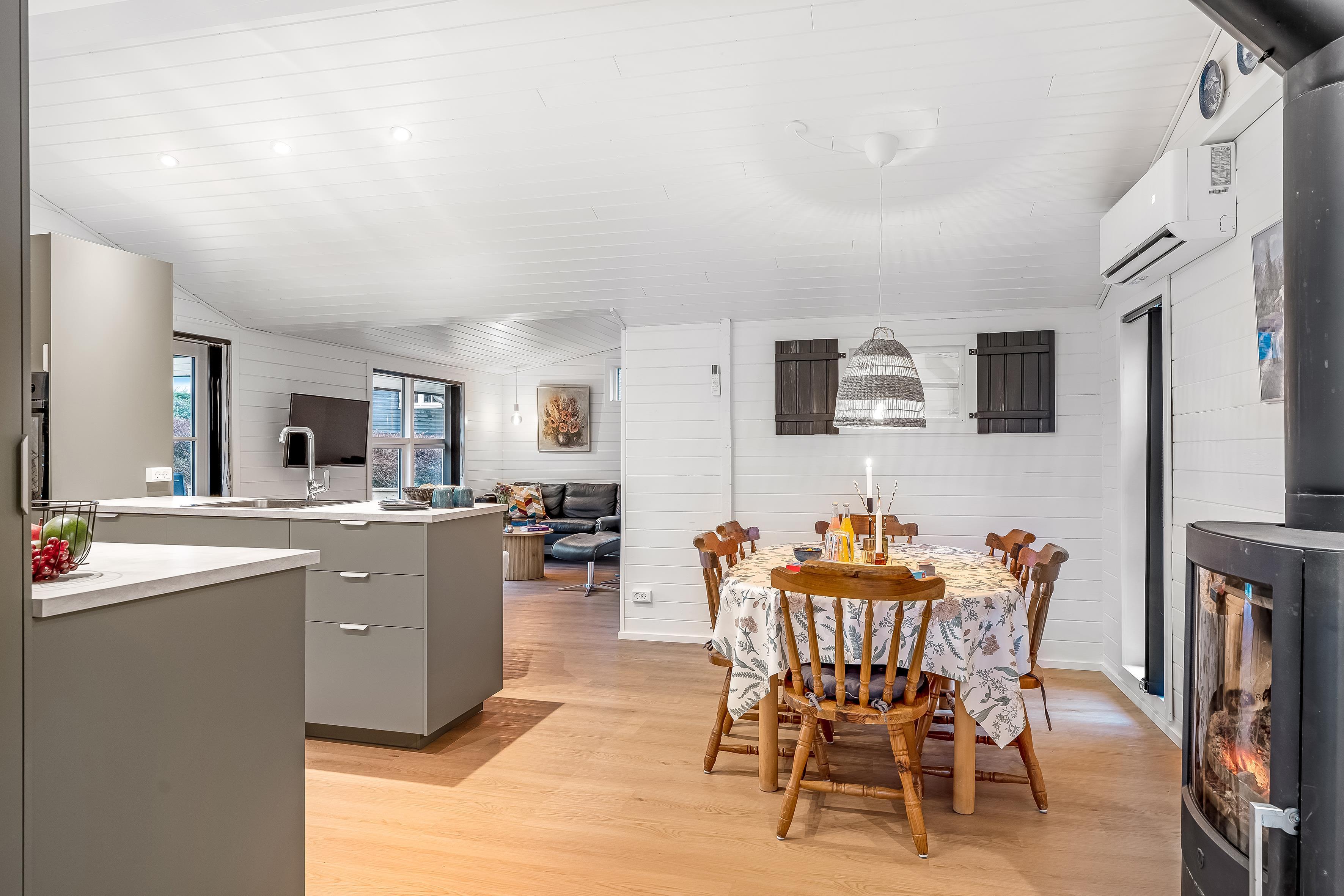 Das Haus verfügt über eine gut ausgestattete Wohnfläche von 92 Quadratmetern und ist ideal für bis zu 6 Personen. Es eignet sich perfekt für Familien oder Gruppen, die gemeinsam Zeit verbringen möchten. Das helle und luftige Wohnzimmer ist mit einem Kaminofen ausgestattet, der an kühlen Abenden für eine gemütliche Atmosphäre sorgt. Für zusätzlichen Komfort sorgt eine energiesparende Wärmepumpe, die auch als Klimaanlage genutzt werden kann, sodass Sie die Temperatur rund um die Uhr nach Ihren Bedürfnissen regulieren können.